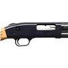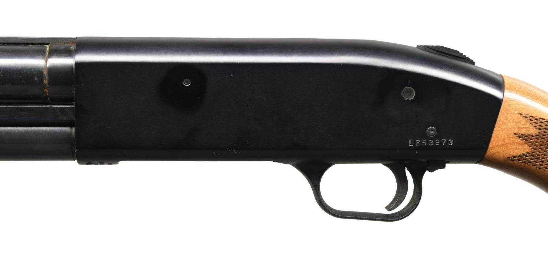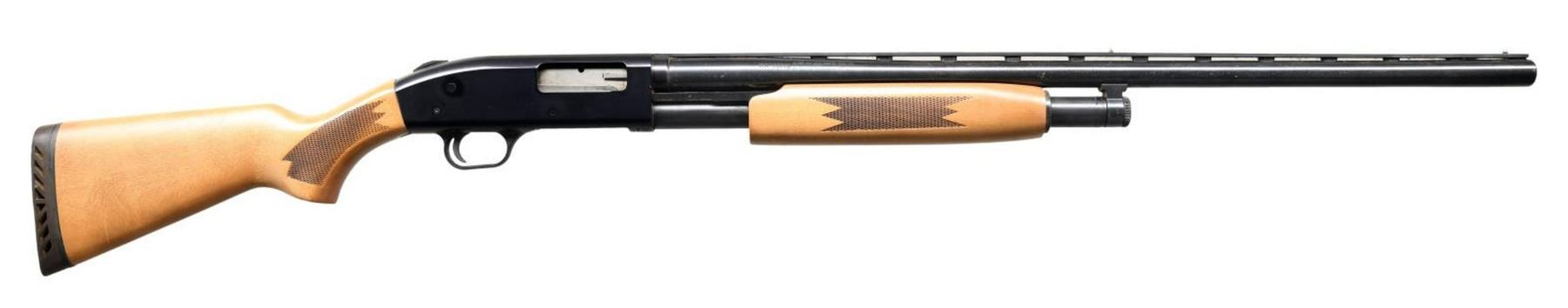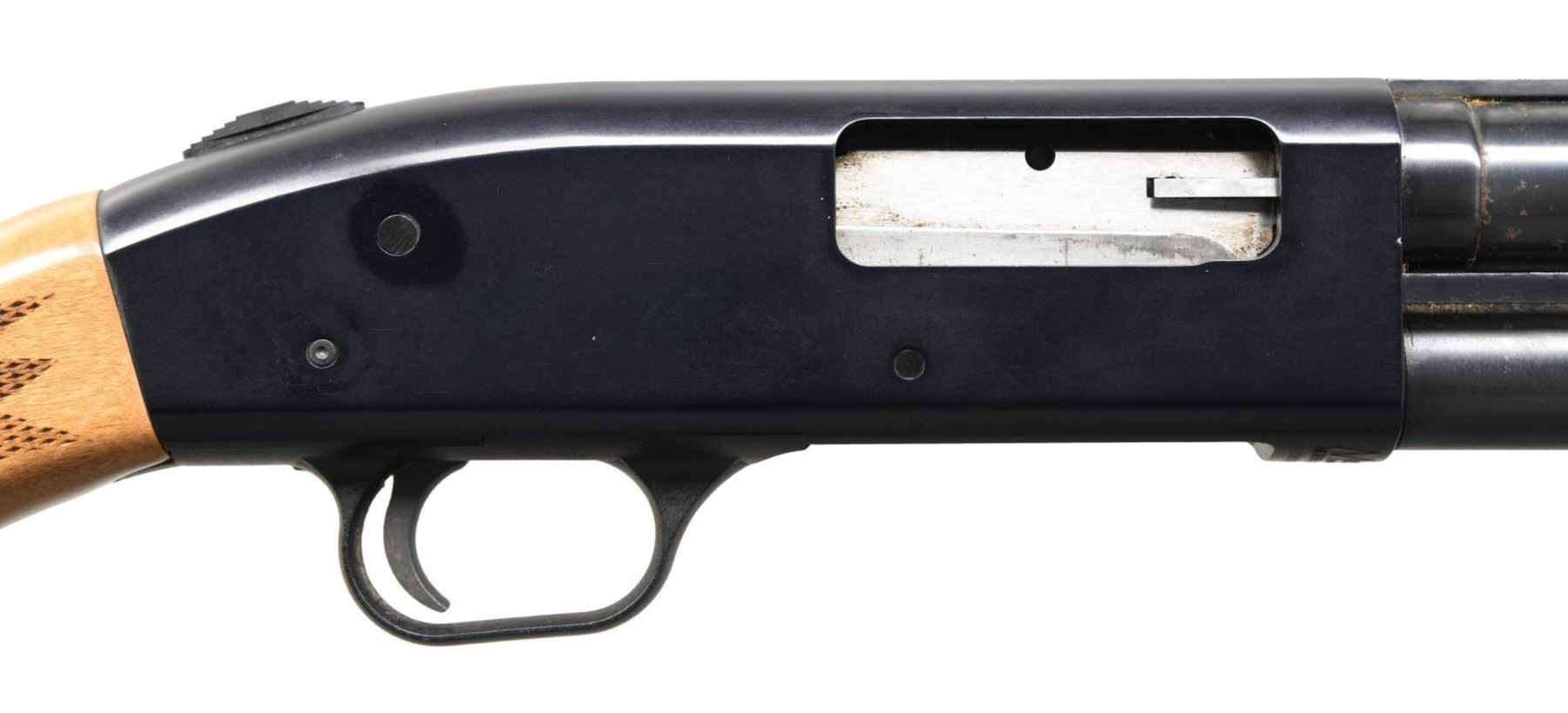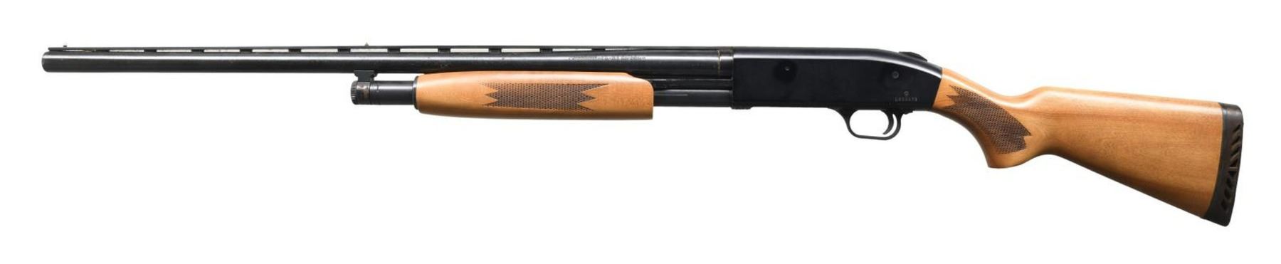 Cal. 12 GA, 2 3/4" & 3". S# L253973. Bbl 28". Model 500A pump action shotgun mfg. by Mossberg. Left side of bbl. with Mossberg trademark logo and cal. designation. Model designation on underside of receiver. Black anodized aluminum receiver, with blued bbl. and mag. tube. Checkered wood pistol grip forend and pump. Vent rib with white plastic bead front sight. CONDITION: metal components retain the majority of their original factory finishes, with the bbl. and mag. tube exhibiting scattered spots of light surface oxidation overall. Mirror bore. Wood furniture shows a few scattered marks from handling and storage, but is otherwise sturdy and serviceable. (23-4831/MLW). MODERN. $150-250.
