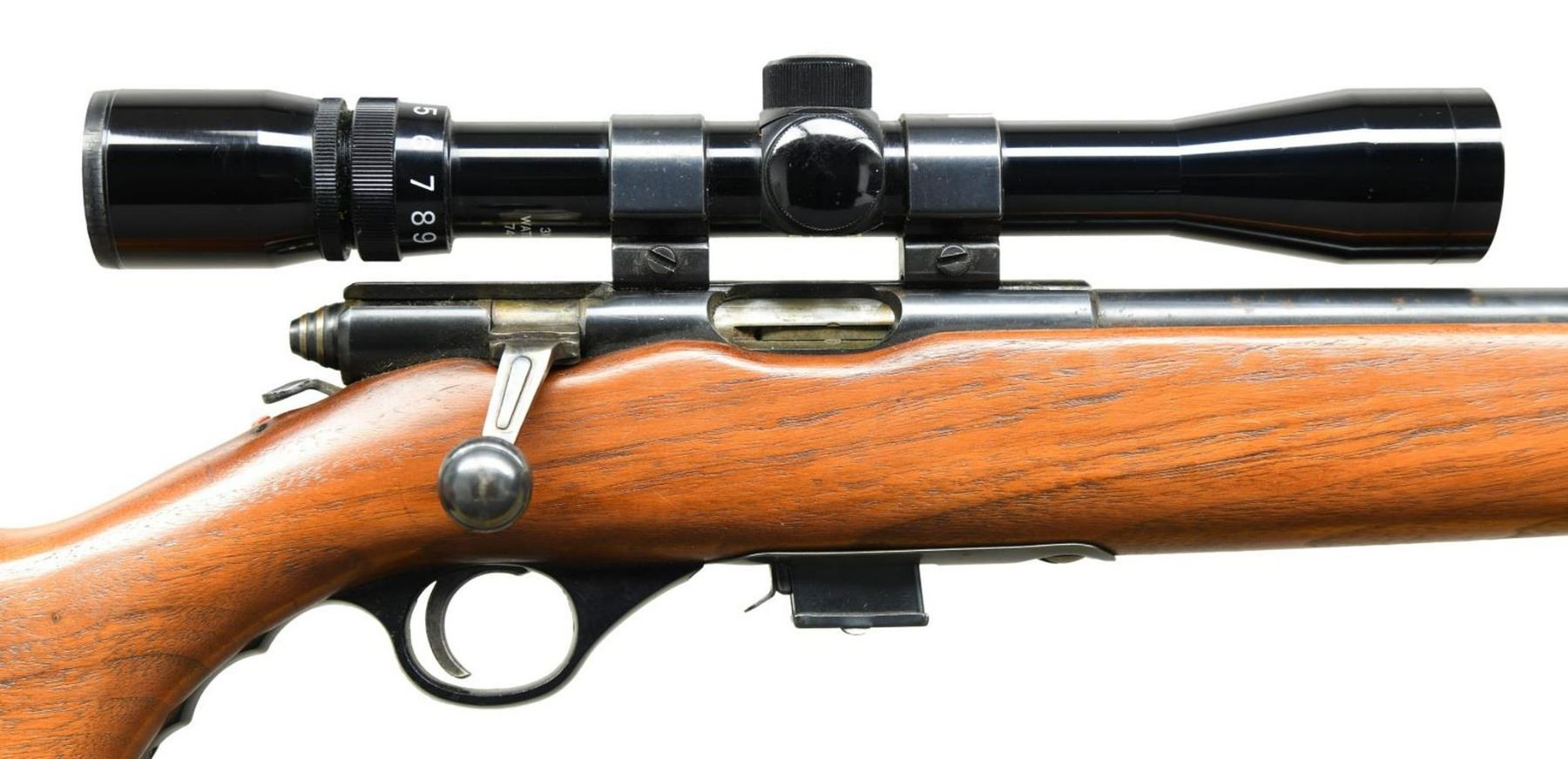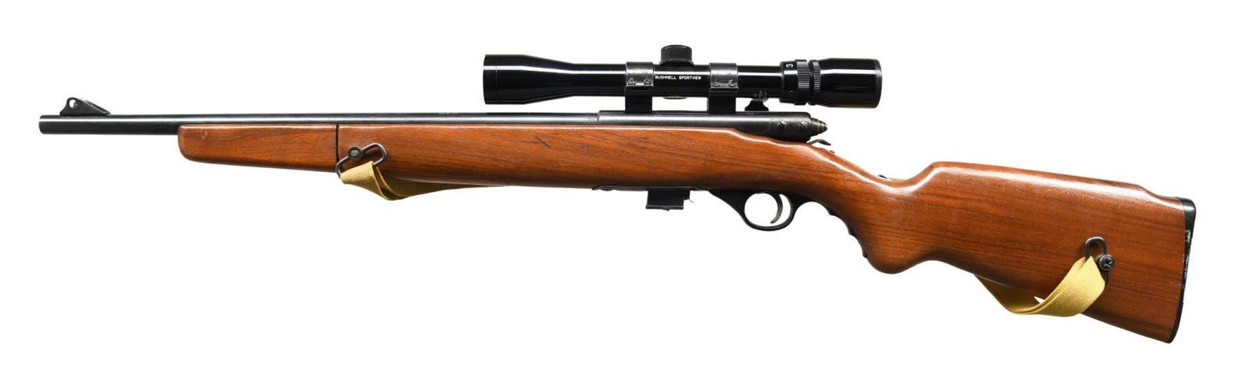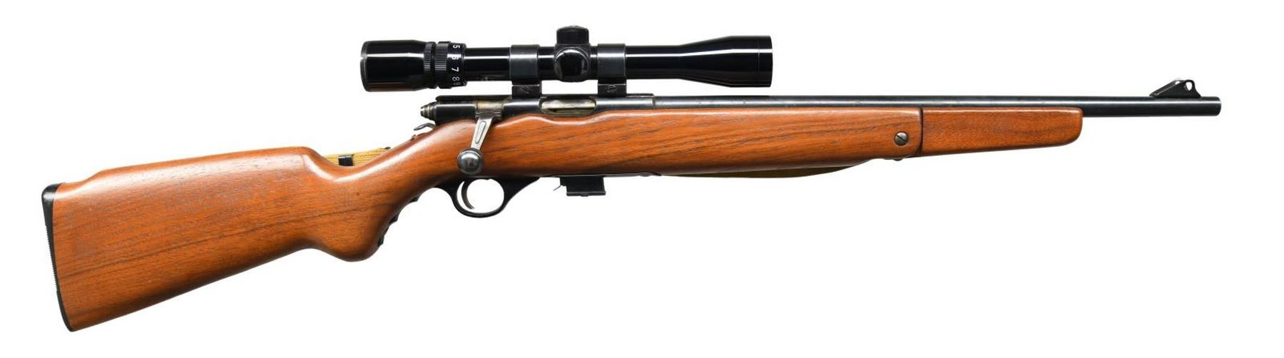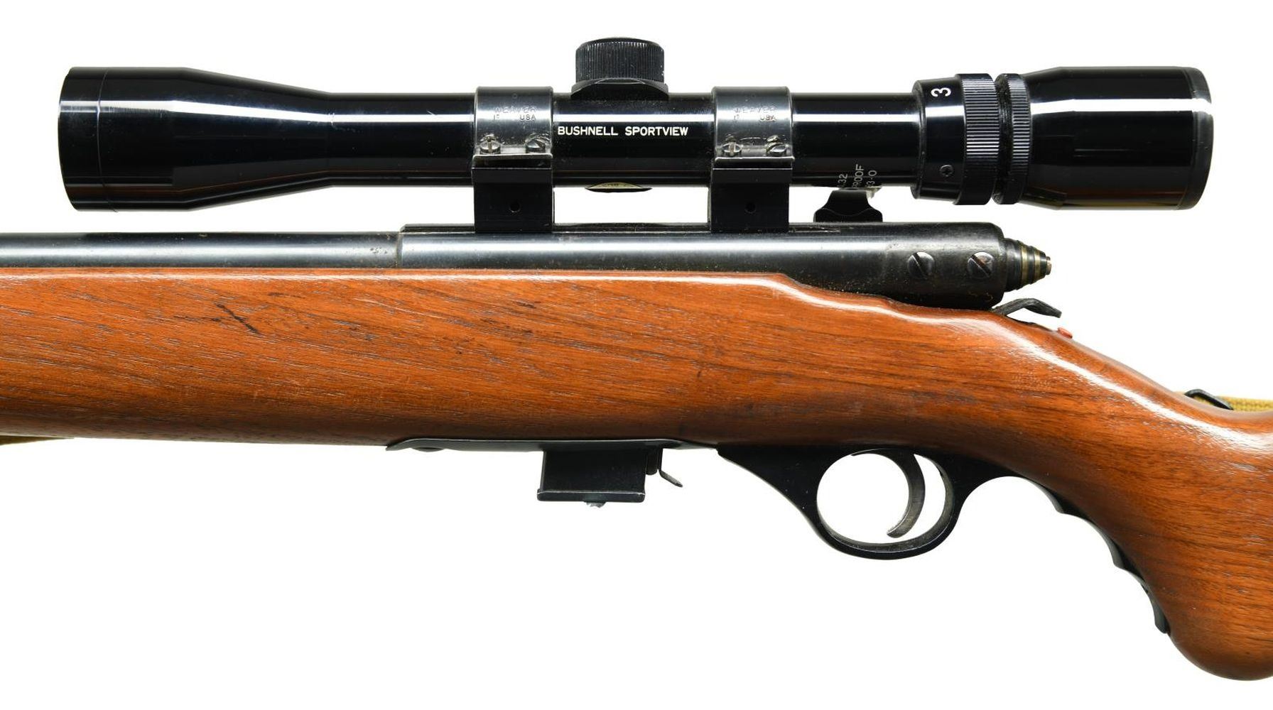 ALL: Cal. 22 S, L, LR. NSN. 1) MOSSBERG MODEL 142-A. Bbl 18 1/2". Model 142-A mfg. by Mossberg. Top of bbl. exhibits Mossberg's mfg. information, as well as the model and cal. designations. Metal components exhibit a blued finish. Plain wood pistol grip buttstock with folding forend that doubles as a vertical grip. Black polymer trigger guard. Receiver is mounted with a Bushnell 3-9x32mm Sportview scope. MAGS: 1-7 rd. CONDITION: metal components retain the majority of their original factory blue finish, exhibiting some spots of wear and thinning, as well as scattered spots of surface oxidation overall. Mirror bore, exhibiting well defined rifling throughout. Stock exhibits some scattered marks from handling and storage, but is otherwise very good. Scope retains a clear optic. (23-4827/MLW). 2) STEVENS MODEL 53B SINGLE SHOT. Bbl 24". Model 53B single shot bolt action rifle mfg. by Stevens Arms Company. Top of bbl. is marked with Steven's mfg. information, as well as with the model and cal. designations. Blued finish with 1 piece wood pistol grip buttstock. Ramp front sight with aperture rear sight. CONDITION: metal components exhibit areas of wear and thinning (primarily on the receiver), with spots of surface oxidation overall. Very bright bore, exhibiting strong rifling throughout. Stock shows scattered handling marks, with small spots of flaking to the varnish overall. (23-4828/MLW). ALL CURIO. $150-275.