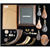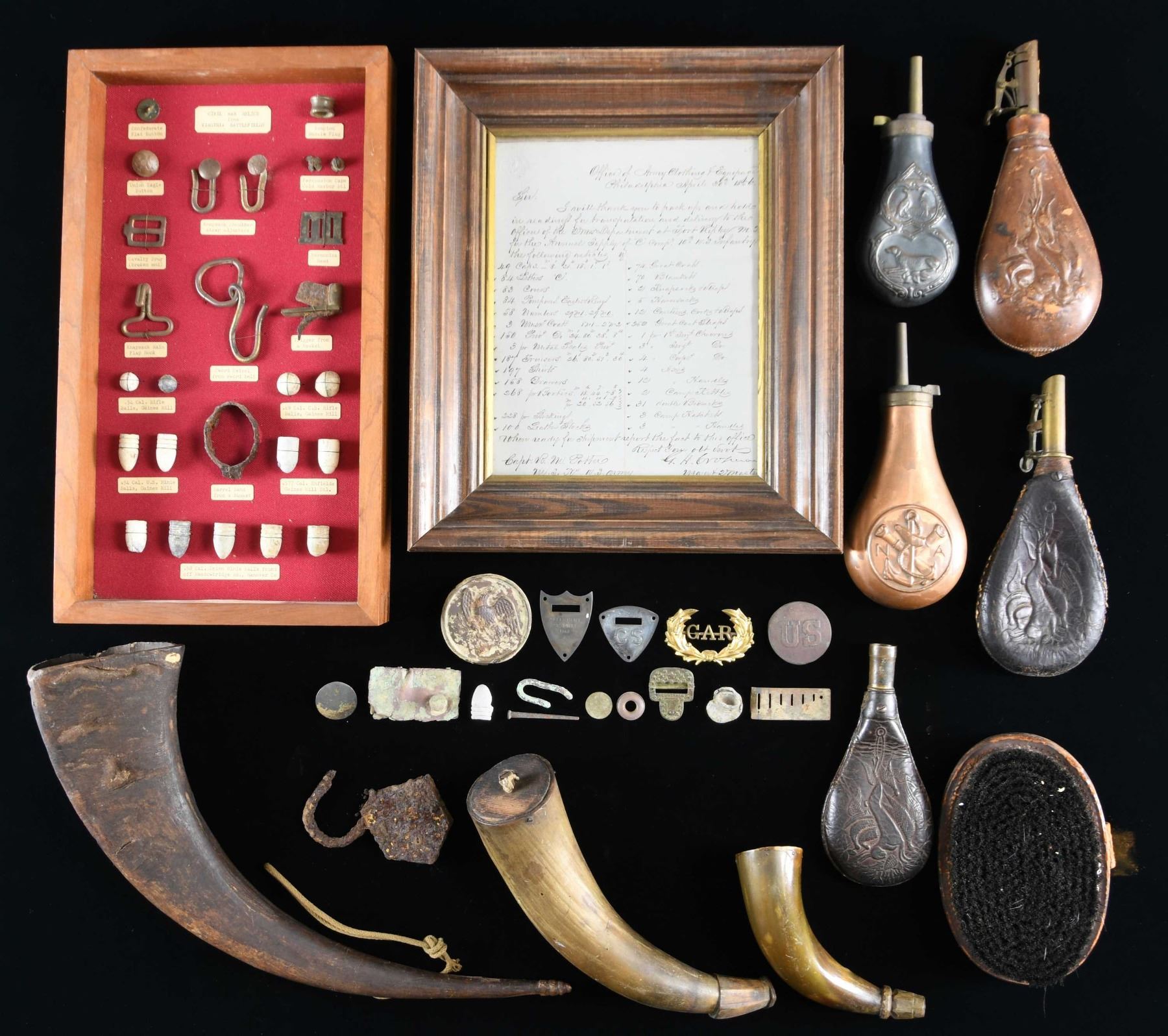 MATERIAL. This varied lot includes 1 frame measuring 16" x 9" containing a variety of excavated relics from various Civil War battlefields in Virginia. The collection includes, but is not limited to, mini balls, round balls, knapsack hooks, an eagle button, percussion caps, a tompion top, and more. / 1 horn, possibly for drinking, measuring approx. 19" in length. / 1 powder horn measuring 11" in length. / 1 powder horn measuring 6 1/2" in length. / 1 saddle shield marked "ALLEGHENY ARSENAL 1861" of questionable age. / 1 CS saddle shield of questionable age. / 1 GAR cap badge. / 1 Small group of excavated artifacts from the Fredericksburg battlefield. / 1 Small group of excavated artifacts from Tullahoma, TN. / 1 excavated cross belt plate from the Gettysburg battlefield. / 1 excavated bridle rosette and flat button. / 3 leather shot pouches. / 1 "Navy Arms" powder flask. / 1 sporting powder flask. / 1 supply request form, dated 1856, for Fort Ripley and the 10th US Infantry. / 1 post-Civil War cavalry curry brush. CONDITION: excavated artifacts have expected crusty patinas and oxidation; other items generally show light to moderate wear. (02-23775/BF). $250-400.