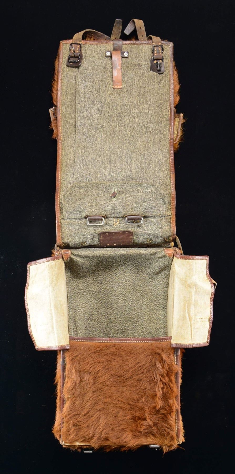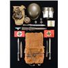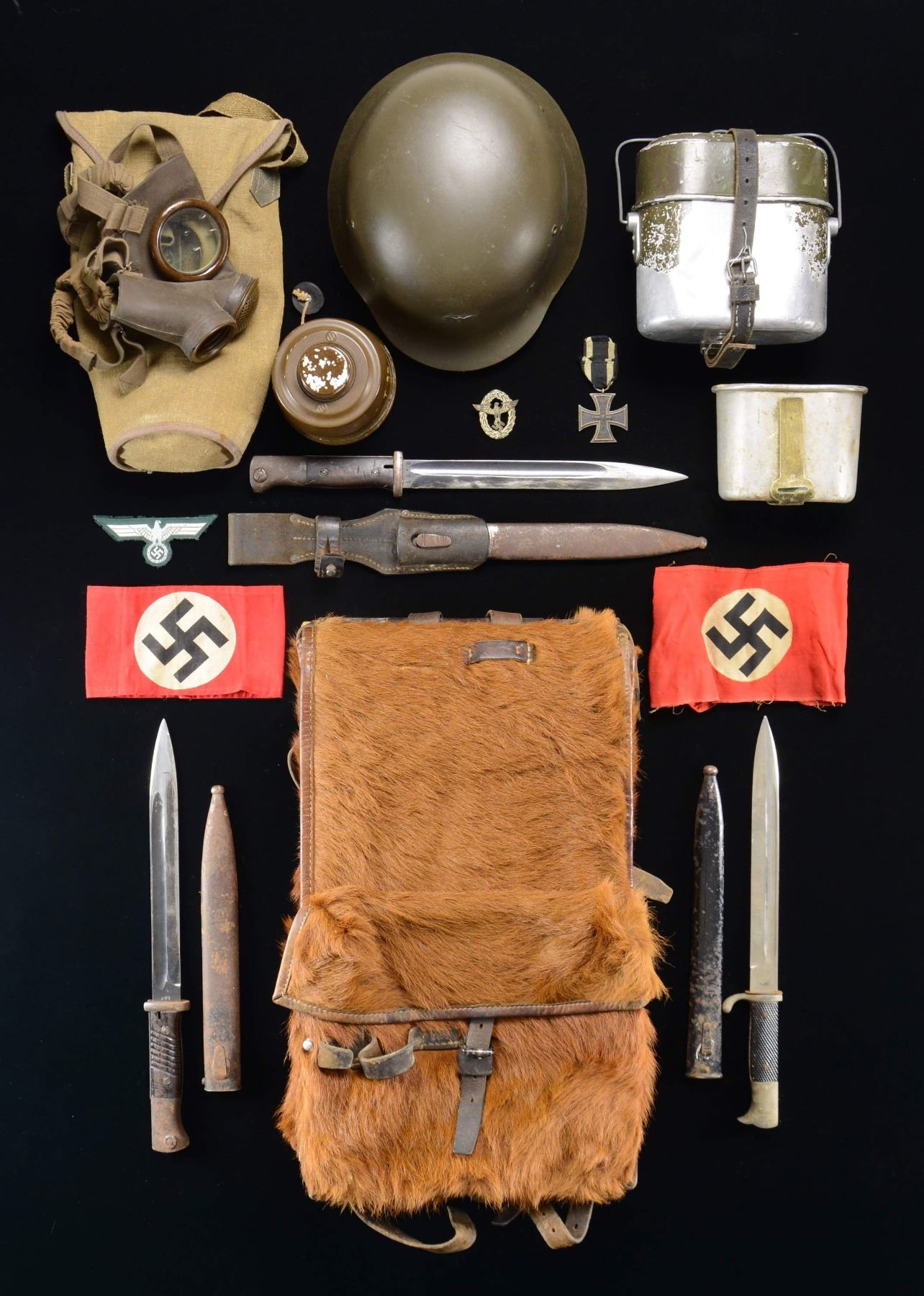 This varied lot includes 1 post-WWII German-style helmet with a cap badge clip on the front. Helmet has a brown leather, 3-pad liner with a brown leather chinstrap. / 1 WWII German mess kit with leather closing strap. / 1 Italian WWII gasmask with canvas carrying pouch. / 1 Mauser K-98 bayonet, scabbard, and frog. Wooden two-piece grip, non-matching numbers, and sharpened blade. / 1 German dress bayonet with the blade marked "C. GUSTAV SPITZER SOLINGEN". Two-piece composite grip. Black enameled iron scabbard. / 1 German aluminum canteen cup. / 1 German-style pony fur backpack with associated straps. / 1 Mauser K-98 bayonet with matching numbered scabbard and two-piece composite grips. Scabbard shows extensive oxidation. / 1 WWI German 2nd Class Iron Cross with a portion of the original ribbon. / 1 Army NCO cloth and bullion breast eagle. / 1 Early style police eagle and wreath cap badge. / 1 Fully printed, small size party armband. / 1 Small party banner with a printed black party symbol on a white circular disc, all on a red field. CONDITION: items generally show light wear, except as noted above. Mess kit has lost much of its finish. Both K-98 bayonets show evidence of some sharpening and oxidation to the scabbards. Small party banner has raw edges. (02-22797-10/BF). $500-700.
