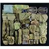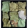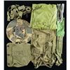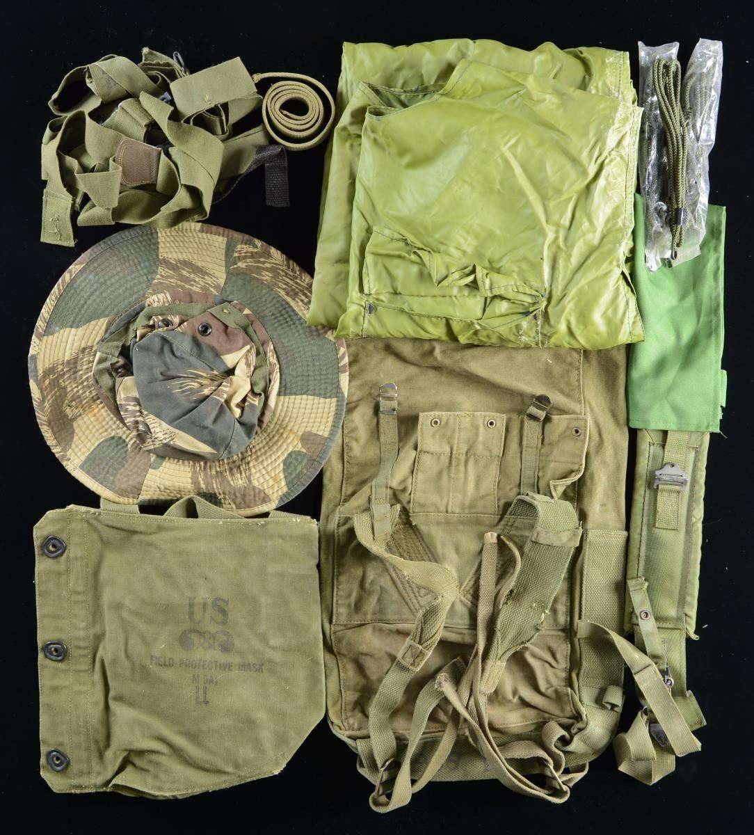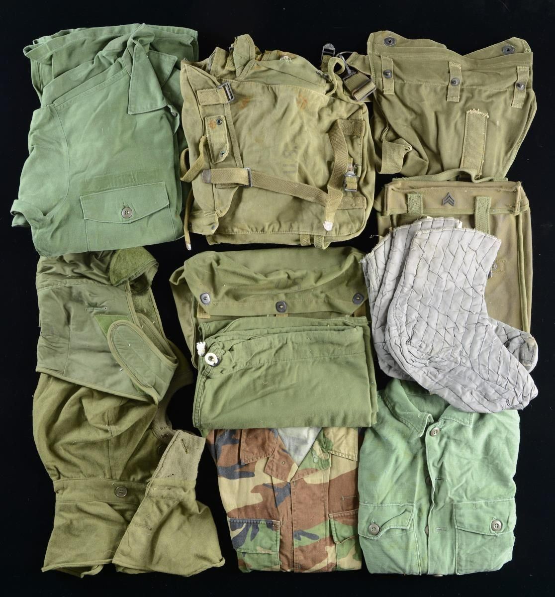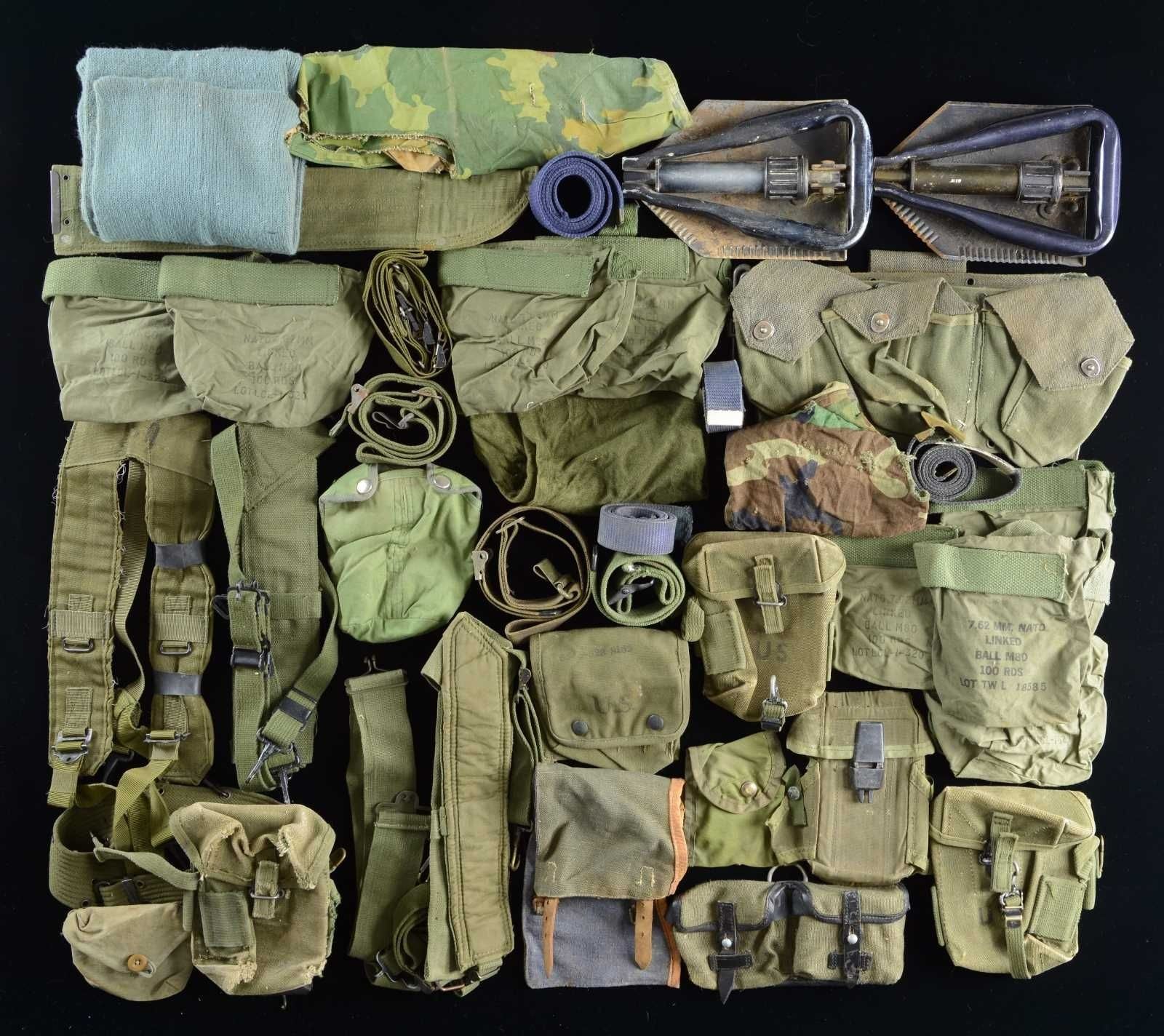 This large lot includes 2 OD, M9A1 field protective mask bag. / 1 OD pouch, likely for maps & documents. / 2 Small OD backpacks. / 1 OD tool pouch. / 1 OD storage bag. / 2 OD fatigue shirts. / 4 Insulated boot liners. / 1 OD cold weather hood. / 1 OD pouch for a lightweight service mask. / 1 Detachable, wool, cold weather hood. / 4 Blue cotton webs belts. / 1 Green bib-type scarf. / 1 Camouflage fatigue shirt. / 2 Camouflage helmet covers. / 2 Folding, all metal entrenching tools. / 1 Air Force scarf. / 1 Camouflage Boonie hat. / 1 OD machete scabbard. / 8 Bandoleers of the Vietnam era for an M60 machine gun. / 1 BAR cartridge belt with 6 pockets. / 3 M14 cartridge pouches. / 1 Pair of waterproof, field green coveralls with blue straps. / 1 Wool helmet liner. / 1 OD canteen cover. / 1 Padded, left-handed shoulder strap. / 1 German cartridge pouch with a single clip. / 9 Various straps. / 1 Khaki web belt. / 3 OD lanyards. / 3 Over-the-shoulder padded strap sets. / 1 OD cotton pistol belt with M14 pouch. / 1 Small OD bag. / 1 WWII clip pouch. / 1 WWII German K98 action cover. / 2 Small OD compass pouches. CONDITION: all items generally show light wear. A few of the older pouches show moderate wear. (02-19688/BF). $250-450.