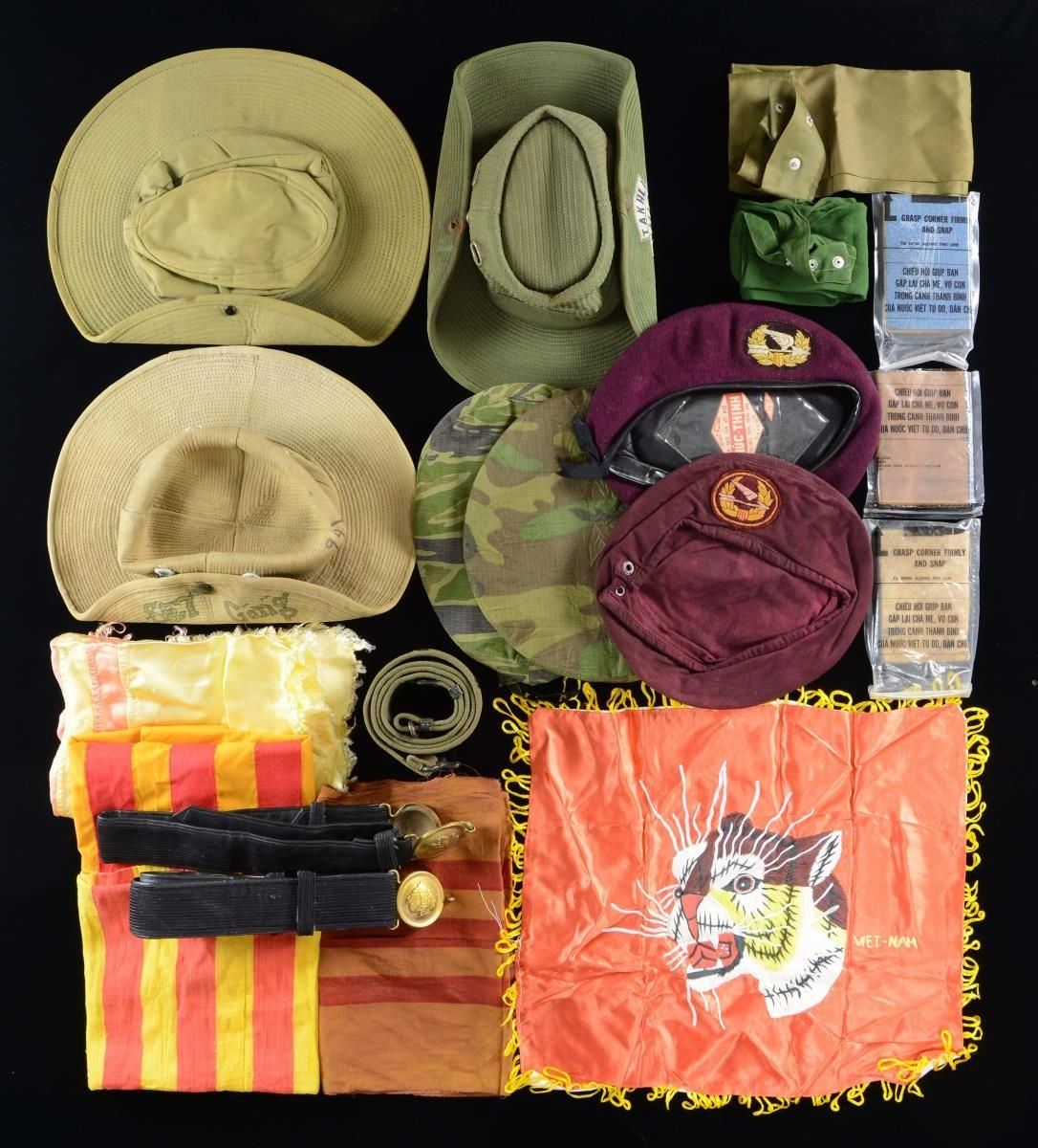 ITEMS. This lot consists of 1 South Vietnamese camouflage rip-stop beret with printed Vietnamese label inside. / 1 Folded side OD bush hat with patches on the side that read “TAKHLI THAILAND”. / 1 South Vietnamese 28” x 21”. / 1 Tattered & blood stained South Vietnamese flag measuring approx. 27” x 18”. / 1 Cotton South Vietnamese flag measuring 35” x 20”. / 1 Heavily stained South Vietnamese flag measuring 28 1/2" x 12”. / 1 Faded red beret with a South Vietnamese patch on the front. / 1 South Vietnamese camouflage rip-stop beret with a metal crossed cannon & flaming bomb insignia. Beret has a printed South Vietnamese label. / 1 Maroon South Vietnamese Officer's beret with a bullion South Vietnamese insignia on the front, and a paper Saigon label. / 1 Silk souvenir pillow cover with a tiger and the word “VIETNAM”. / 2 South Vietnamese Army Officer's belts. / 1 OD field hat with one side turned up. / 1 Khaki field hat with “SAT CONG” on the side and on the underside. / 1 Pistol belt. / 1 Green dickie. / 1 OD dickie. / 2 South Vietnamese wallets. / 2 South Vietnamese notebooks. CONDITION: items generally show light to moderate wear except as noted. (02-20930/BF). $600-900.