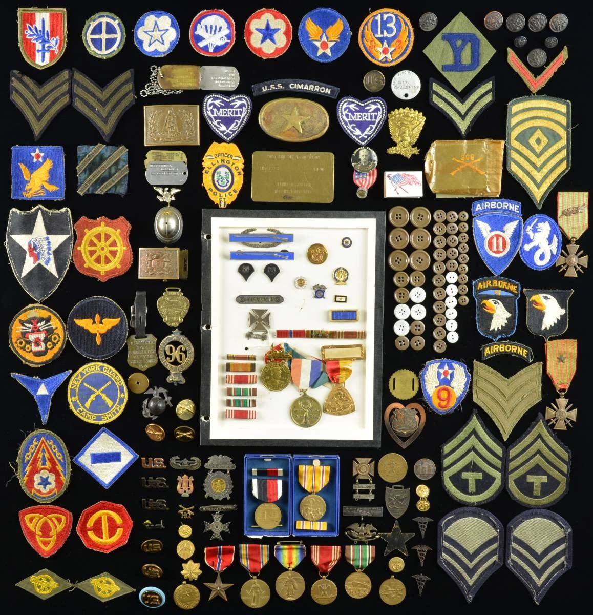 1) PATCHES, WWI GROUP & MEDALS. Approximately 49 US Military & related patches. / 2 WWI era French Croix de Guerre medals. / 1 Small group containing 8 buttons, 1 collar disc, 1 Yankee Division patch, 1 overseas stripe, and 1 dog tag for “REX. J. DOW. CORP. CO.M.103.INF.” CONDITION: all items show light to moderate wear. (02-16894/BF). $200-400.
