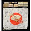 ITEMS. This lot contains 1 Hinomaru-style silk prayer flag, measuring approx. 31" x 28 1/2". / 1 Hinomaru-style silk flag, measuring approx. 42" x 29". / 1 Small rising sun flag on a bamboo stick, measuring approx. 4 1/2" x 6 1/2". / 1 Nationalist Chinese flag, measuring approx. 30 1/2" x 43". / 1 Paper and bamboo hand fan with numerous Japanese characters and a central mountain scene. / 1 Pair of chopsticks. / 1 Rubberized canvas folding case with Japanese characters. / 1 Small twist-top box holding what appear to be pipe filters. / 1 Naval officer’s cap badge. / 1 Pinback button with a rising sun flag motif. / 1 Silvered US military officer’s cap badge. / 1 Sterling US Navy "E" badge. / Approx. 8 Japanese bank notes and occupation notes. / 1 Japanese military postcard. CONDITION: items generally show light wear. Flags are in particularly nice condition. (02-22967-7/BF). $400-600.