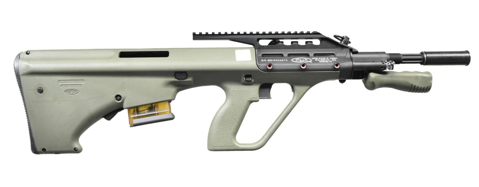 Cal. 223. S# 600-P006879. Bbl. 16". The MSAR is an American mfg. gas operated semi automatic Bullpup, very similar in aesthetics to the Steyr AUG. In true Bullpup fashion, the operator has the ability to utilize a long bbl. to take advantage of available ballistics w/ out sacrificing negative aspects of having a full-sized rifle. Due to the placement of the action, which is under the cheek of the shooter, the bbl. extends forward from that point, where it is typically above the trigger creating a much smaller signature. The stock or chassis is green molded plastic. Small section of the bbl. that is actually exposed is a combination of flutes & microgrooves for expedient cooling by increasing the surface area. Muzzle brake is a proprietary design, often referred to as a tulip. 7 1/2" Numbered picatinny rail section above trigger for optic mounting. Like all MSAR designs, it includes a retractable vertical pistol grip. Microtech Small Arms Research started production in 2005 & continued until 2015. They are now continuing their popular knife line. MAGS: 1-10 rd. CONDITION: all outward appearances indicate this firearms is in new or as new condition. Still retains factory muzzle cap. Finish is complete w/ full coverage still enjoying its factory matte black appearance. Bore is shiny w/ good rifling & fire control group appears to function correctly when cycled by hand. (22-251/JZ). MODERN. $1,000-1,500.