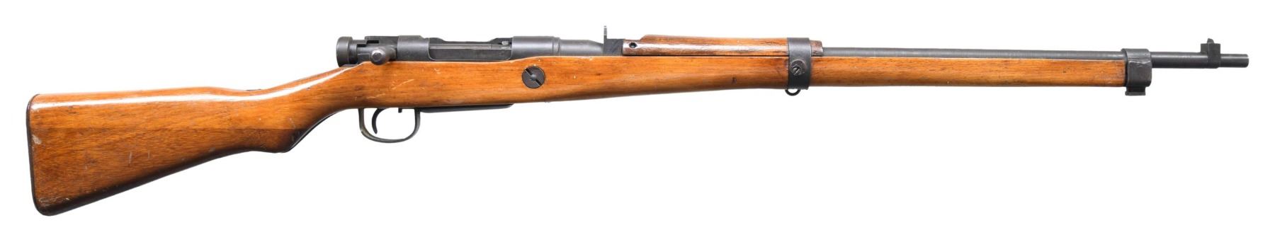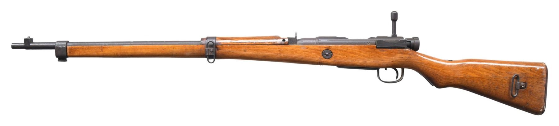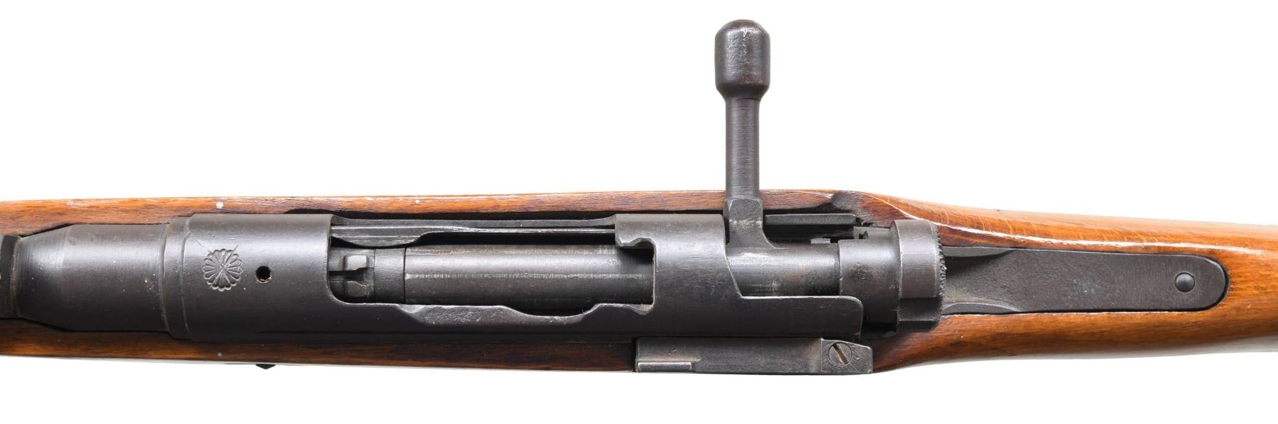 Cal. 7.7 Jap. S# 28263. Bbl. 25 1/2". Blade front sight without protective ears. Fixed aperture rear sight. Bolt parts are mismatched & bayonet lug is correctly unnumbered. Receiver top has mum with "X" marking across it. Left side of receiver has Nagoya & what appears to be a 10th series marking. Late war blued finish. Asian hardwood stock with separate forend & left side sling swivels. CONDITION: refinished stock has added varnish with some dings, light gouges & handling marks. Metal retains 90% late war blue with scattered storage oxidation. Bright very good bore. (25-2210/MJC). CURIO. $150-225.