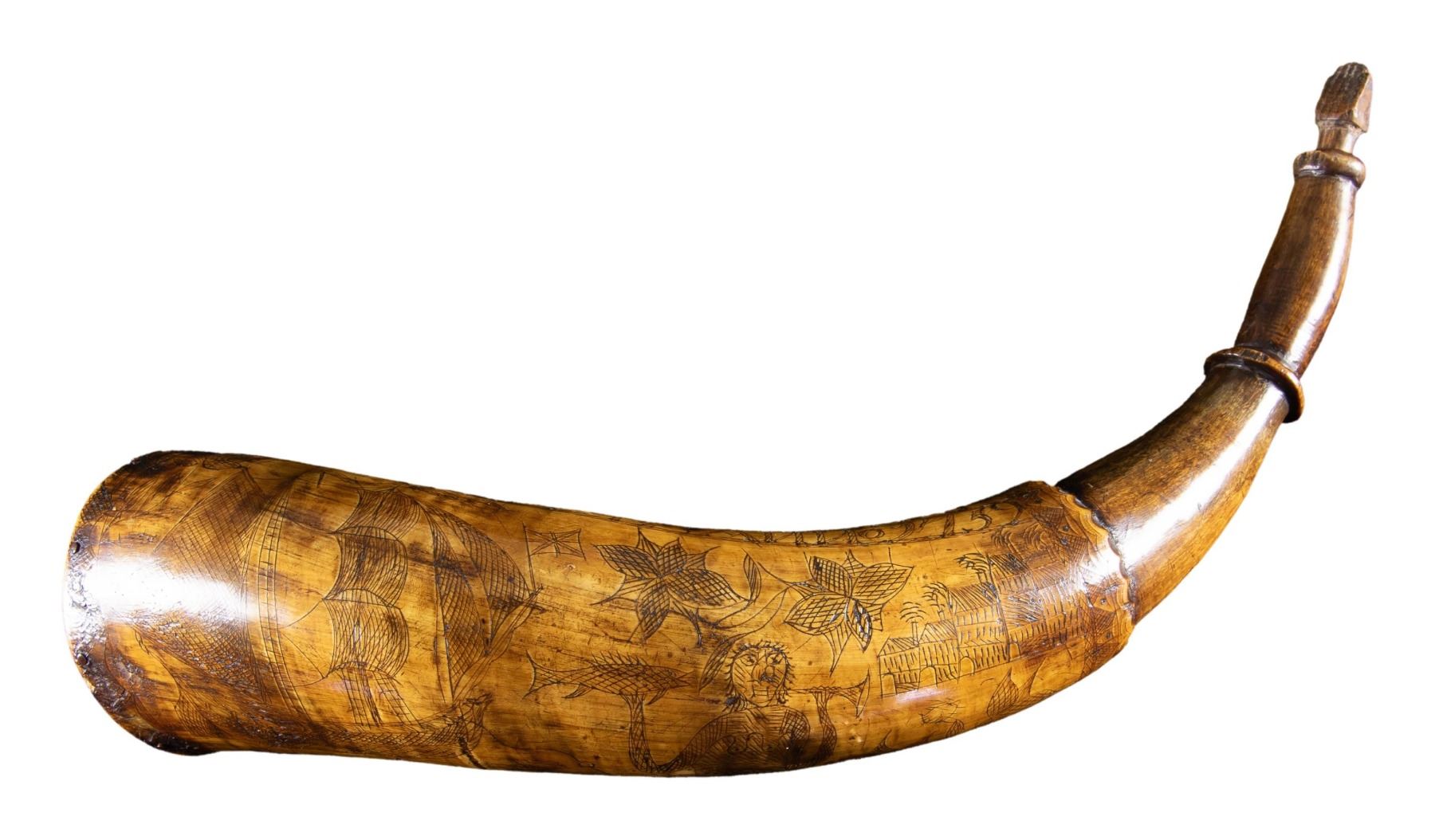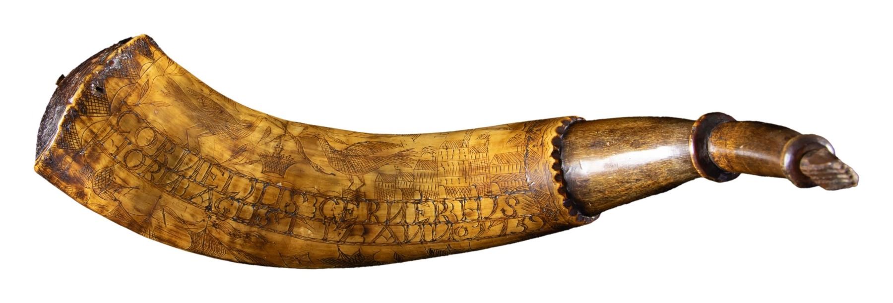 12" nicely patinaed fully scrimshawed horn "CORNELIUS CERNER HIS HORN AGUST 17 1759", large sailing ship with British flag, mermaid, buildings, birds, and more. CONDITION: good to very good overall, clear decoration, old varnish. PROVENANCE: The Esteemed Norm Greenberg Collection. (02-24847-2/JS). NON-GUN. $3,000-5,000.