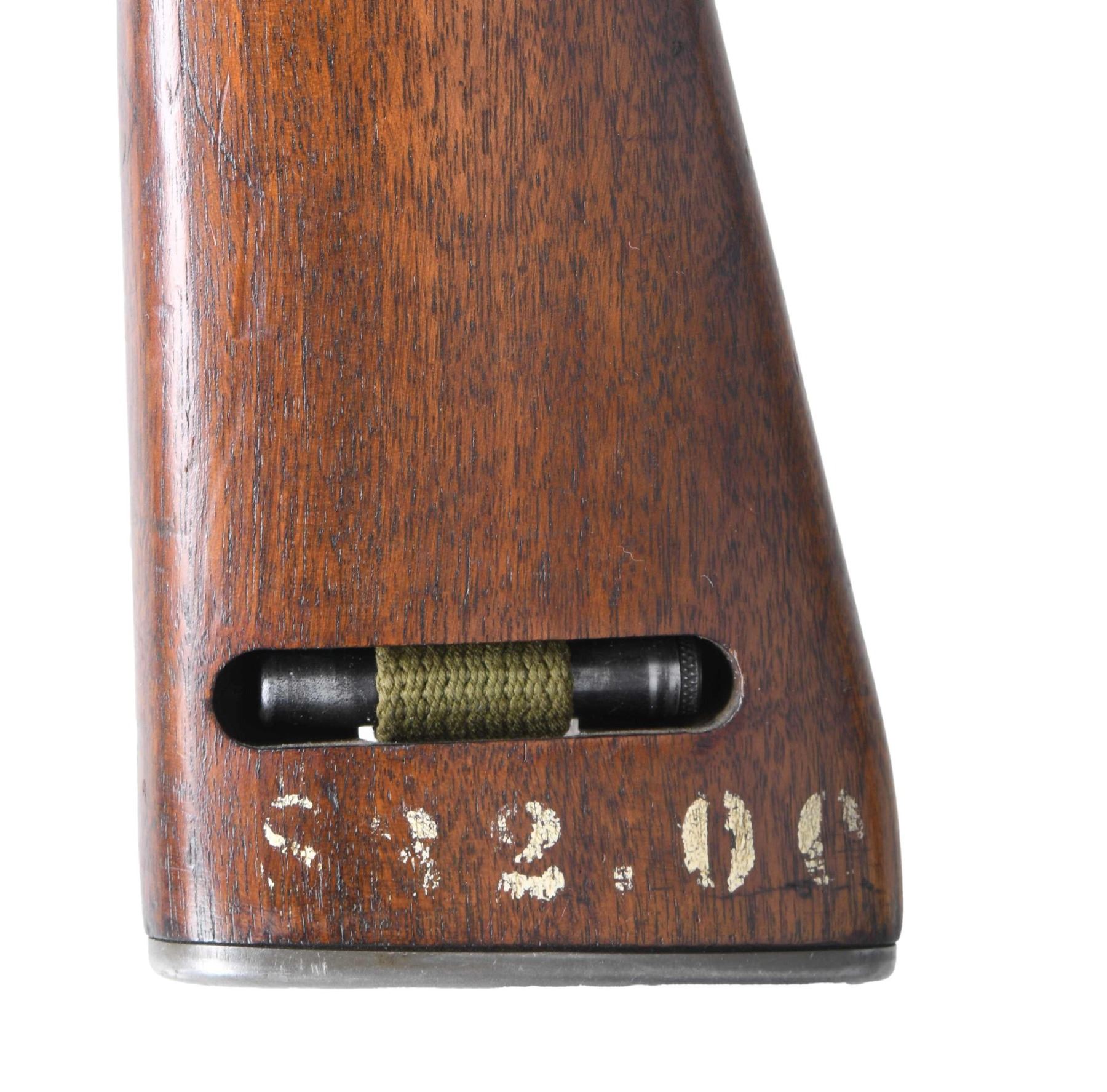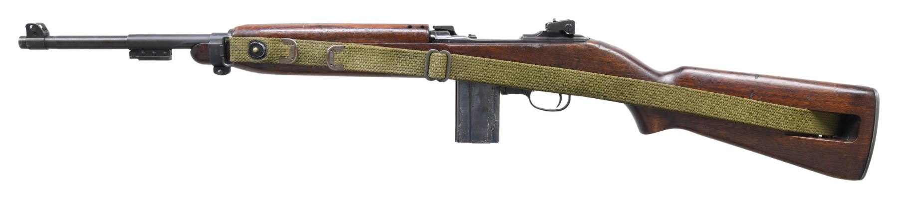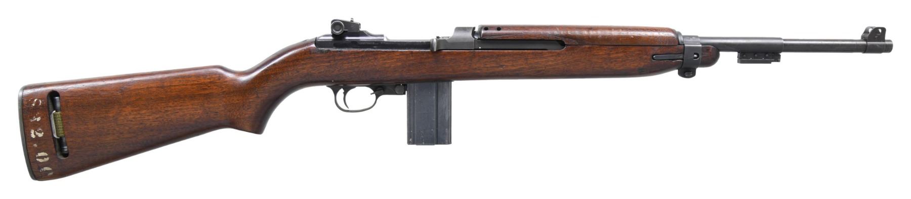 CARBINE. Cal. 30 Carb. S# 203402. Bbl.18". Produced from about 1960 to the mid- 1970's these carbines used as many G.I. parts as possible except receivers. The carbines were reputedly used by some prisons and police departments. Adjustable aperture rear sight marked "PI". Blade front sight marked "N". Barrel band w/ bayonet lug marked "MMQ". 6-O'clock slide marked "PI". Flat bolt. Milled "Inland" trigger housing. Rotary safety. Mag catch w/ 30 rd. mag. extension. Walnut stock set. Low wood oval cut buttstock. Marked on left side with boxed "BA / JPL" Benicia Arsenal rebuild mark and marked in sling slot "LW". Red painted rack number "83" at end of grip and white number "S 32.00" on right side of butt. Unmarked 4-rivet handguard. Green web sling. MAGS: 1-15 rd. Military issue. CONDITION: stock set has moderate wear and handling marks w/ arsenal rework finish. Metal retains a mix of National Ordnance blue finish and arsenal rework Parkerization with light wear and handling marks. Bore has strong sharp lands w/ light frosting in grooves. PROVENANCE: formerly of the estate collection of Charles Wagner. (25-3364/RW). MODERN. $500-800.