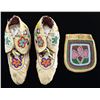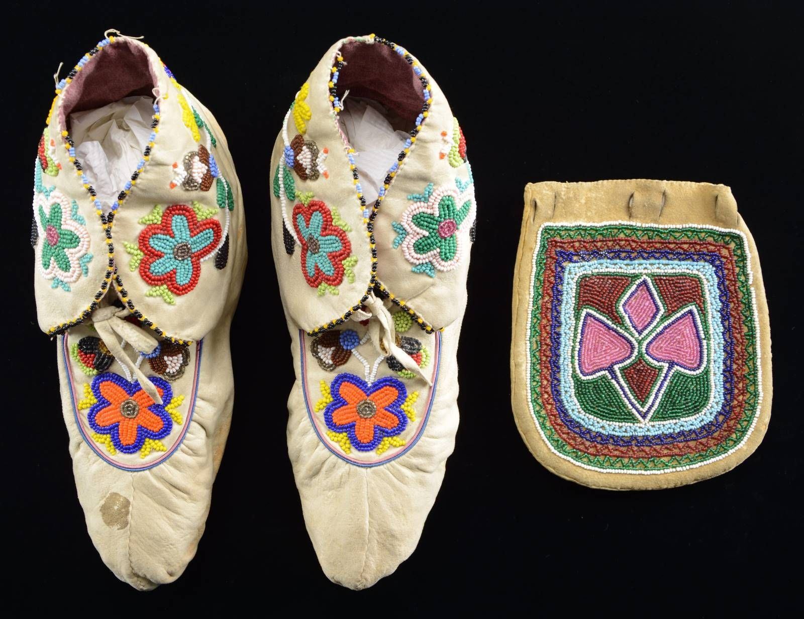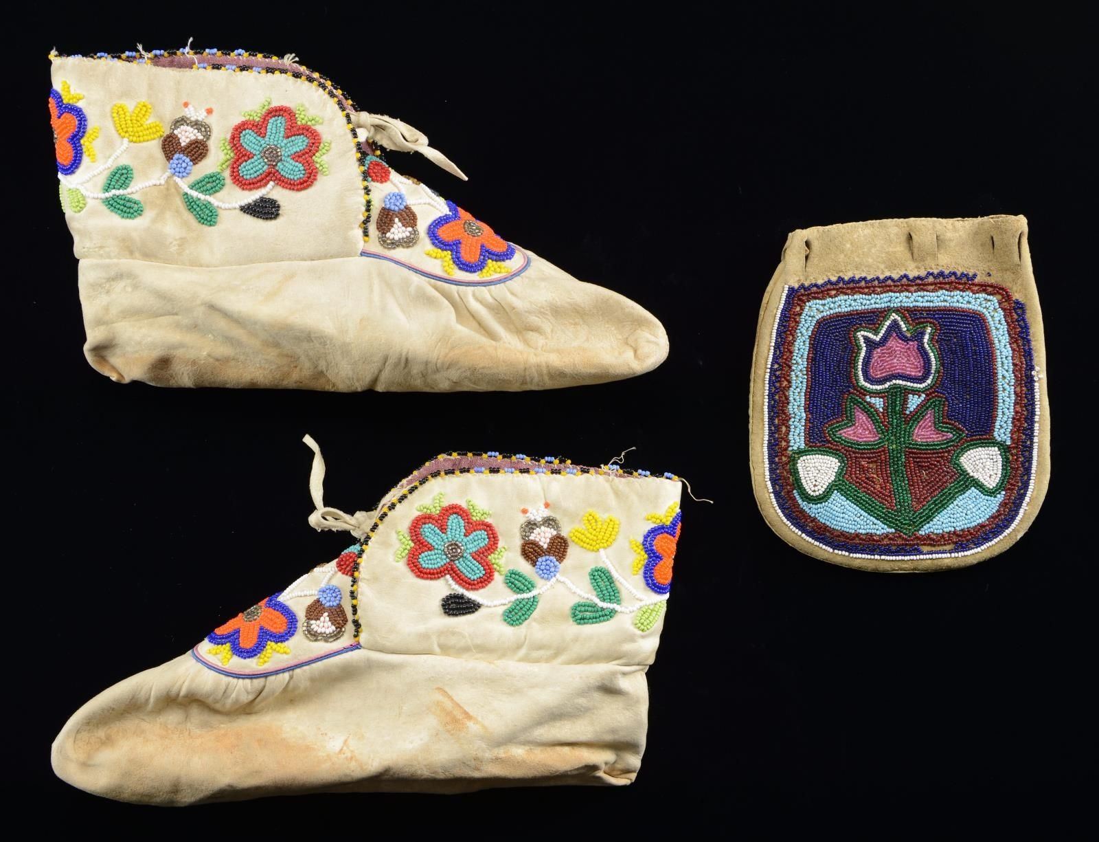 POSSIBLE BAG. 6.5" x 5.5" double sided bead decorated leather pouch with different floral designs in Great Lakes style, thread sewn in beautiful dark blue, red, green, turquoise blue, and pink palette; 9" soft sole thread sewn beaded moccasins, purple lined tops. CONDITION: good overall. PROVENANCE: Martin Lane Historic & Western Americana Lifetime Collection. (02-22012/JS). $400-600.