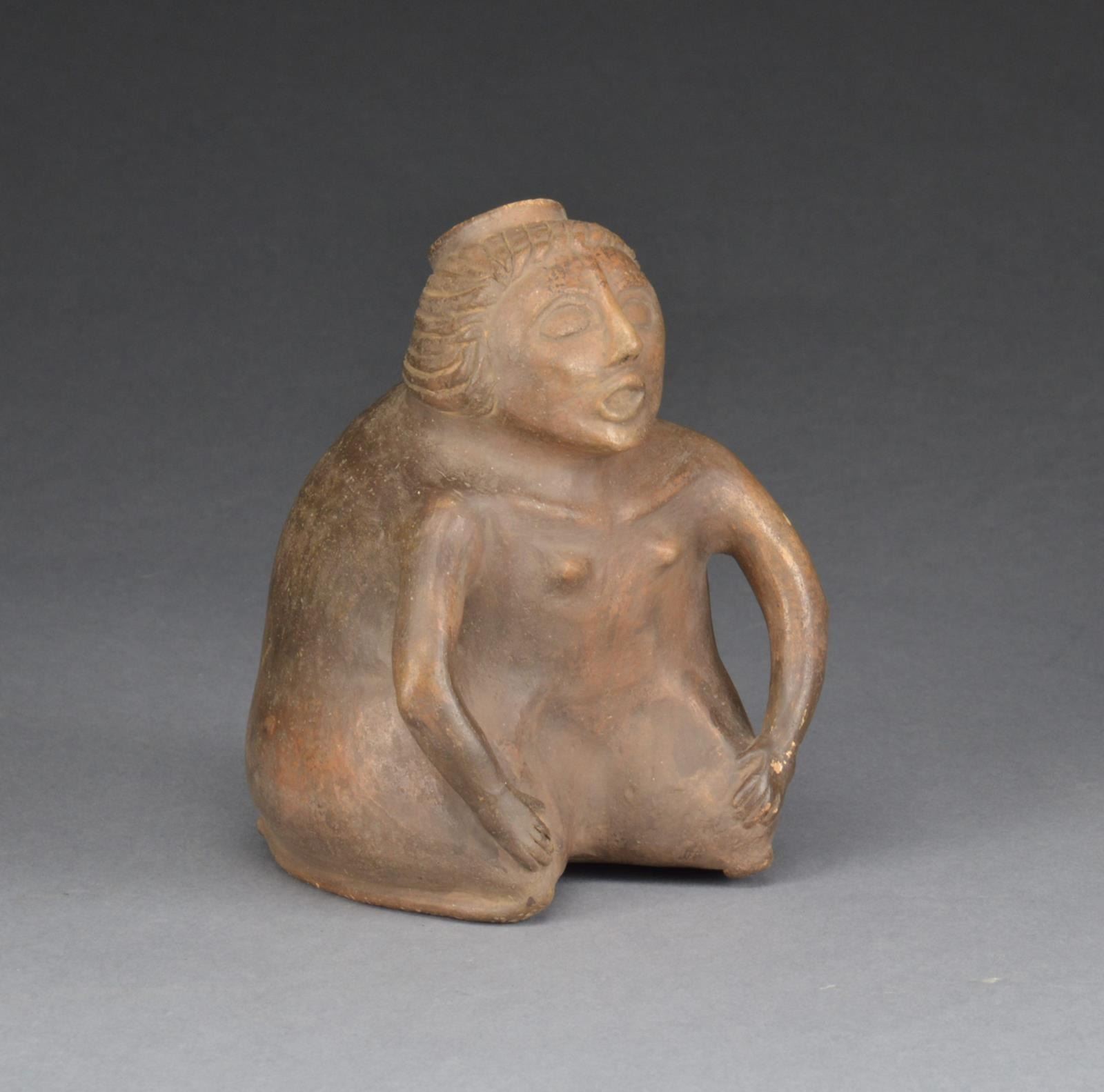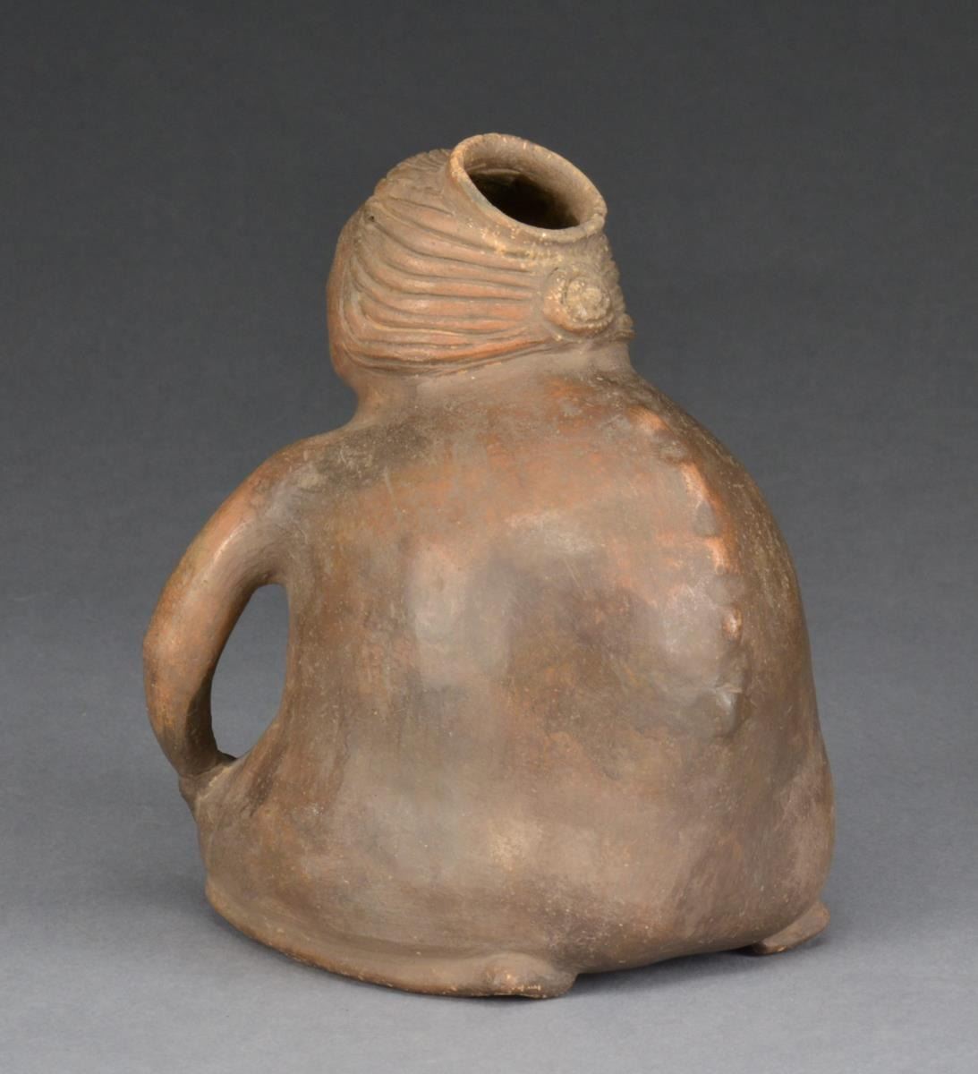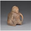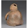 This pot or bottle appears to have the features of a woman w/ a tilted spout at the top of the head. She is sitting w/ her legs folded under her & hands on her knees. She has a pronounced ridged spine. Capacity of the bottle appears to be a little over a quart. Bottle measures approx. 6” x 6” & 8” high. It is made of a low fired earthen colored clay. This effigy bottle has not been dated by an expert in Native American culture through scientific means. CONDITION: by gently tapping the bottle we have determined there is a repaired crack, likely in or near the base of the bottle. Upon visual inspection, the crack cannot be seen. Facial features remain sharp. There is wear around the spout & on the base of the bottle. (02-14017/BF). $800-1,500.