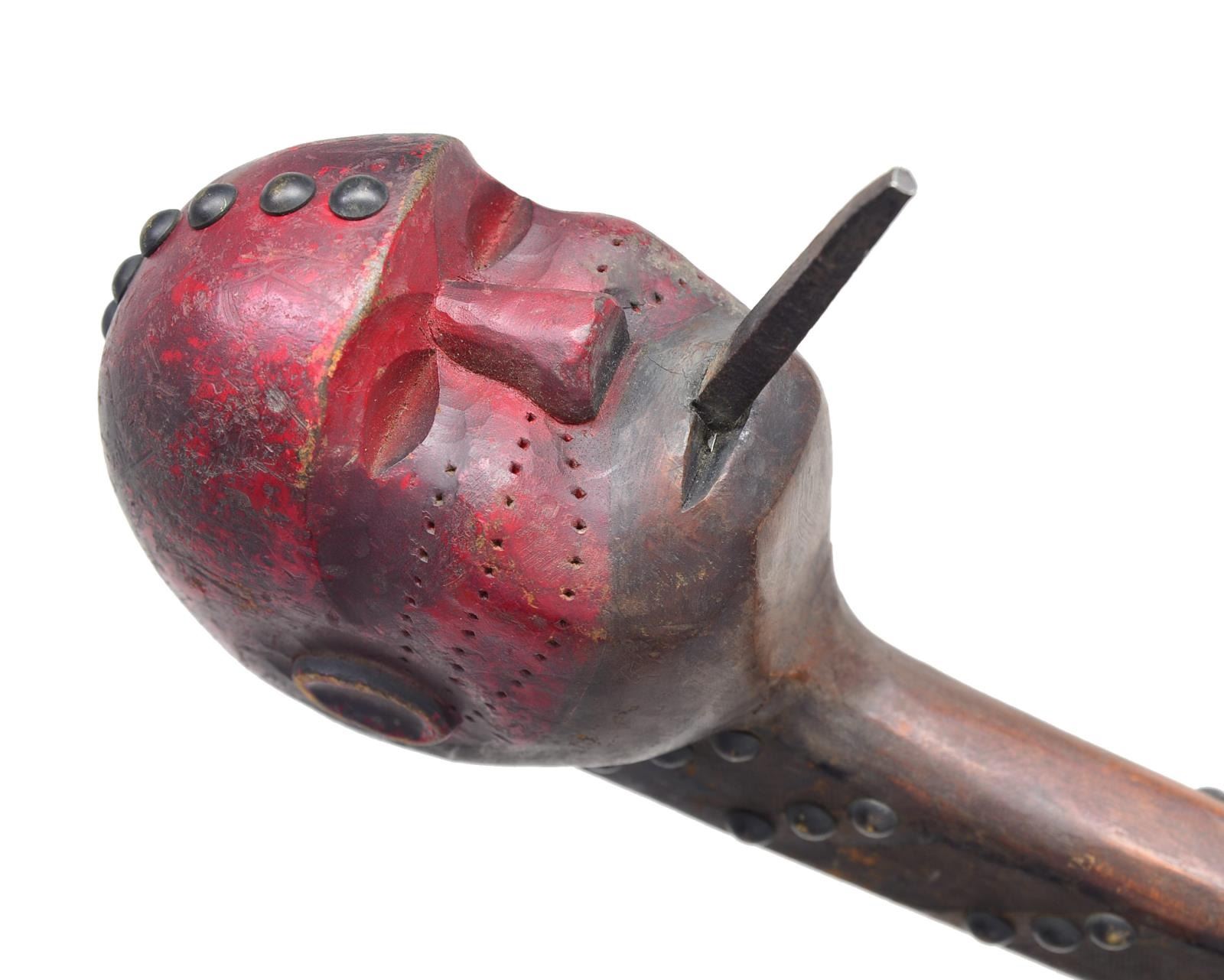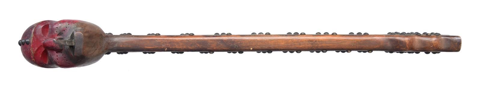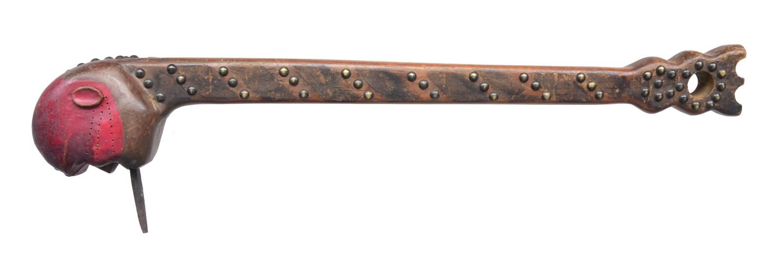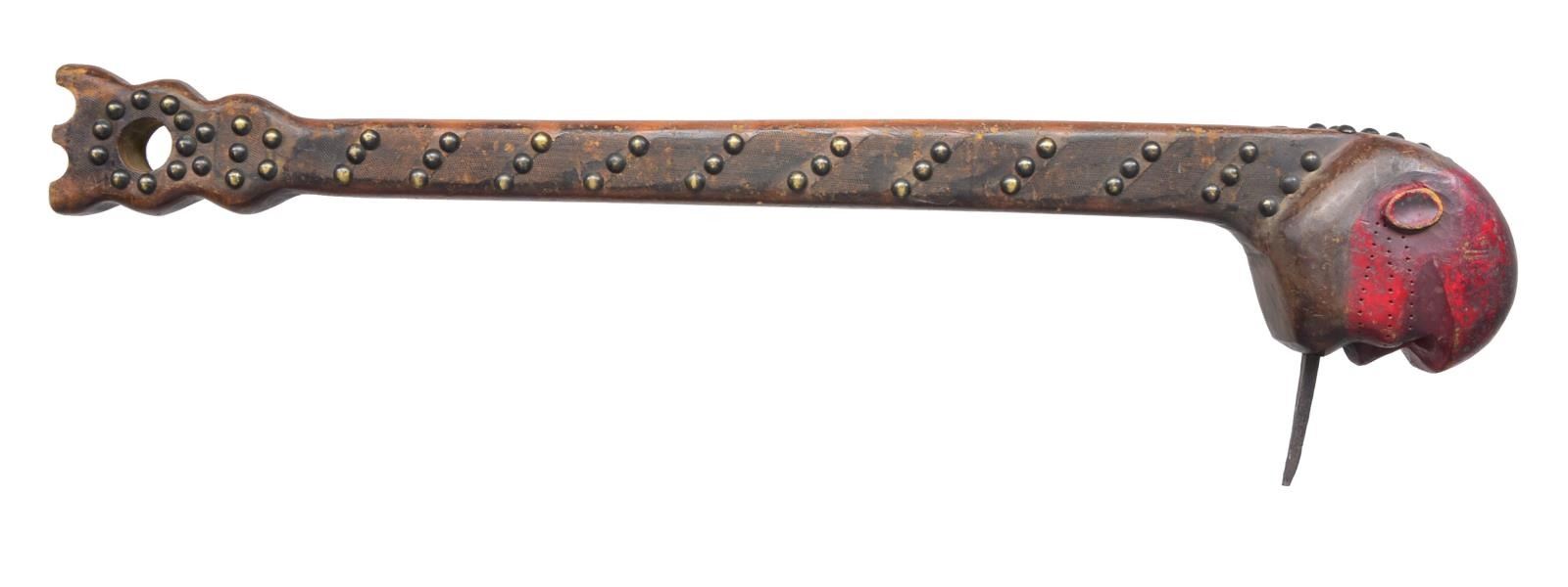 Overall length: 26”. An imposing Native American war club often associated w/ the eastern Sioux tribes. The top is a lg. carved ovate human head w/ a lg. hand forged iron spike protruding 2 1/4" from the mouth. The head has a natural wood finish highlighted w/ crimson red, likely to give an impression of a bloodied weapon. The top of the head is decorated w/ brass tacks from the forehead around the skull to the base of the neck. The 22 3/4" haft is decorated w/ brass tacks & branded w/ an iron file. The base of the haft widens out in a 3 lobed manner & has a central 1” hole. CONDITION: the club shows light to moderate wear w/ definite indications of being carried, if not used, in battle. (02-14023/BF). $1,000-2,000.