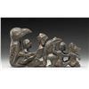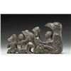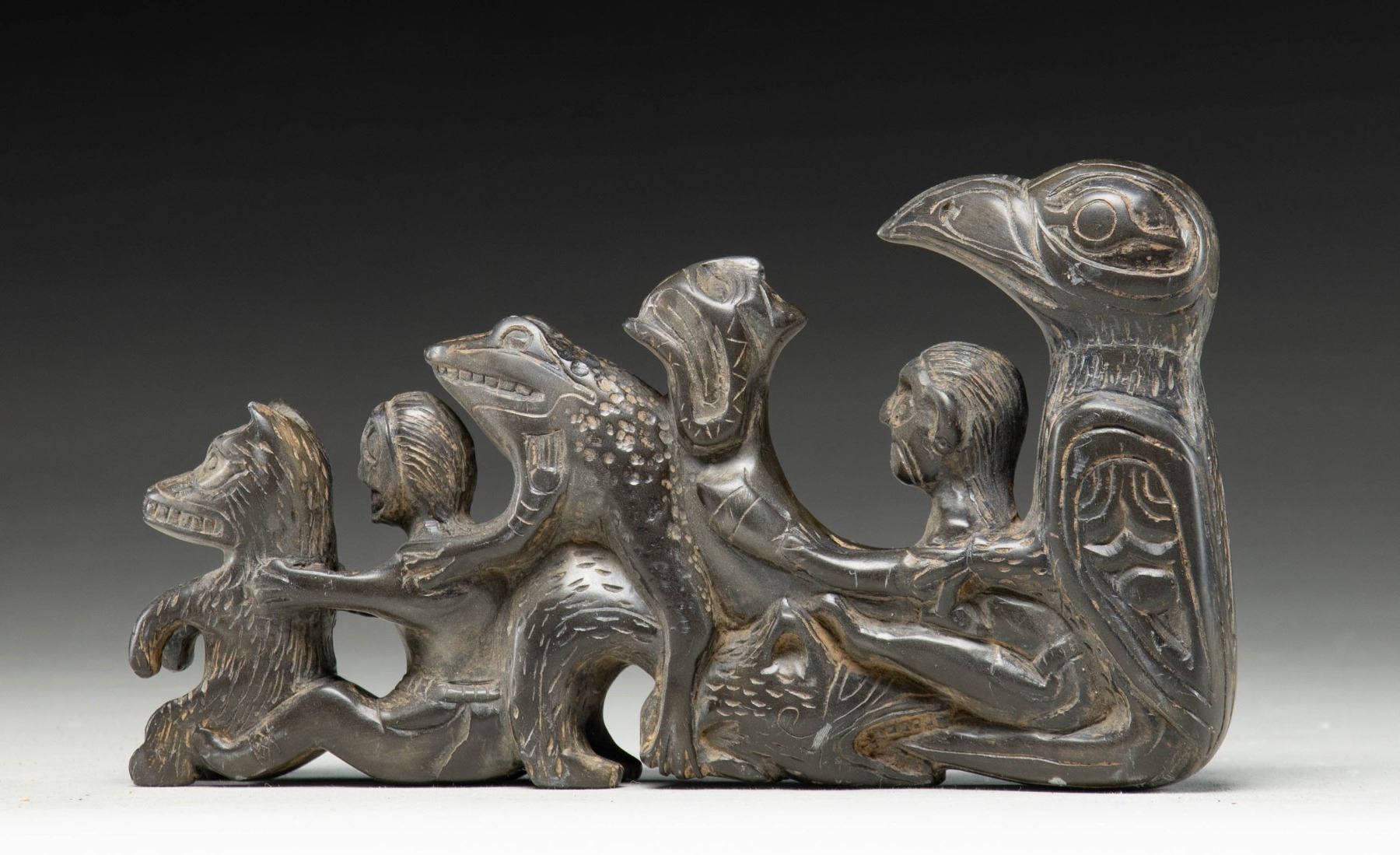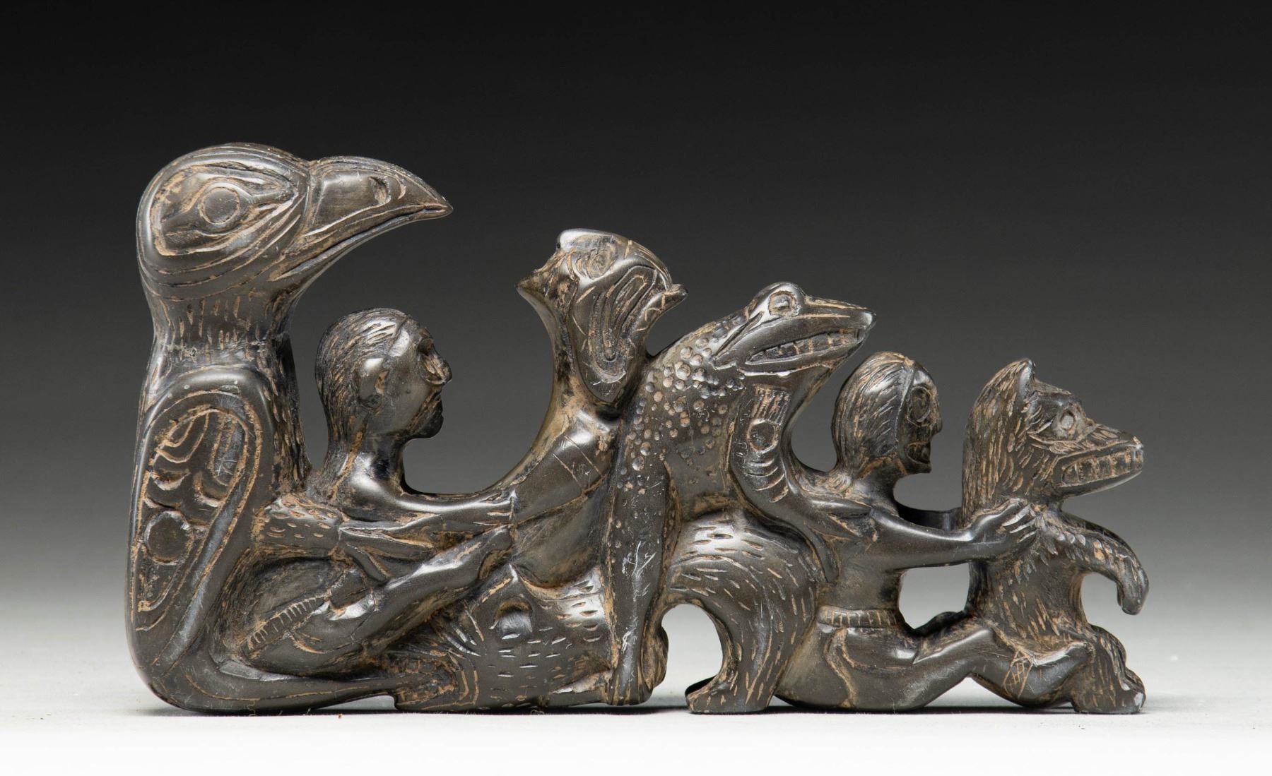 A large visually impactful steatite/soapstone carving likely of Northwest Native American origin. This totem depicts, in descending order, an eagle, a seated man, a backwards seated elderly woman, a frog, a masked seated human and a wolf. The carving measures 9" x 5" at its tallest point. The effigies are quite artistically and fancifully rendered and the carving in its entirety is impressive to behold. CONDITION: generally the totem shows light wear overall. It appears that the eagles head was broken at the neck and reattached skillfully. (02-17617/BF). NON-GUN. $800-1,300.