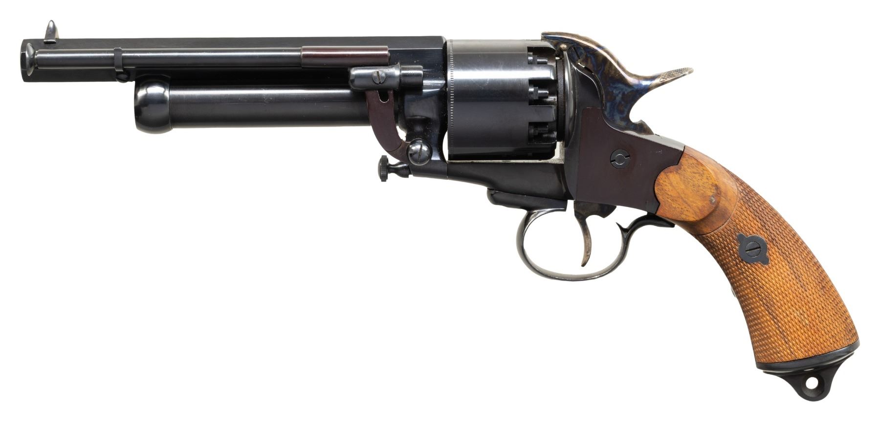 Cal. 44/20 Ga. S# 1083. Bbls. 6 3/4" pistol & 5" shotgun. Blade front sight. Italian made repro of the famous Confederate revolver. Pistol bbl. marked "Col. LeMat". Blued finish with case colored hammer & trigger. Checkered walnut grips. UNATTACHED ACCESSORIES: hardwood display case. CONDITION: grips & metal near excellent with minimal wear. Action is functional when hand cycled. Near excellent bores. (01-28499/MJC). ANTIQUE. $600-900.