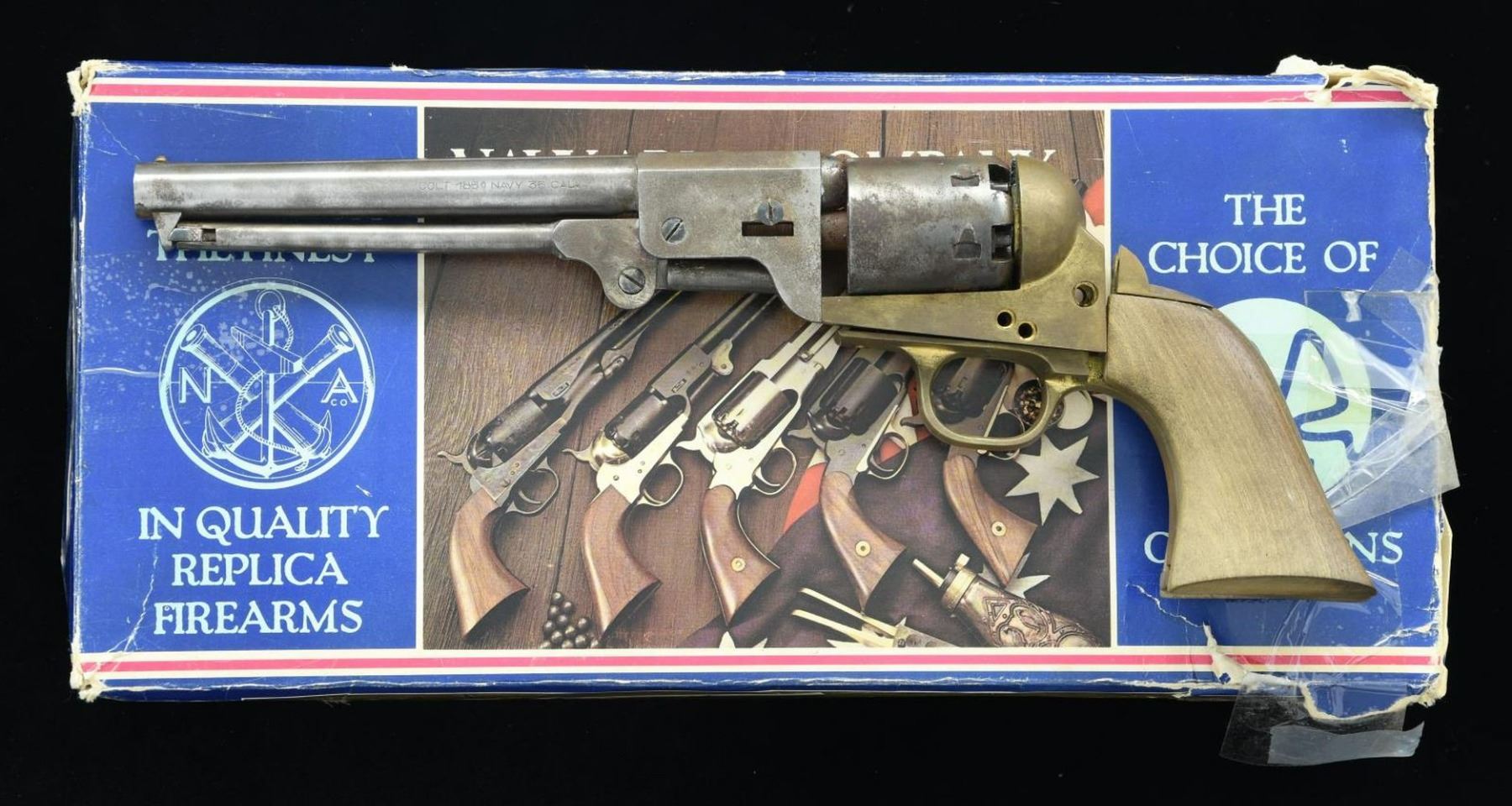 Cal. 36. S# 149753. Bbl. 7 1/2". Model 1851 Navy kit gun mfg. by Navy Arms. Box contains a partially assembly brass frame Model 1851 Navy revolver, with small parts housed within a plastic bag. Left side of bbl. is marked "COLT 1851 NAVY 36 CAL.", with Navy Arms single line address across the top. Cyl. exhibits Italian proofs. UNATTACHED ACCESSORIES: Navy Arms box. CONDITION: steel components exhibit areas of oxidation overall, with brass components exhibiting areas of dark brown patina. Bright bore, exhibiting residue and strong rifling throughout. Grip is very good overall. Box exhibits taped repairs overall, with one end flap having been torn off, but remaining present in the box. (01-24199/MLW). ANTIQUE. $75-125.