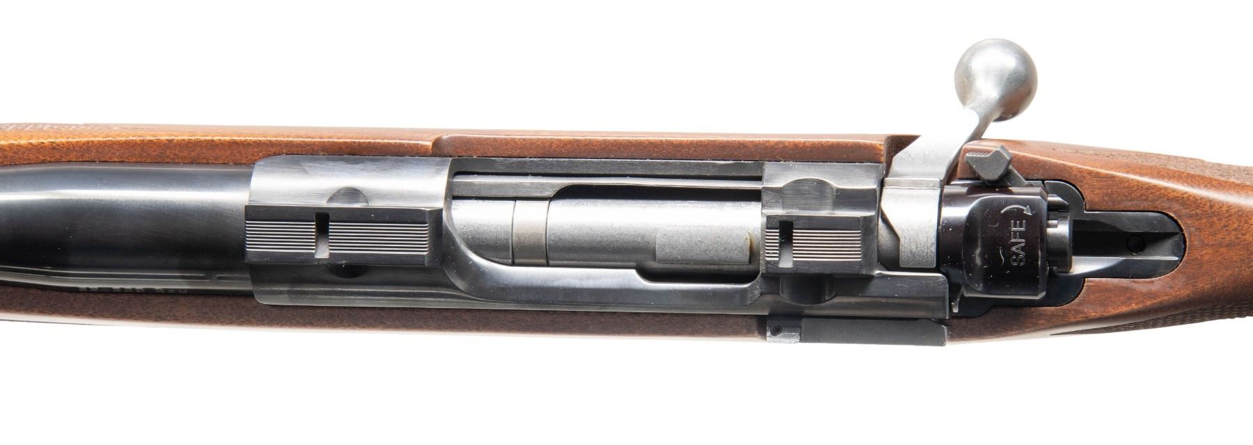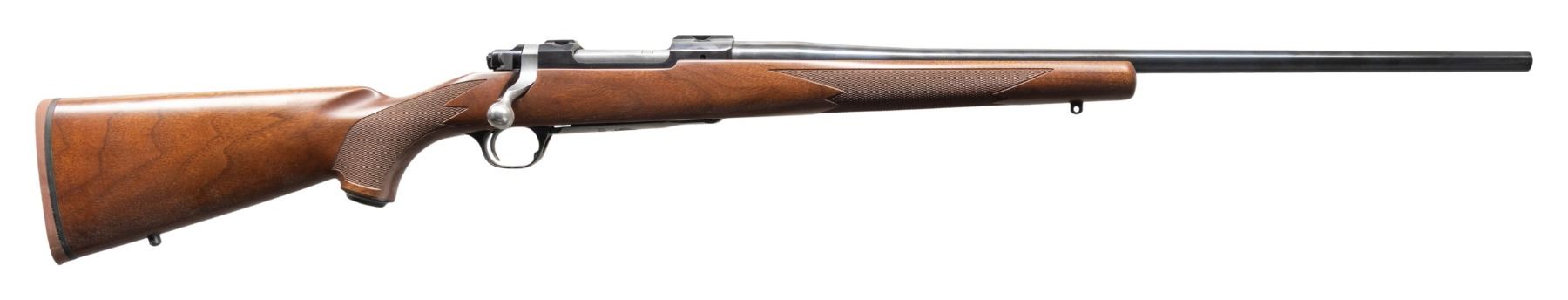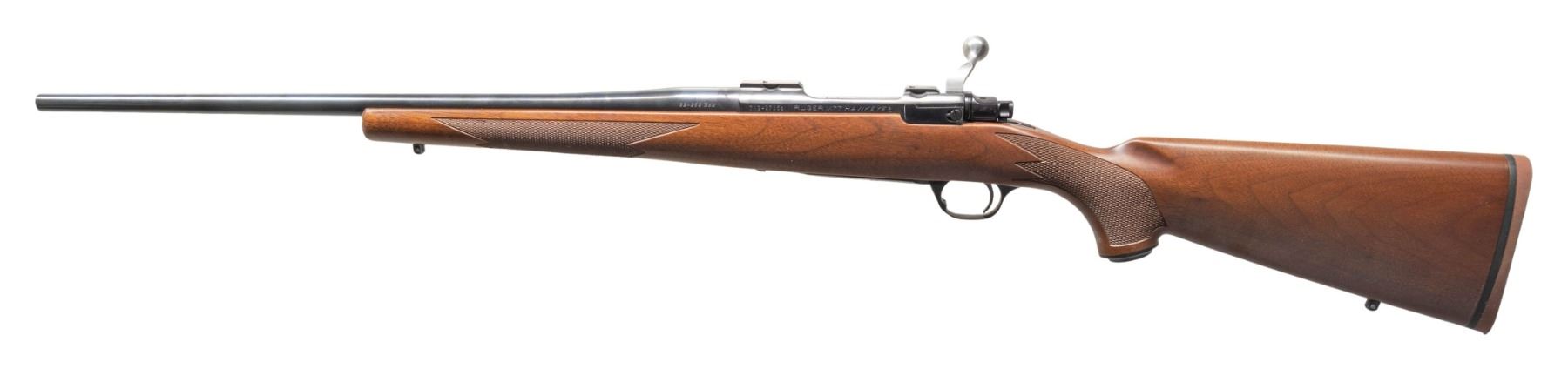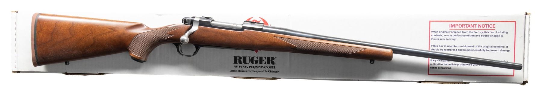 ACTION RIFLE WITH MATCHING FACTORY BOX. Cal. 22-250 Rem. S# 712-27856. Shipped 2017 as Catalog # HM77R; Model 37118. Bbl. 22". Gloss blue finish. Control feed action w/ claw extractor, integral ring grooves & matching numbered bolt. Floorplate has laser engraved Ruger emblem. Checkered walnut stock w/ sling studs, Ruger grip cap & red pad. UNATTACHED ACCESSORIES: matching numbered box containing lock, Ruger rings & paperwork. CONDITION: all aspects near excellent. (24-3328/MD). MODERN. $400-600.