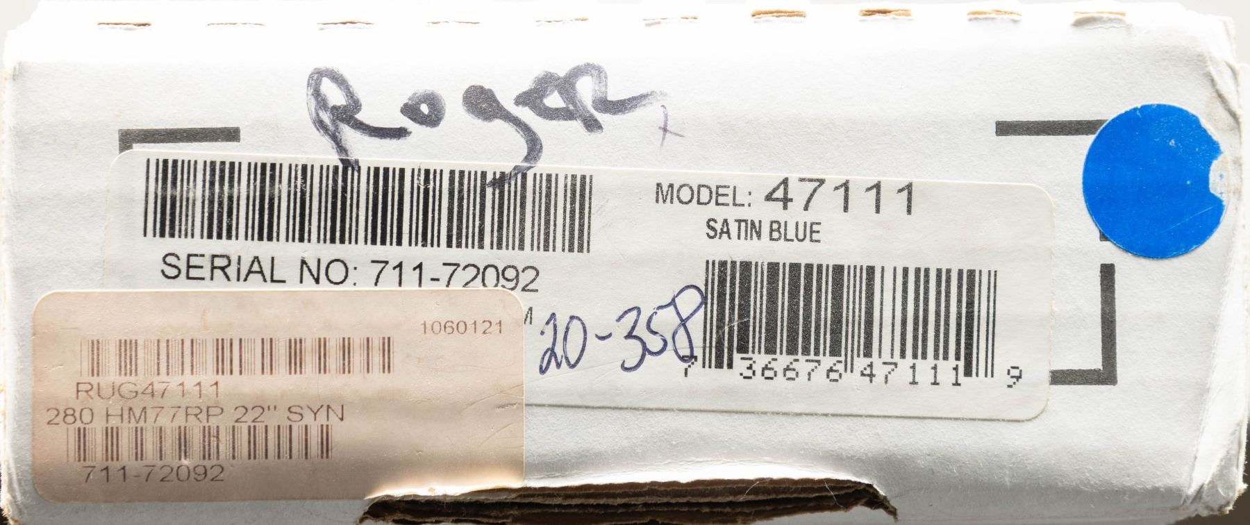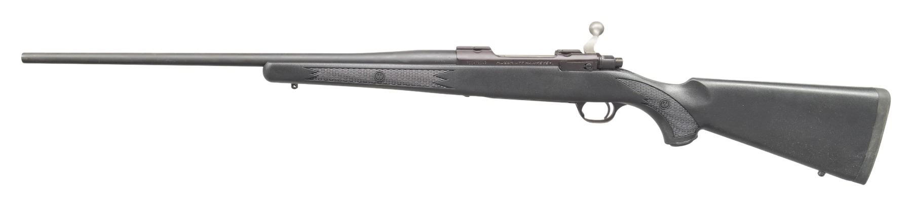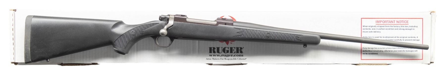 ACTION RIFLE WITH MATCHING FACTORY BOX. Cal. 280 Rem. S# 711-72092. Shipped 2013 as Catalog # HKM77RFP; Model 47111. Bbl. 22". Matte blued finish. Control feed action w/ claw extractor, integral ring grooves & matching numbered bolt. Floorplate has laser engraved Ruger emblem. Checkered black synthetic stock w/ sling studs, Ruger grip cap & red pad. UNATTACHED ACCESSORIES: matching numbered box containing lock, Ruger rings & paperwork. CONDITION: all aspects near excellent. (24-3236/MD). MODERN. $400-600.