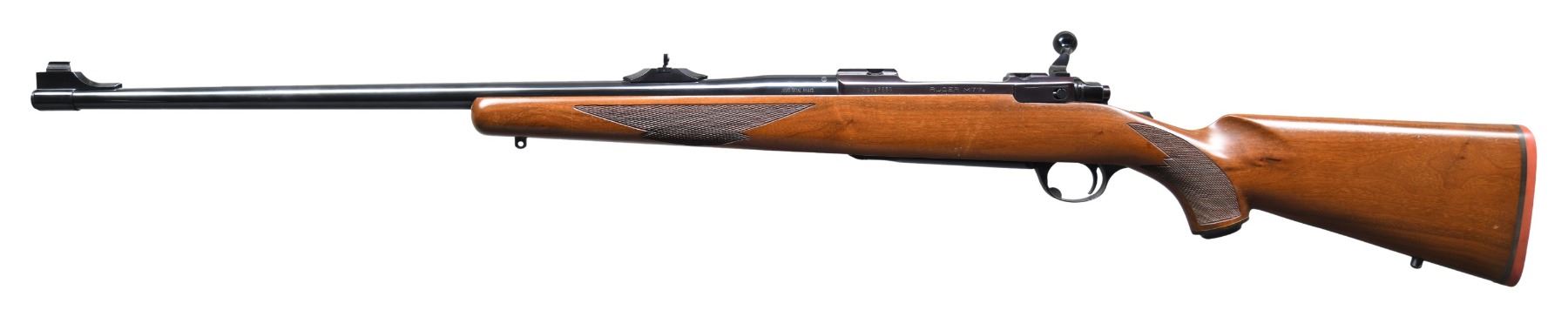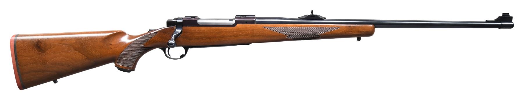 RIFLE. Cal. 300 Win. Mag. S# 73-67550. Mfg. 1978 as Catalog # M77RS. Bbl. 24" w/ Warning marks. Band mounted gold bead front sight & island mounted adj. folding leaf rear sight. Long action w/ integral bases; matching numbered bolt w/ claw extractor. Checkered walnut stock w/ sling studs, Ruger grip cap & red pad. CONDITION: all aspects near excellent showing scattered light handling marks; receiver having a plum tone. (24-2836/MD). MODERN. $600-900.