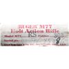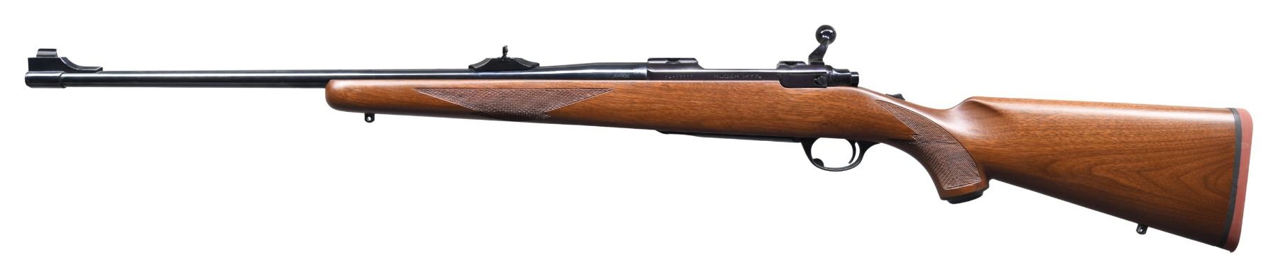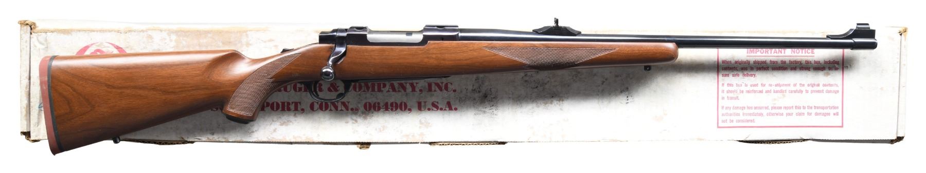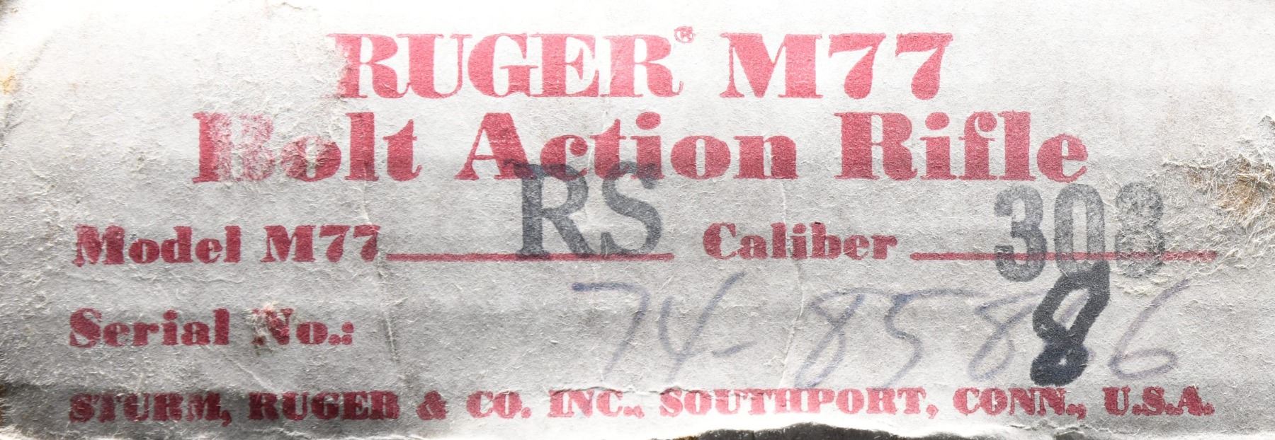 WITH MATCHING FACTORY BOX. Cal. 308 Win. S# 74-85886. Mfg. 1980 as Catalog # M77RS. Bbl. 22" w/ Warning marks. Band mounted gold bead front sight & island mounted folding adj. rear sight. Short action w/ integral ring grooves, matching numbered bolt & claw extractor. Checkered walnut stock w/ sling studs, Ruger grip cap & red pad. UNATTACHED ACCESSORIES: fair factory box written on top "Special Order Sold". Box shows heavy water damage. CONDITION: all aspects near excellent. (24-2830/MD). MODERN. $400-600.