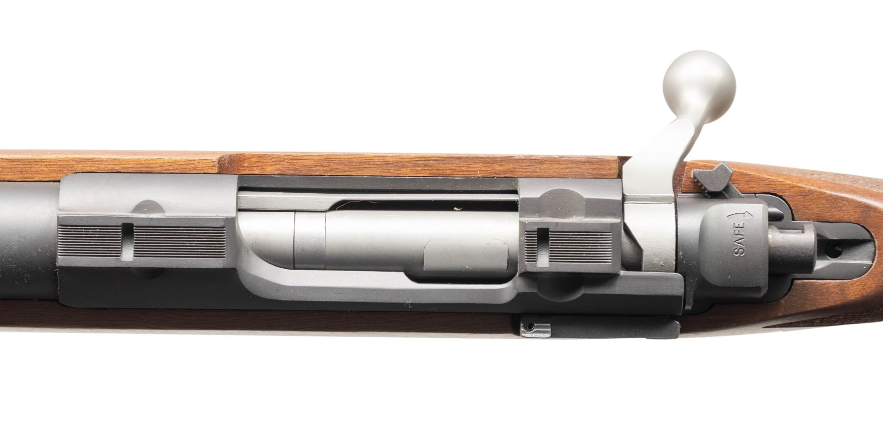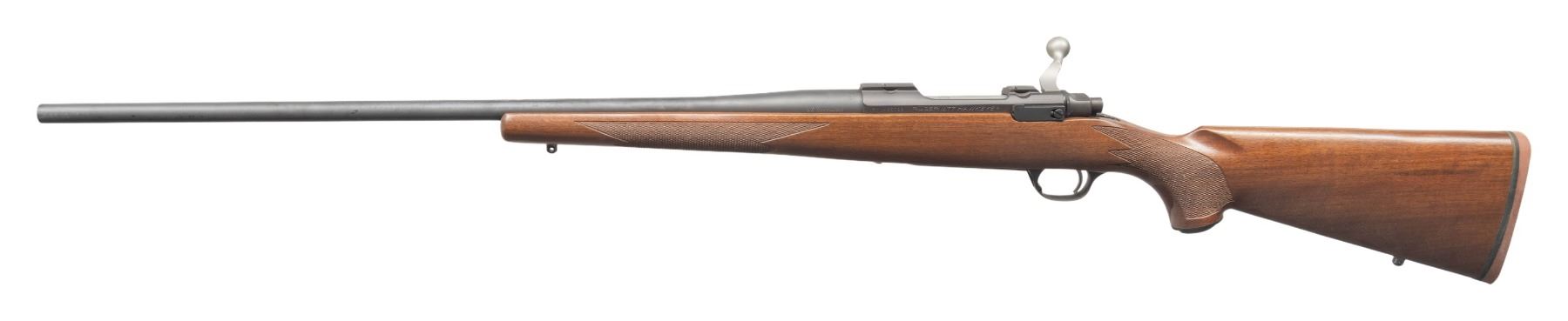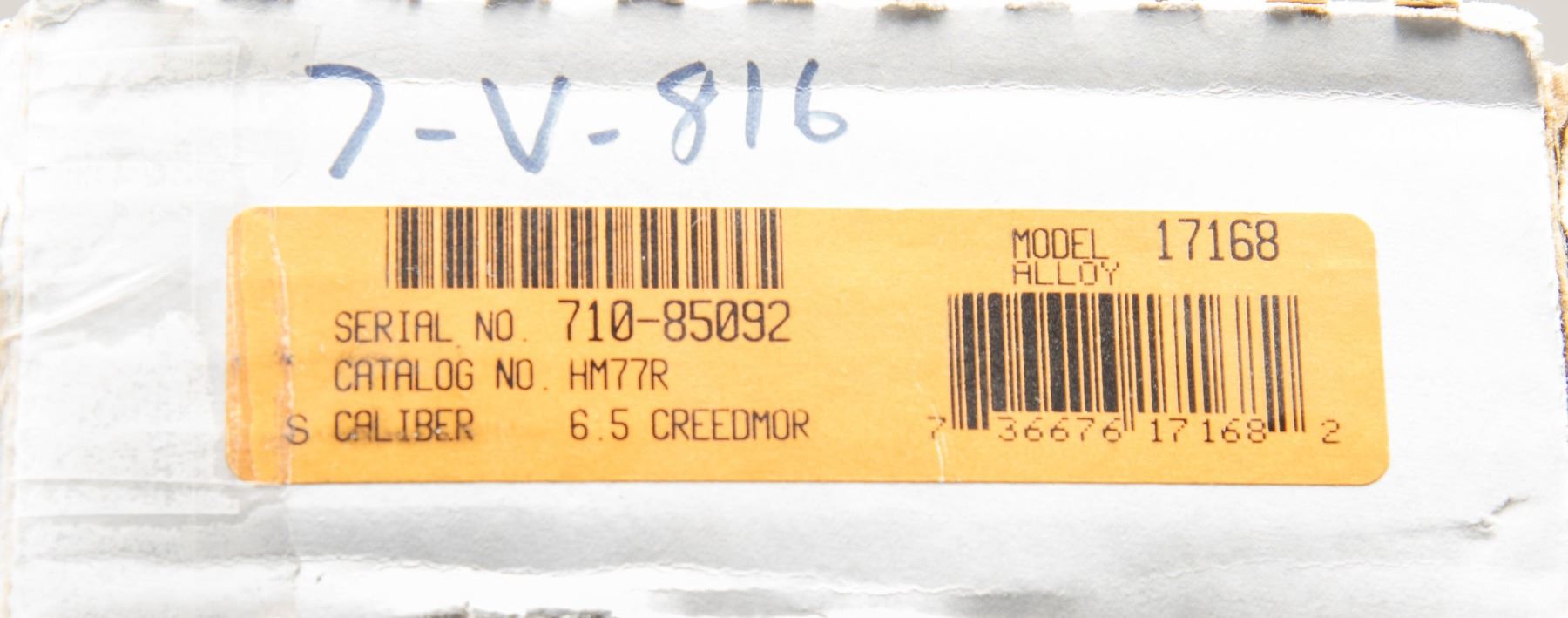 Cal. 6.5 Creedmoor. S# 710-85092. Shipped 2009 as Catalog # HM77R; Model 17168. Bbl. 24". Matte alloy finish. Control feed action w/ claw extractor, integral ring grooves & matching numbered bolt. Floorplate has laser engraved Ruger emblem. Checkered walnut stock w/ sling studs, Ruger grip cap & red pad. UNATTACHED ACCESSORIES: matching numbered box containing lock, Ruger rings & paperwork. CONDITION: all aspects near excellent. (24-3542/MD). MODERN. $400-600.