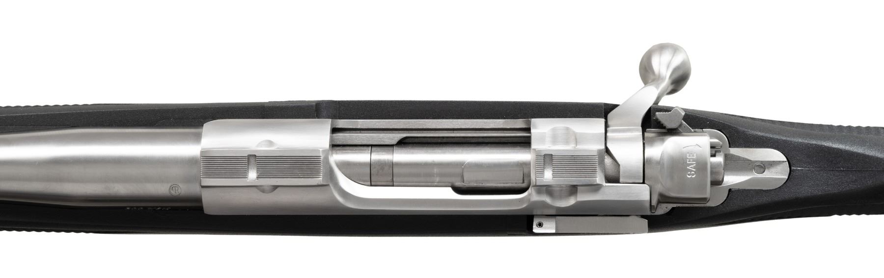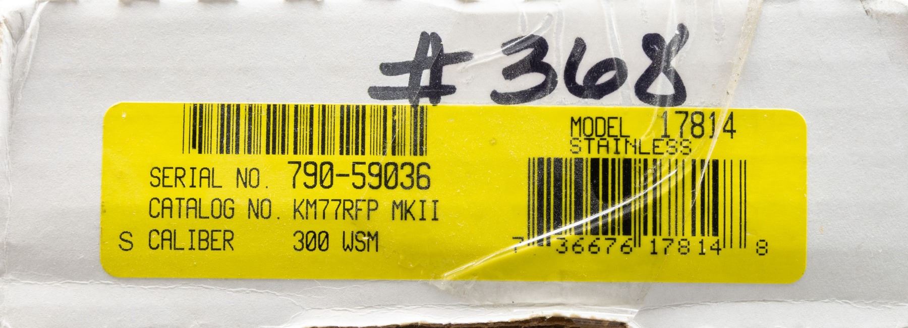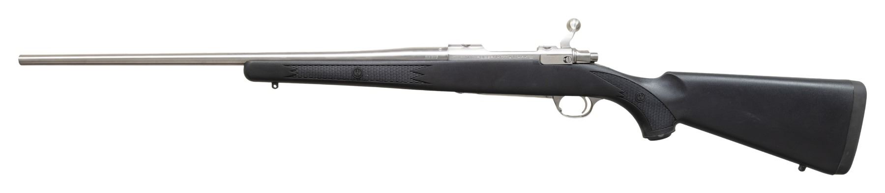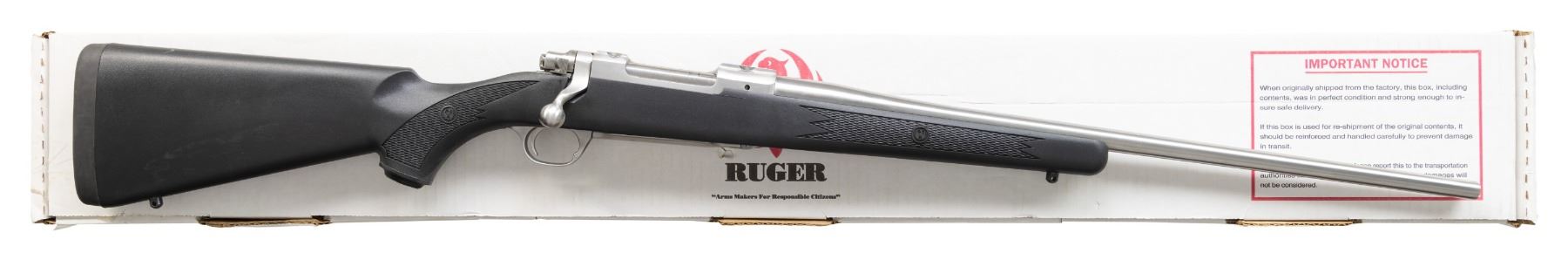 WEATHER STAINLESS BOLT ACTION RIFLE W/ MATCHING FACTORY BOX. Cal. 300 WSM. S# 790-59036. Mfg. 2004 as Catalog # KM77RFP MKII; Model 17814. Bbl. 22". Stainless steel finish. Short action w/ integral ring grooves, claw extractor & matching numbered bolt. Checkered black Zytel stock w/ sling studs, Ruger grip cap & black pad. UNATTACHED ACCESSORIES: matching factory box w/ Ruger rings, lock & paperwork. CONDITION: as NIB. (24-3254/MD). MODERN. $400-600.