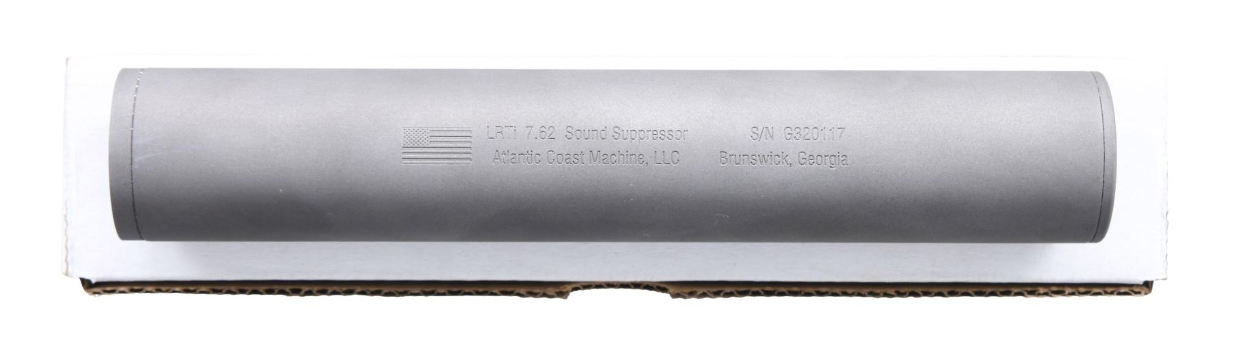SILENCER. Cal. 7.62mm. S# G320117. LRTi (QM variation) 7.62mm silencer mfg. by Atlantic Coast Machine, LLC. Side of tube is marked with an American flag, followed by the model and cal. designations, the S#, as well as Atlantic Coast Machine's mfg. information. Titanium construction, with a matte gray finish. Silencer measures 9 1/8" in length, and 1 5/8" in diameter. Muzzle brake mount is absent. UNATTACHED ACCESSORIES: unmarked cardboard box. CONDITION: near new, exhibiting few light superficial marks from handling and storage. Interior is excellent, showing no signs of prior use. PROVENANCE: From the Estate of Ivan Lee Shapiro. NATIONAL FIREARMS ACT SILENCER REQUIRING BATF TRANSFER BEFORE TAKING POSSESSION. FULLY TRANSFERABLE. (03-1787/MLW). MODERN CLASS III. $200-400.