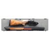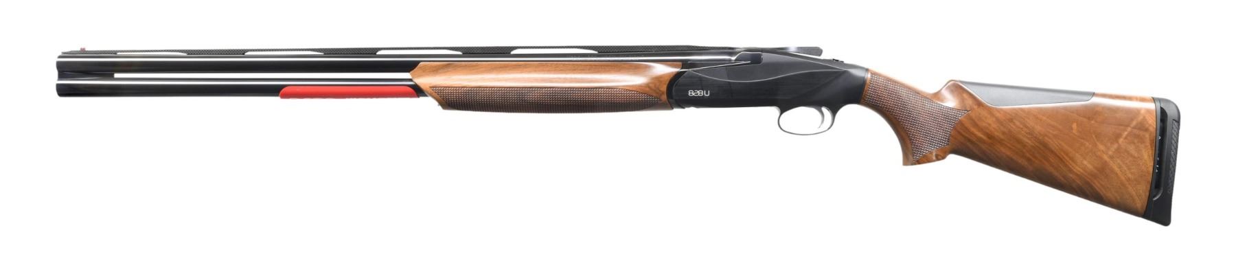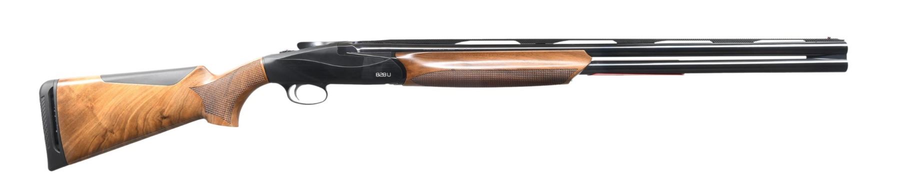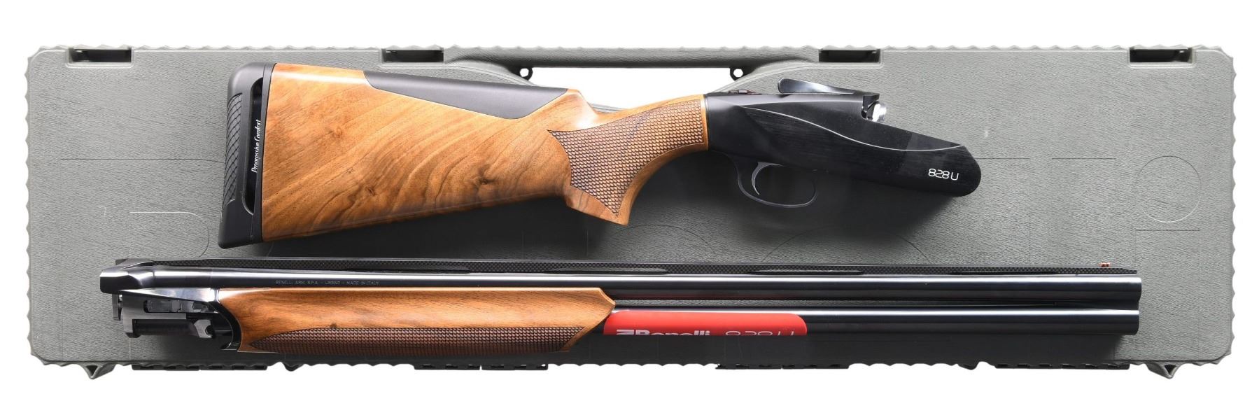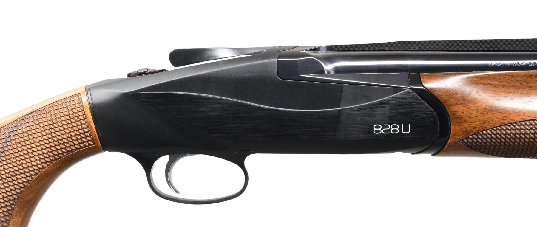 HARD CASE & MATCHING FACTORY BOX. Cal. 12 GA, 2 3/4" & 3". S# BS000727J15. Bbl. 28". Model 828U O/U shotgun mfg. in Italy by Benelli and imported by Benelli USA Corp. Left side of the upper bbl. is marked with the cal. designation, with Benelli's mfg. information marked on the right. Sides of receiver are marked "828U", with Benelli's importer information marked on the underside. Aluminum receiver and trigger guard exhibit a black anodized finish, with the steel bbls. exhibiting a blued finish overall. Wood pistol grip buttstock and forend exhibit scaled grip panels. Carbon fiber V/R with red fiber optic front sight. Upper bbl. is fitted with a threaded Modified choke, with the lower bbl. being threaded with an Improved Cyl. choke. UNATTACHED ACCESSORIES: matching factory box, with factory hard case containing chokes and factory paperwork. CONDITION: near new, with metal components retaining virtually all of their original factory finishes overall. Mirror bores. Wood furniture is excellent overall. Box shows some light exterior wear from handling and storage, but otherwise remains sturdy and serviceable. (24-2789/MLW). MODERN. $1,750-2,500.
