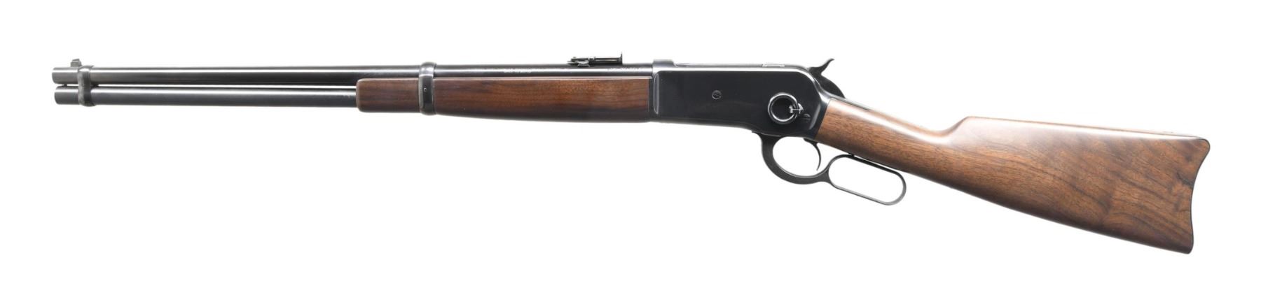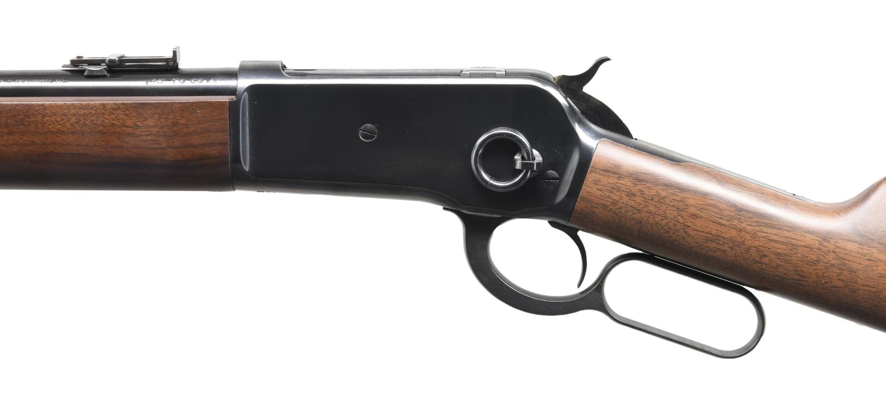 RIFLE WITH MATCHING FACTORY BOX. Cal. 45-70. S# 03385NY1C7. Bbl. 22". Grade I Model 1886 lever action rifle, mfg. in Japan and imported/retailed by Browning Arms Company. The left side of the bbl. is marked with Browning's importer information above "MADE IN JAPAN", followed by the cal. designation at the breech, with the model and cal. designations marked on the right. Upper receiver tang is marked "BROWNING MODEL 1886". Metal components exhibit a blue finish overall, save for on the locking bolt, which is polished in-the-white. Plain wood straight grip buttstock and forend. Blade front sight, with U-notch flip-up ladder rear sight. Receiver is mounted with its factory "SUPER/ SWIVELS" paper cover for the saddle ring. UNATTACHED ACCESSORIES: matching factory box. CONDITION: near new, with metal components retaining virtually all of their original factory finishes overall. Mirror bore, exhibiting grease while retaining well-defined rifling throughout. Wood furniture is excellent overall. Box shows some light exterior wear from handling and storage but otherwise remains sturdy and serviceable. (24-5000/MLW). MODERN. $1,200-1,800.
