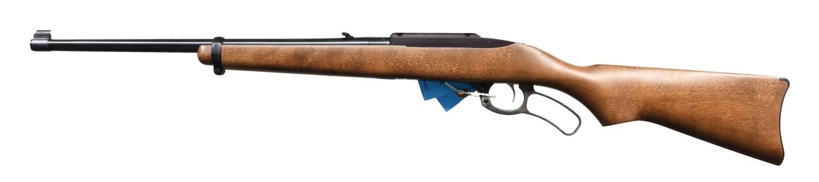 LEVER ACTION RIFLE WITH MATCHING FACTORY BOX, FORMER HENRY RODESCHIN COLLECTION. Cal. 44 Rem Mag. S# 640-00091. Bbl. 18 1/2". Model 96/44 lever action rifle mfg. by Ruger in 1996. Top of the bbl. is marked with Ruger's mfg. information, with the cal. designation marked on the left at the breech. Left side of the receiver is marked "RUGER MODEL NINETY-SIX" above the S# "640-00091" (former Ruger factory employee Henry Rodeschin's personally assigned "91" S#). Steel receiver and bbl. exhibit a blue finish, with the aluminum trigger guard exhibiting a black enamel finish and the steel lever exhibiting a case-color hardened finish. Plain wood pistol grip buttstock. Brass-beaded blade front sight with flip-up U-notch rear sight. The receiver features integral Ruger scope mounts with a brass cocking indicator. MAGS: 1 4-rd. UNATTACHED ACCESSORIES: matching factory box. CONDITION: near new, with metal components retaining virtually all of their original factory finishes overall. Lever retains strong, vibrant case coloring. Brilliant mirror bore, exhibiting well-defined rifling throughout. Stock is excellent overall. Polymer mag. shows some scattered handling marks. Box shows some mild exterior wear but otherwise remains sturdy and serviceable. PROVENANCE: Amoskeag Auction Company, Auction #136, Lot #1164. (23-6783/MLW). MODERN. $1,200-2,000.