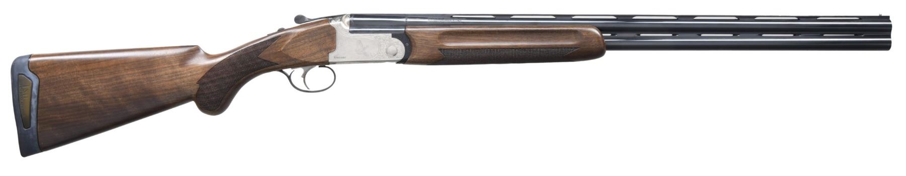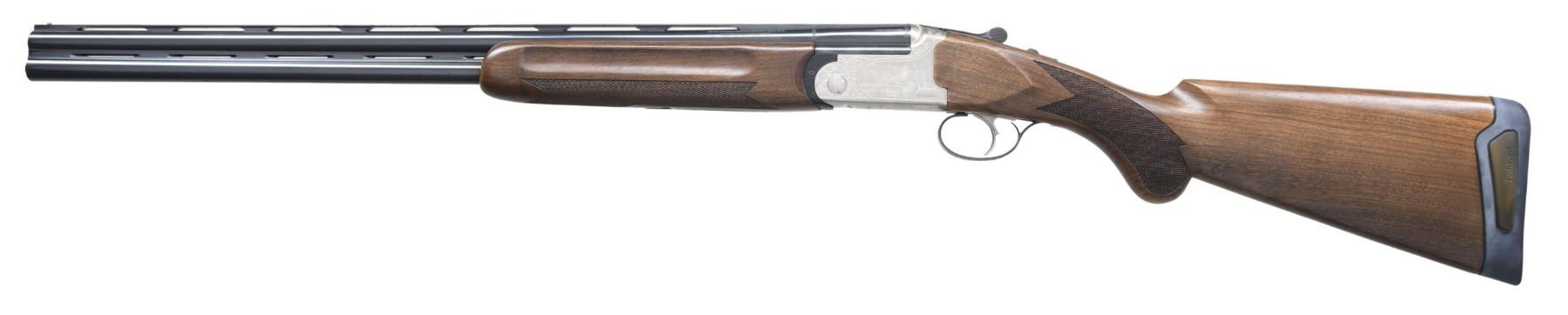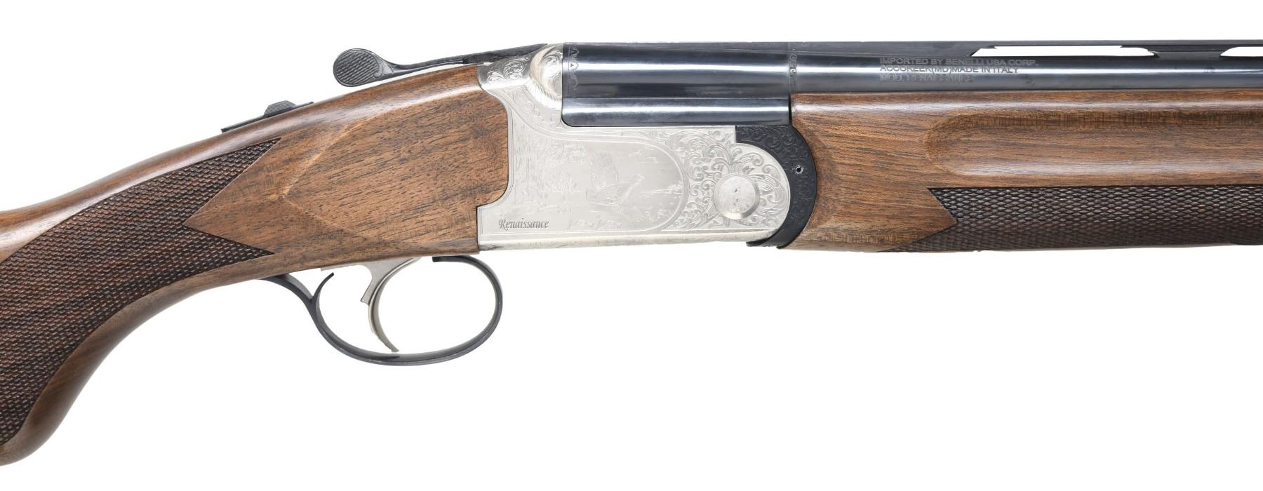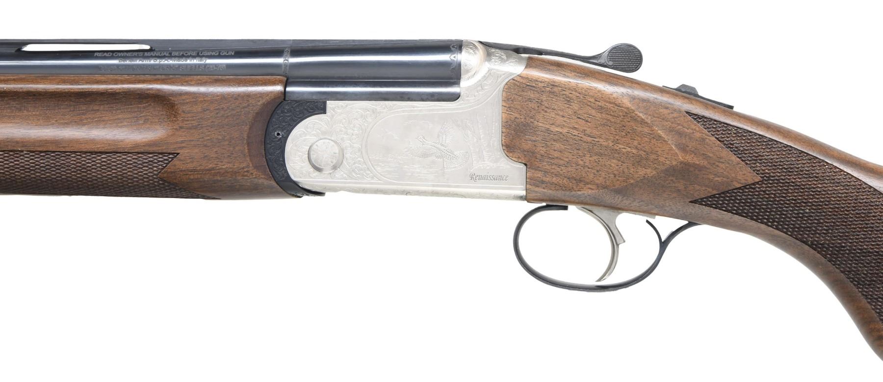 WITH CASE. Cal. 20 GA, 2 3/4" & 3". S# TB01775. Bbl. 26". Renaissance O/U shotgun mfg. in Italy and imported by Benelli U.S.A. Corp. Left side of the bbl. is marked "Benelli Armi S.p.A- Made in Italy" above the cal. designation, with Benelli's importer information and the model designation marked on the right. Receiver features scroll engraving overall, with the sides featuring a scene of a patridge above "Renaissance" and with the underside exhibiting the Franchi trademark logo. Aluminum receiver exhibits a brightly polished finish, with lever, safety, trigger guard, bbls., and forend hardware exhibiting a blue finish overall. Checkered wood rnd. knob buttstock with Technogel buttpad, and checkered wood grooved wood forend. Matte V/R with aluminum bead front sight. Top bbl. is fitted with a threaded Modified choke, with the lower bbl. being threaded with an Improved Cyl. choke. Matching numbers are present on the receiver, forend iron, and bbls. UNATTACHED ACCESSORIES: factory black plastic hard case containing factory paperwork as well as aftermarket Carlson's chokes. CONDITION: near new, with metal components retaining virtually all of their original factory finishes overall. Mirror bores. Wood furniture is excellent overall. (24-3733/MLW). MODERN. $500-800.