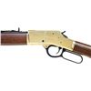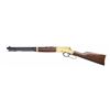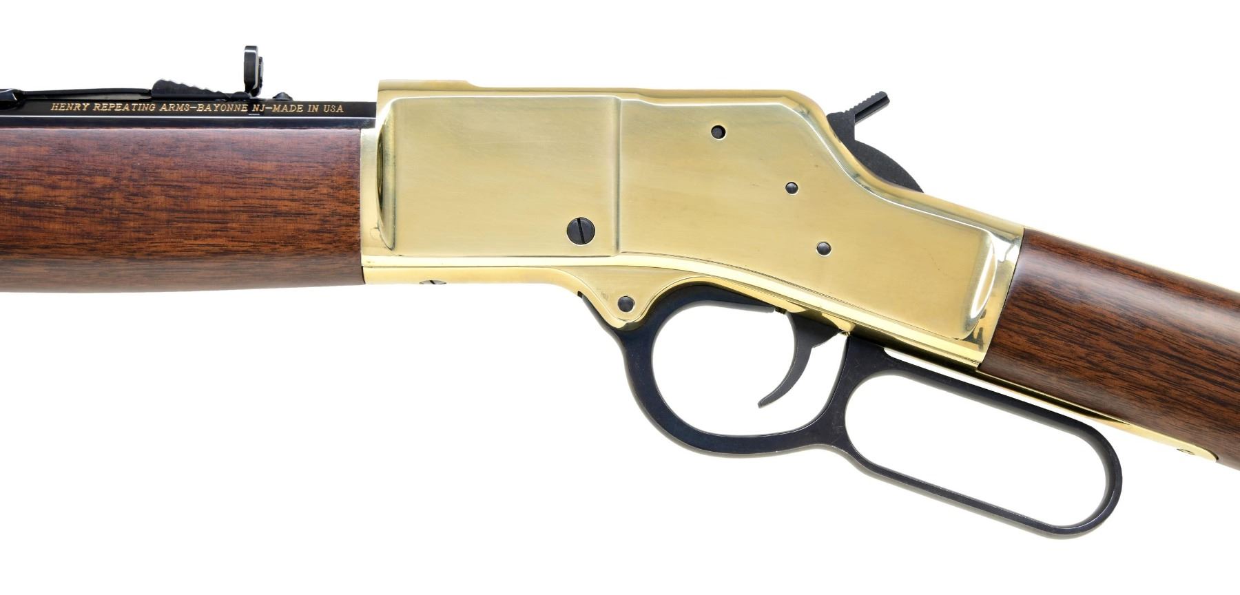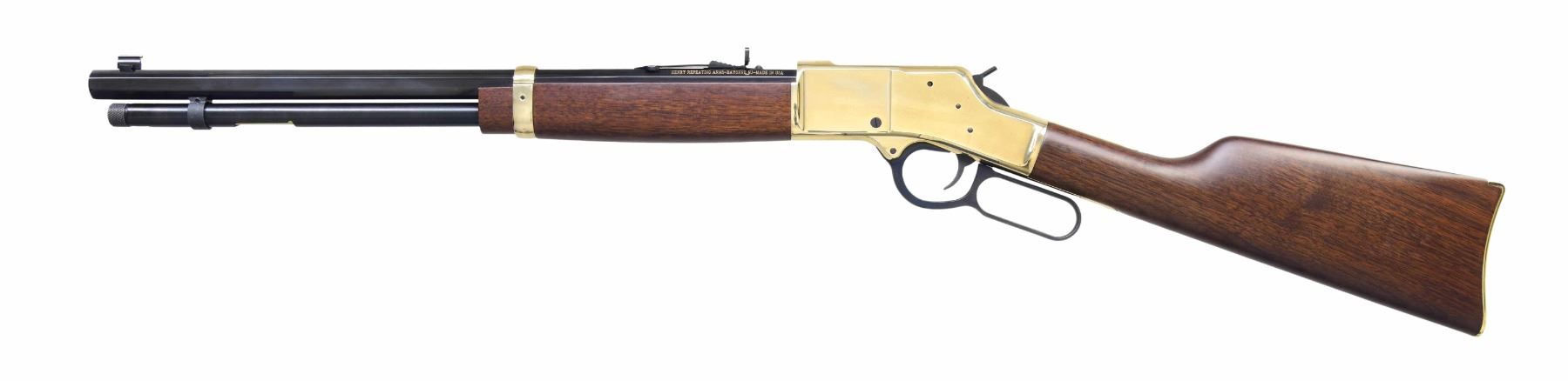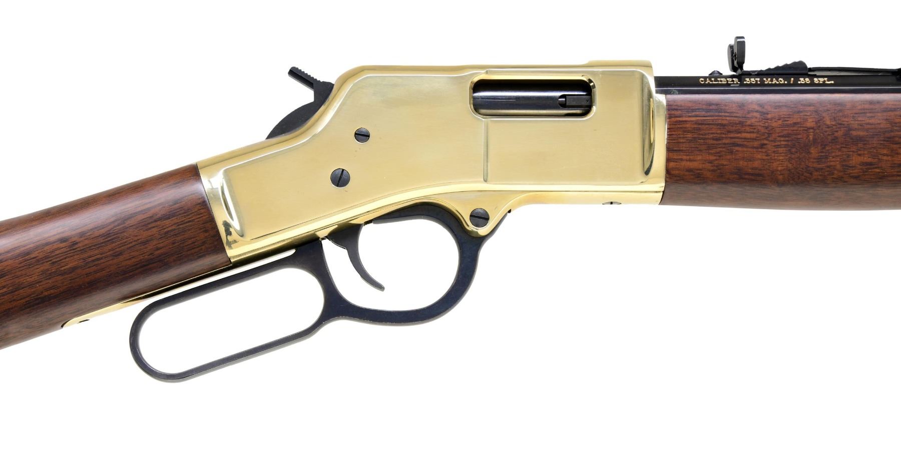 "BIG BOY" LEVER ACTION RIFLE WITH MATCHING FACTORY BOX. Cal. 357 Mag. S# BB022955M. Bbl. 20". Model H006M lever action rifle mfg. by Henry Repeating Arms. Left quarter flat of the octagonal bbl. is marked with Henry's mfg. information, with the cal. designation marked on the right. upper receiver tang is marked with the S#. Brass frame, bbl. band, and buttplate, with blued steel bbl., mag. tube, lever, trigger, and hammer. Plain wood straight grip buttstock and forend. Brass beaded blade front sight with U-notch rear sight. UNATTACHED ACCESSORIES: matching factory box. CONDITION: near new, with metal components retaining virtually all of their original factory finishes overall, save for a few light superficial marks from handling and storage. Mirror bore, exhibiting well defined rifling throughout. Wood furniture is excellent overall. Box shows some mild exterior wear, but otherwise remains sturdy and serviceable. (24-1671/MLW). MODERN. $500-800.
