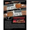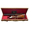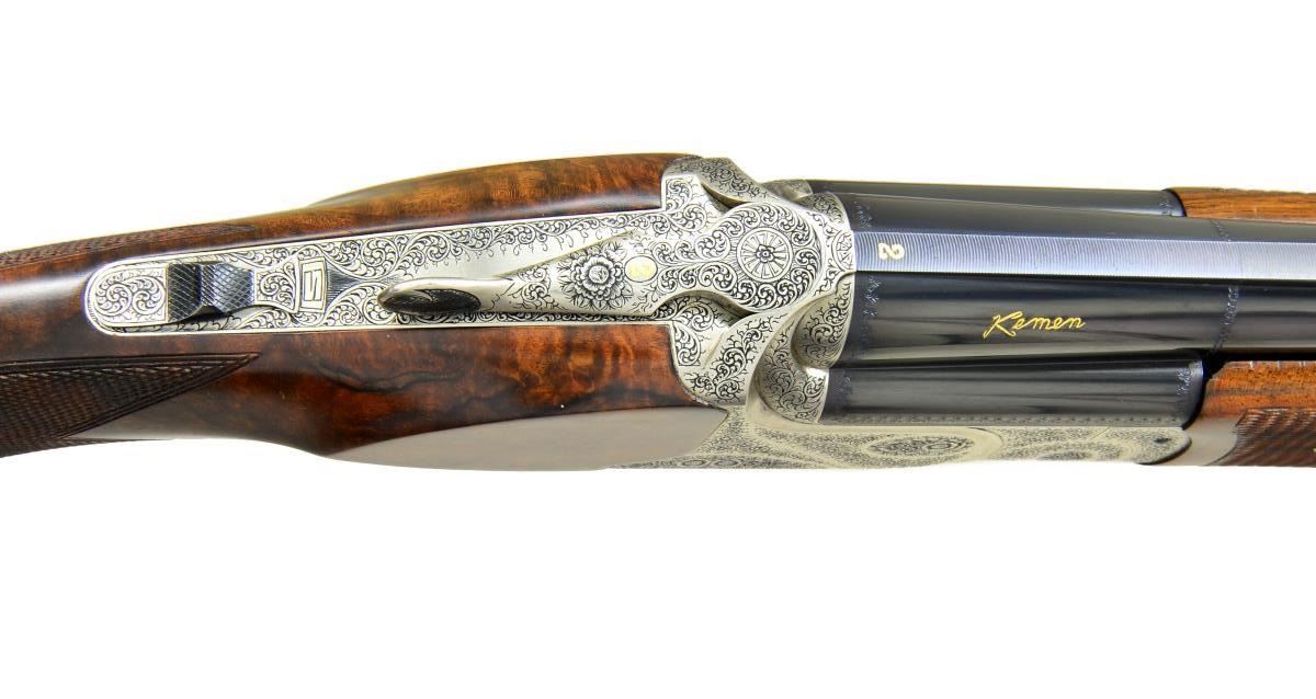 CASE. Cal. 12 Ga., 2 3/4". S# 40.03.03.902. Bbls. 28 3/8" monobloc fitted w/ narrow matted ventilated rib are gold inlaid "Kemen" on top right side of monobloc & are stamped w/ Spanish nitro proofs for 2 3/4" chambers. The number "2" is inlaid at rear portion of rib, matching number found on top lever & forend latch. Bottom of monobloc is stamped w/ serial number & engraved "Made in Spain". Coin finished action w/ removable trigger group having V-springs is fitted w/ automatic safety & single nonselective trigger. Action is engraved w/ very attractive near full coverage sprays of well cut scroll surrounding & accented by rose and floral bouquets. "KEMEN" is emblazoned at top of forend iron mortise. Pistol grip buttstock of exhibition quality, finely marbled & intricately fiddle figured European walnut measures 14 5/8" over black "Kick-eez" pad. Stock features point pattern checkering at grip w/ sm. right hand palm swell & a vacant gold oval on toeline. Matching one piece field type forend has Deeley type release. MEASUREMENTS: BBLS: Bore Diameter: T .726", B .726". Restriction: T .007" (IC), L .007" (IC). STOCK: DAH: 1 3/4". DAC: 1 7/16". LOP: 14 5/8". CAST:  neutral. WEIGHT: 7 lb. 13 oz. UNATTACHED ACCESSORIES: gun comes w/ alligator patterned leather case w/ brass trim lined in burgundy cloth. Case contains a Kemen label, pair of boss marked snap caps, toolkit containing spare firing pins & wrench, along w/ three keys. CONDITION: exceptionally fine, appears to be unfired since proof with a small number of handling marks on all wood & metal surfaces, most notably 3 or 4 scratches on left side panel. Mechanically crisp. Case is also very fine. Label has detached from lid.  (22-4505/MGM). MODERN. $6,500-9,500.