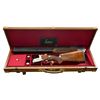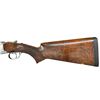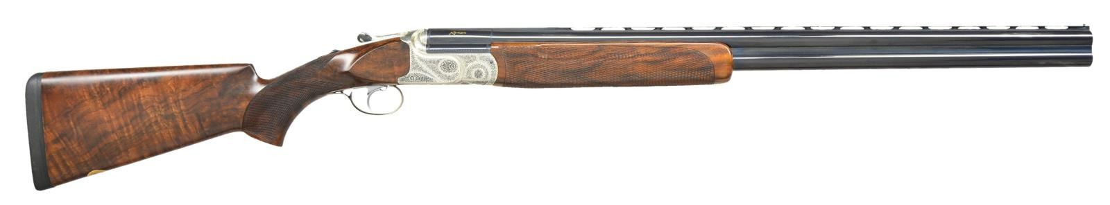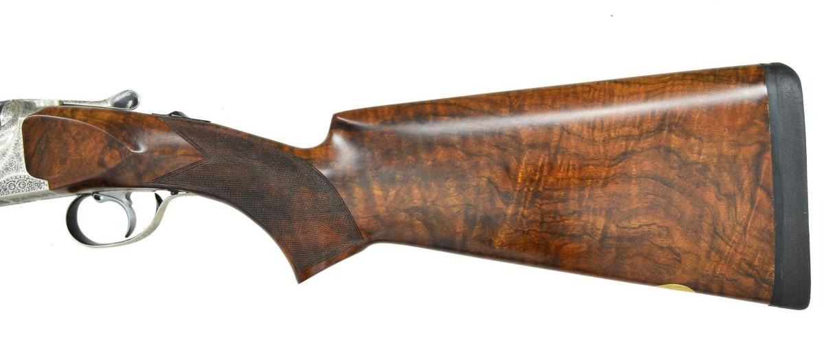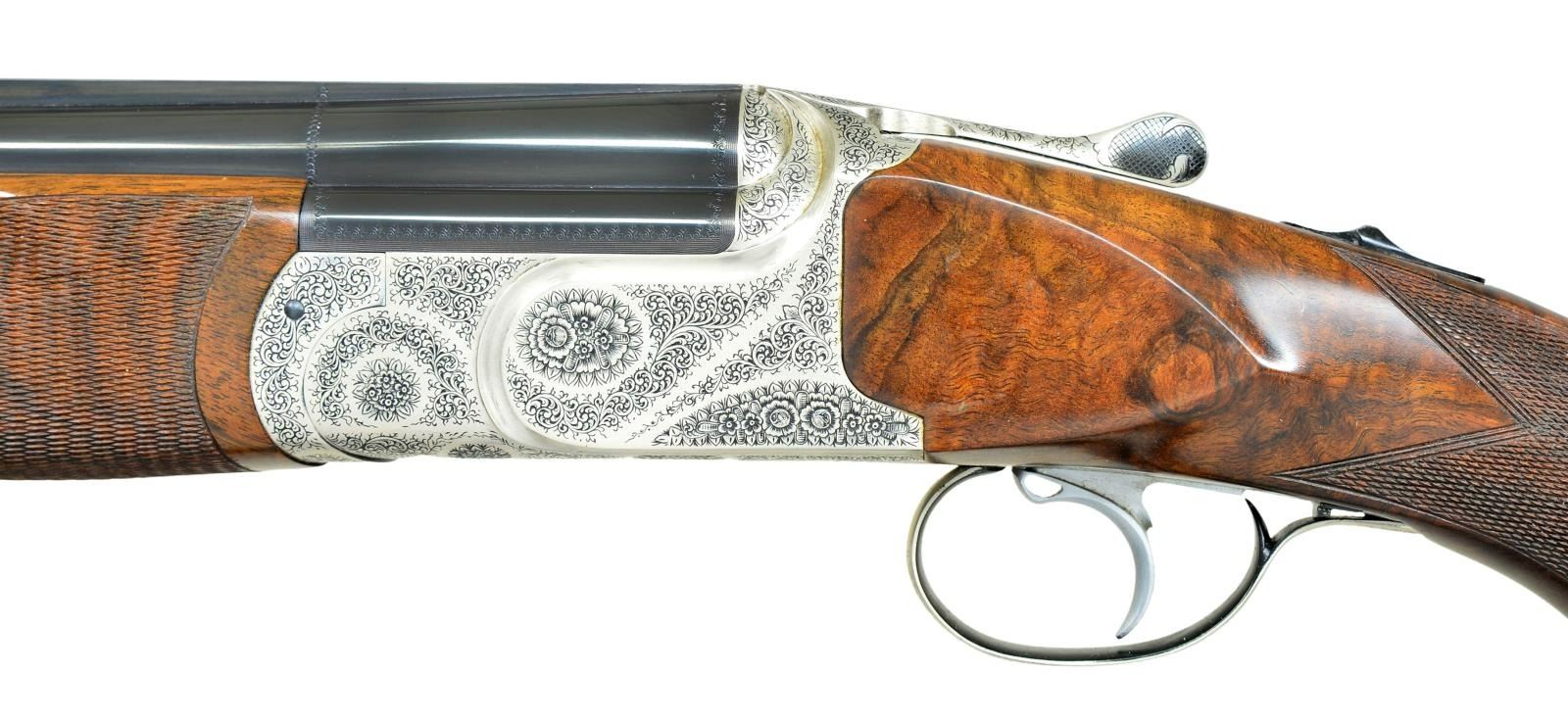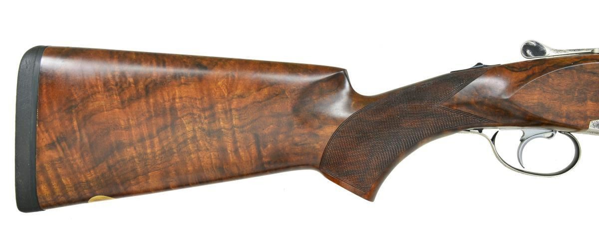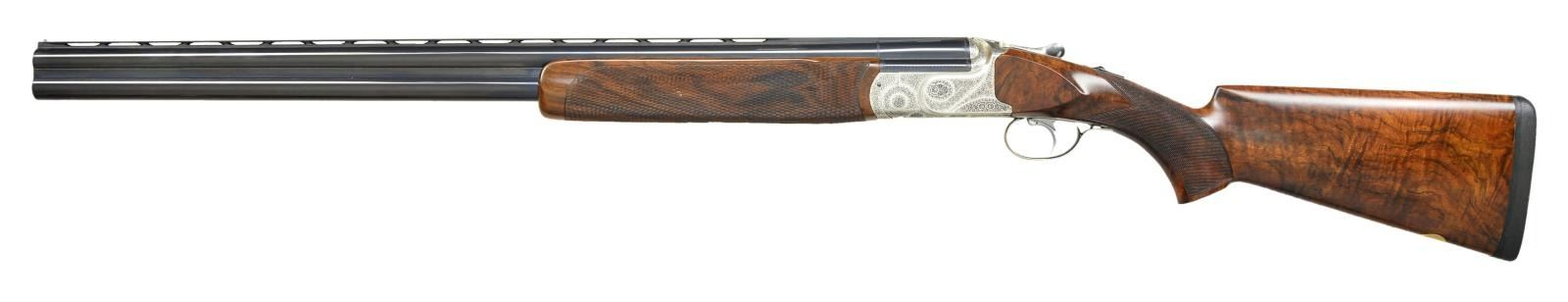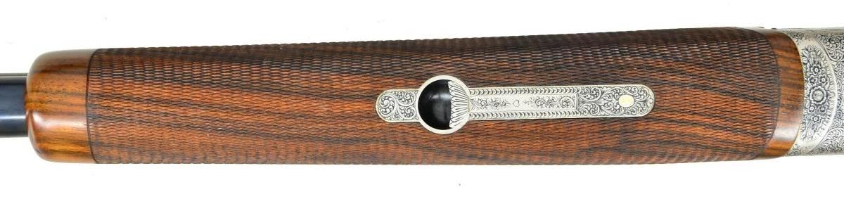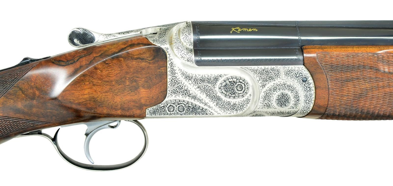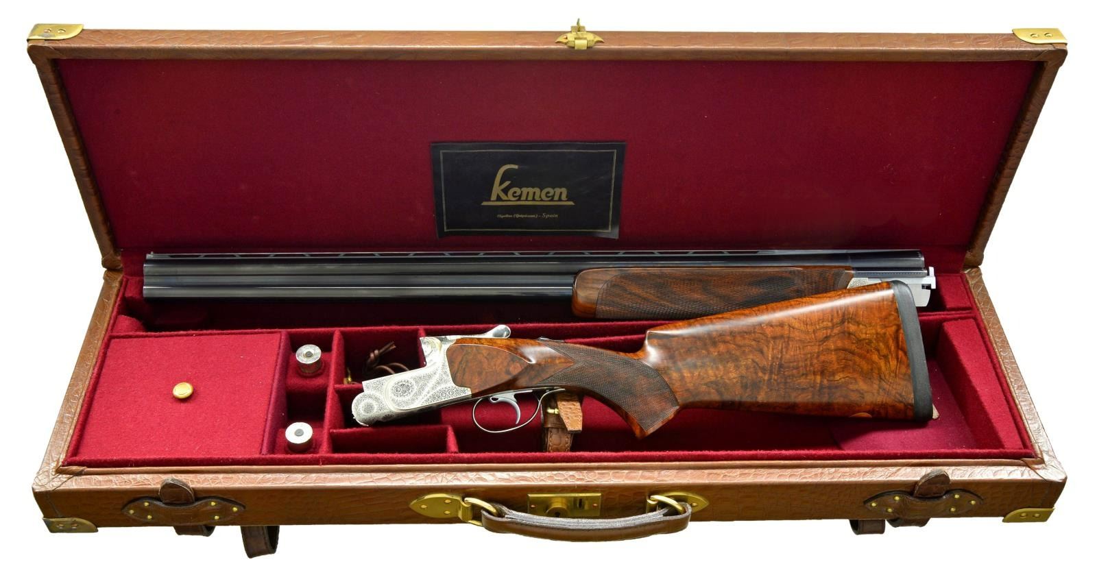 CASE. Cal. 12 Ga., 2 3/4". S# 40.03.03.902. Bbls. 28 3/8" monobloc fitted w/ narrow matted ventilated rib are gold inlaid "Kemen" on top right side of monobloc & are stamped w/ Spanish nitro proofs for 2 3/4" chambers. The number "2" is inlaid at rear portion of rib, matching number found on top lever & forend latch. Bottom of monobloc is stamped w/ serial number & engraved "Made in Spain". Coin finished action w/ removable trigger group having V-springs is fitted w/ automatic safety & single nonselective trigger. Action is engraved w/ very attractive near full coverage sprays of well cut scroll surrounding & accented by rose and floral bouquets. "KEMEN" is emblazoned at top of forend iron mortise. Pistol grip buttstock of exhibition quality, finely marbled & intricately fiddle figured European walnut measures 14 5/8" over black "Kick-eez" pad. Stock features point pattern checkering at grip w/ sm. right hand palm swell & a vacant gold oval on toeline. Matching one piece field type forend has Deeley type release. MEASUREMENTS: BBLS: Bore Diameter: T .726", B .726". Restriction: T .007" (IC), L .007" (IC). STOCK: DAH: 1 3/4". DAC: 1 7/16". LOP: 14 5/8". CAST: neutral. WEIGHT: 7 lb. 13 oz. UNATTACHED ACCESSORIES: gun comes w/ alligator patterned leather case w/ brass trim lined in burgundy cloth. Case contains a Kemen label, pair of boss marked snap caps, toolkit containing spare firing pins & wrench, along w/ three keys. CONDITION: exceptionally fine, appears to be unfired since proof with a small number of handling marks on all wood & metal surfaces, most notably 3 or 4 scratches on left side panel. Mechanically crisp. Case is also very fine. Label has detached from lid. (22-4505/MGM). MODERN. $3,500-5,500.