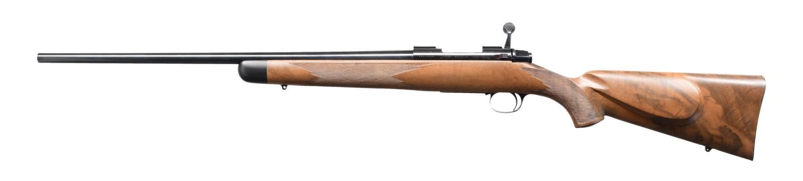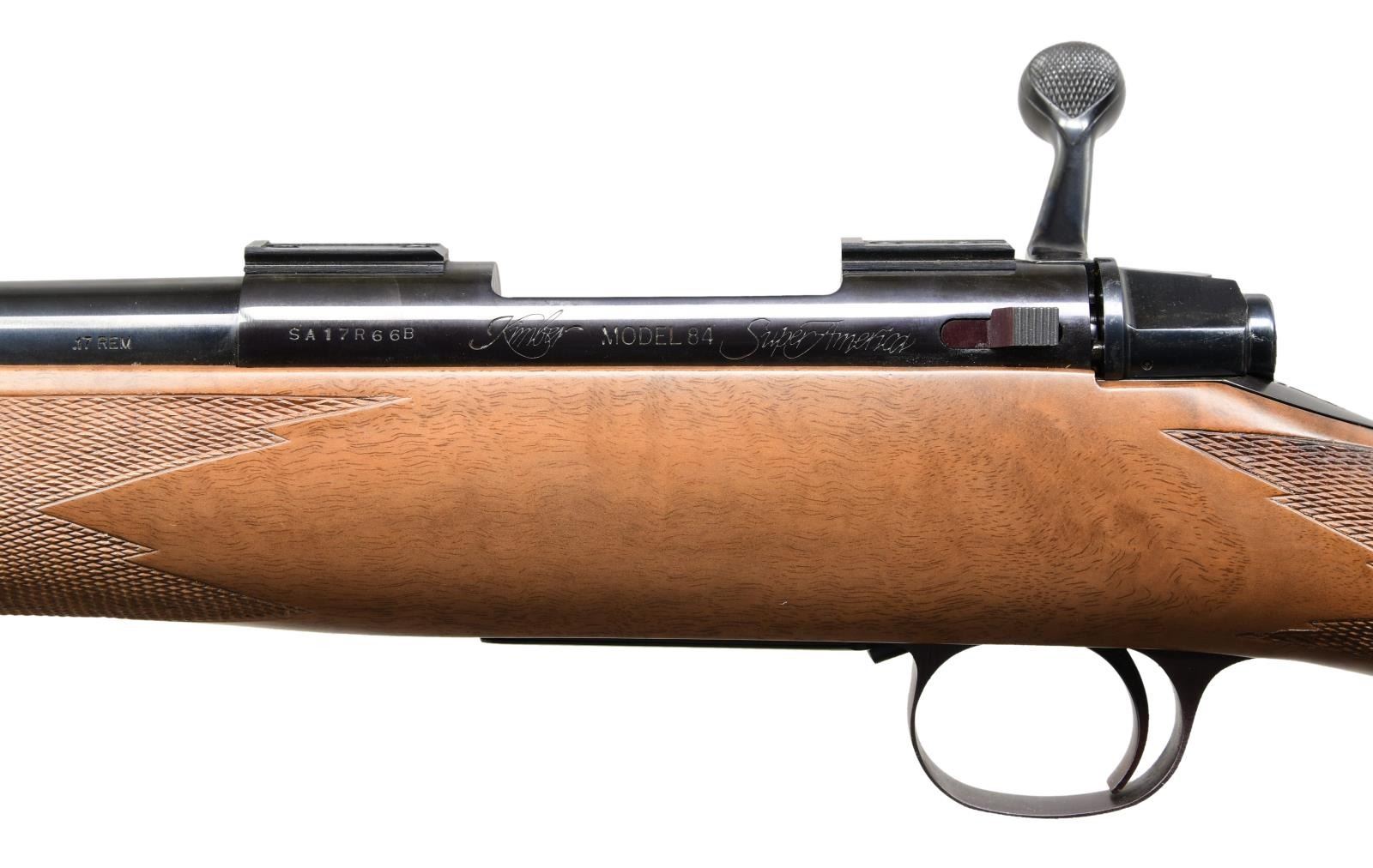 RIFLE WITH MATCHING FACTORY BOX. Cal. 17 Rem. S# SA17R66B. Bbl. 22". Model 84 Super America bolt action rifle mfg. by Kimber. Top of bbl. is marked "KIMBER OF OREGON, INC, CLACKAMAS, OREGON, U.S.A.", with ".17 REM" marked on the left at the breech. Left side of receiver is marked with the S#, followed by the Kimber trademark logo, as well as "MODEL 84 Super America". Metal components exhibit a blue finish overall, save for the bolt body, which is polished in-the-white. Checkered wood pistol grip buttstock features an ebony forearm tip, as well as a blued steel grip cap and checkered buttplate. Bolt is matching the receiver via the last 2-digits of the S# "66", which is electro-penciled on the underside of the bolt root. UNATTACHED ACCESSORIES: matching factory box / styrofoam insert containing factory paperwork. CONDITION: near new, with metal components retaining virtually all of their original factory blue finish overall. Brilliant mirror bore, exhibiting grease, while retaining well defined rifling throughout. Stock is excellent overall. Box shows some mild exterior wear from handling and storage, but otherwise remains sturdy and serviceable. An extremely fine, near new, Kimber Model 84 Super America bolt action rifle, that one would find extremely difficult to upgrade from. (24-1877/MLW). MODERN. $2,000-3,000.