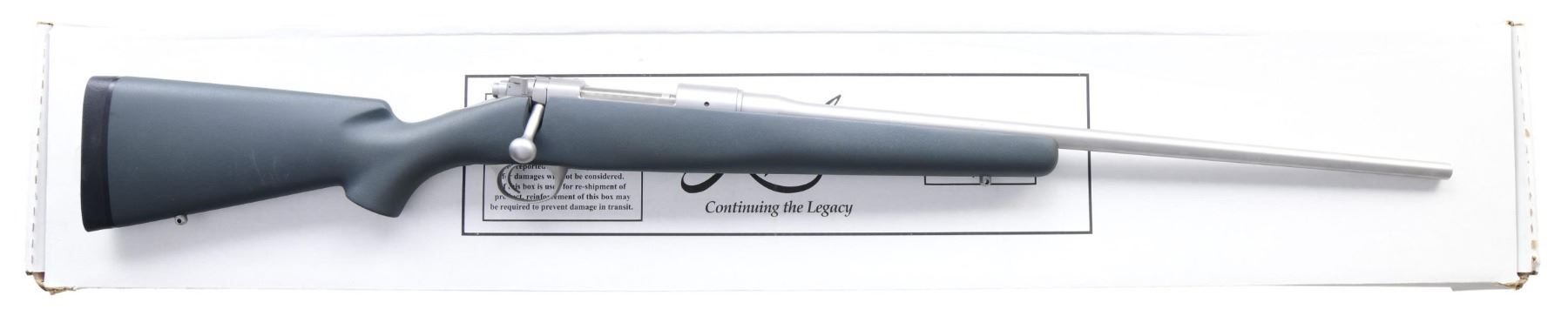 RIFLE WITH MATCHING FACTORY BOX. Cal. 325 WSM. S# KW17765. Bbl. 23 3/4". Model 8400 Montana bolt action rifle mfg. in Yonkers, NY by Kimber. Left side of the bbl. is marked with Kimber's mfg. information, followed by the cal. designation and "MONTANA". Left side of the receiver is marked with the S#, followed by the Kimber trademark logo and "8400". Metal components exhibit a matte stainless steel finish overall. 1-piece gray carbon fiber reinforced pistol grip buttstock. Bolt is matching to the receiver via "765" on the underside of the bolt root. UNATTACHED ACCESSORIES: matching factory box. CONDITION: near new, with metal components retaining virtually all of their original factory finish overall. Mirror bore, exhibiting areas of grease, while retaining well defined rifling throughout. Stock is excellent overall. Box shows some exterior wear from handling and storage, but otherwise remains sturdy and serviceable. (24-3704/MLW). MODERN. $800-1,200.