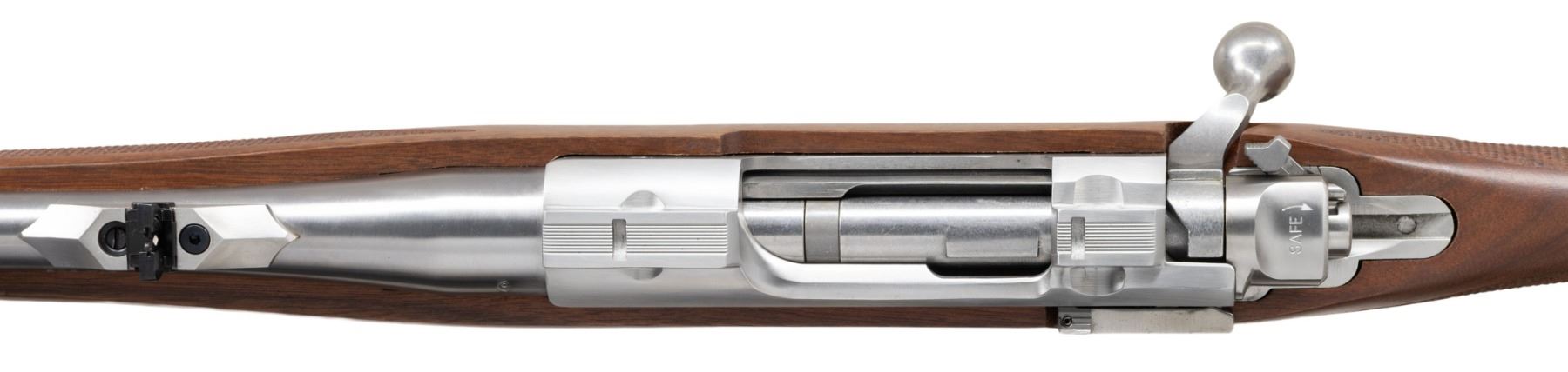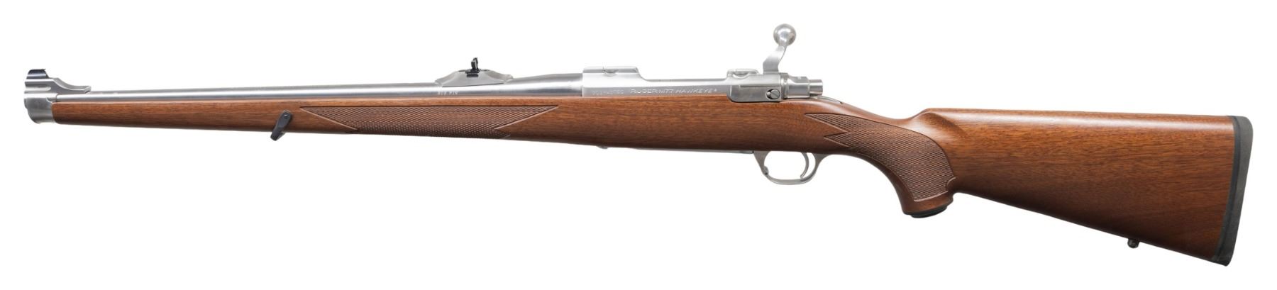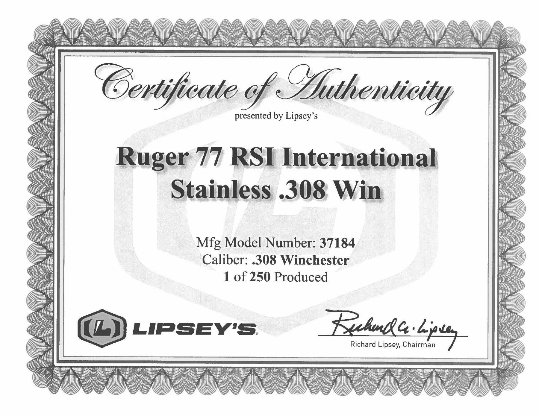 RSI INTERNATIONAL 308 WIN. BOLT ACTION RIFLE WITH CERTIFICATE OF AUTHENTICITY & MATCHING FACTORY BOX. Cal. 308 Win. S# 711-43766. Per COA, 1 of 250 Shipped 2011 as Model 37184. Bbl. 18.5". Brushed stainless steel finish. Gold bead band mounted front sight & island mounted folding leaf adj. rear sight. Integral ring groove action w/ claw extractor, & matching numbered bolt. Floorplate has laser engraved Ruger emblem. Checkered International walnut stock w/ sling stud, forearm swivel, Ruger grip cap & red pad. UNATTACHED ACCESSORIES: matching numbered box containing lock, Ruger rings, swivel & paperwork. Certificate of Authenticity. CONDITION: as NIB (24-3718/MD). MODERN. $800-1,200.