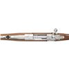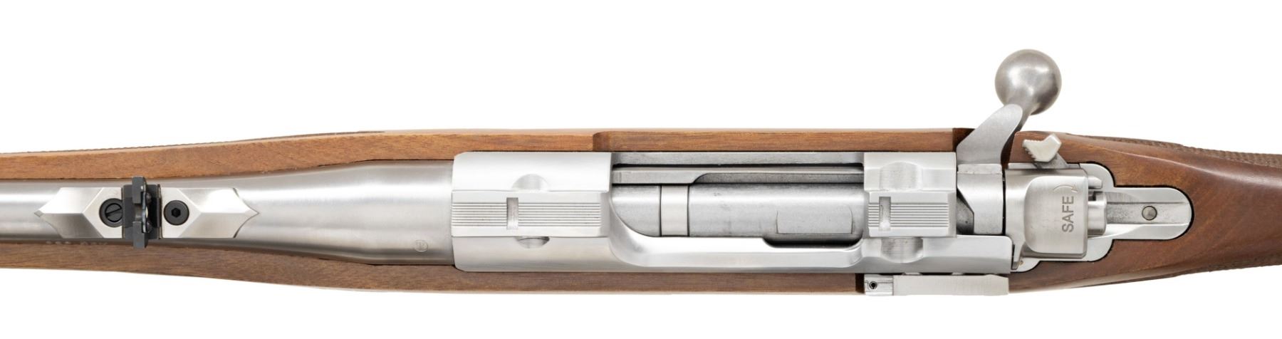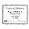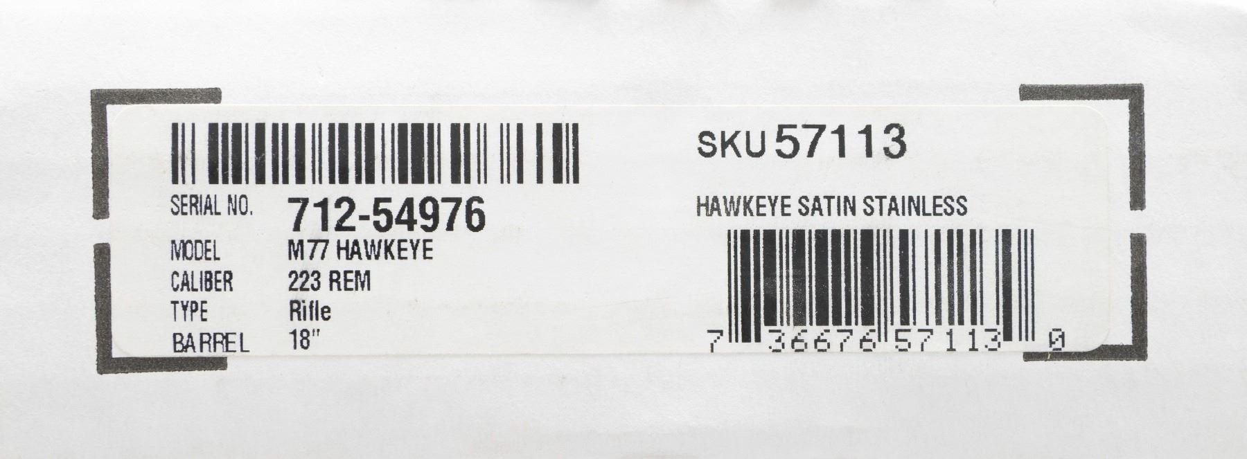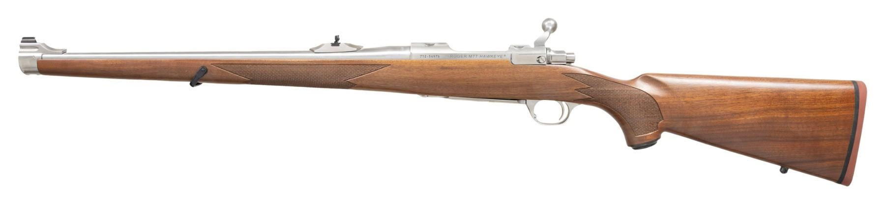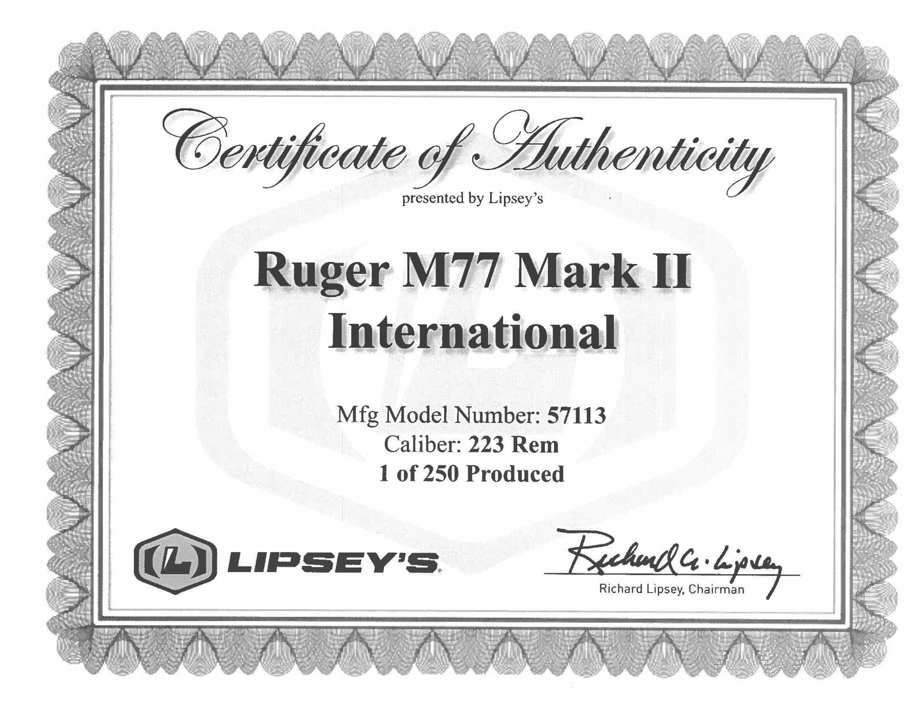 INTERNATIONAL 223 REM. BOLT ACTION RIFLE WITH CERTIFICATE OF AUTHENTICITY & MATCHING FACTORY BOX. Cal. 223 Rem. S# 712-54976. Per COA, 1 of 250 Shipped 2019 as Model 57113; Certificate says it's Mark II, but is actually Hawkeye. Bbl. 18.5". Brushed stainless steel finish. Gold bead band mounted front sight & island mounted folding leaf adj. rear sight. Control feed action w/ claw extractor, integral ring grooves & matching numbered bolt; internal box magazine follower has been shortened for 223 cartridge having metal filler. Floorplate has laser engraved Ruger emblem. Checkered International walnut stock w/ sling stud, forearm swivel, Ruger grip cap & red pad. UNATTACHED ACCESSORIES: matching numbered box containing lock, Ruger rings & paperwork. Certificate of Authenticity CONDITION: as NIB (24-3189/MD). MODERN. $800-1,200.