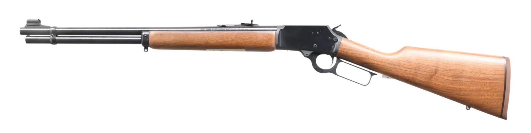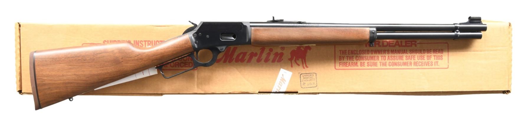 MATCHING FACTORY BOX. Cal. 44-40. S# 44400317. Bbl. 20 1/4". Model 1894S lever action rifle, mfg. by Marlin Firearms Co. Left side of the bbl. is marked with Marlin's mfg. information above the model and cal. designations, with an encircled "JM" inspection proof stamped at the breech. Upper receiver tang is marked with the S#. Metal components exhibit a blue finish overall, with the top and lower straps of the receiver exhibiting a matte blue finish. Plain wood straight grip buttstock and forend. Ramped, hooded, and brass beaded blade front sight, with U-notch rear sight. Rifle retains its original "TESTED/ AND/ TARGETED/ BY" sticker on the underside of the forearm, as well as its parts list and warranty card on the lever. UNATTACHED ACCESSORIES: matching factory box. CONDITION: near new, with metal components retaining virtually all of their original factory blue finishes overall. Mirror bore, exhibiting well-defined rifling throughout. Wood furniture is excellent overall. Box shows some light to mild exterior wear from handling and storage, but otherwise remains sturdy and serviceable. (24-4990/MLW). MODERN. $1,500-2,000.