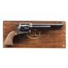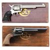 SINGLE ACTION ARMY REVOLVERS WITH BOXES & ACCESSORIES. 1) SINGLE ACTION ARMY FRONTIER SIX SHOOTER. Cal. 44-40. S# 566PC. Bbl. 7 1/2". Single Action Army Frontier Six Shooter single action revolver mfg. by Colt commemorating 100 years of the Single Action Army. The left side of the bbl. is marked "COLT FRONTIER SIX SHOOTER" within a panel, with Colt's single line address marked across the top, and with"1873 PEACEMAKER CENTENNIAL 1973" marked on the right. Left side of frame is marked with the usual 2-line patent markings. Metal components exhibit a bright nickel plated finish overall. Frame is mounted with 2-piece Colt checkered black plastic grips. Black powder pattern frame (with screw retained cyl. base pin) and donut style ejector rod head. Standard SAA pattern blade front sight and frame notched rear sight. All serialized parts are matching and include the frame, cyl., loading gate, trigger guard, backstrap (on butt), as well as the grips. UNATTACHED ACCESSORIES: original factory box, containing factory paperwork. CONDITION: near new, with metal components retaining virtually all of their original factory nickel plated finish overall. Mirror bore, exhibiting well defined rifling throughout. Grips are excellent overall. Box shows some superficial exterior wear from handling and storage, but otherwise remains sturdy and serviceable. (24-5016/MLW). 2) SINGLE ACTION ARMY CAVALRY MODEL SINGLE ACTION REVOLVER. Cal. 45 Colt. S# PC566. Bbl. 7 1/2". Single Action Army Cavalry Model single action revolver mfg. by Colt commemorating 100 years of the SAA. Left side of the bbl. is marked "1873 PEACEMAKER CENTENNIAL 1973", with Colt's single line address marked across the top. Left side of frame is marked with the usual 2-line patent markings, followed by "U.S.". Frame, hammer, and loading gate exhibit a case color hardened finish, with remaining components including the cyl., bbl., ejector rod housing, trigger guard, and rear grip strap exhibiting a blue finish overall. Frame is mounted with a 1-piece smooth wood grip, which is stamped with a boxed cartouche on the left side. Black powder pattern frame (with screw retained cyl. base pin) and donut style ejector rod head. Standard SAA pattern blade front sight and frame notched rear sight. All serialized parts are matching and include the frame, cyl., trigger guard, backstrap (on butt), as well as the loading gate. UNATTACHED ACCESSORIES: original factory box, containing factory paperwork. Revolvers are also accompanied by their shipping box, containing a wood display case, as well as a brown leather display case. CONDITION: near new, with metal components retaining virtually all of their original factory finishes overall, with a very light superficial scratch present on the left side of the bbl., just to the rear of the muzzle. Cyl. exhibits a dragline between two of the cyl. stops, but otherwise remains excellent overall. Mirror bore, exhibiting well defined rifling throughout. Grip is excellent overall. Box shows some superficial exterior wear from handling and storage, with a small tear present at one corner. Wood and leather display cases are excellent overall. An exceptionally attractive pair of revolvers, commemorating the 100th anniversary of Colt's iconic Single Action Army. (24-5017/MLW). BOTH CURIO. $3,500-5,000.