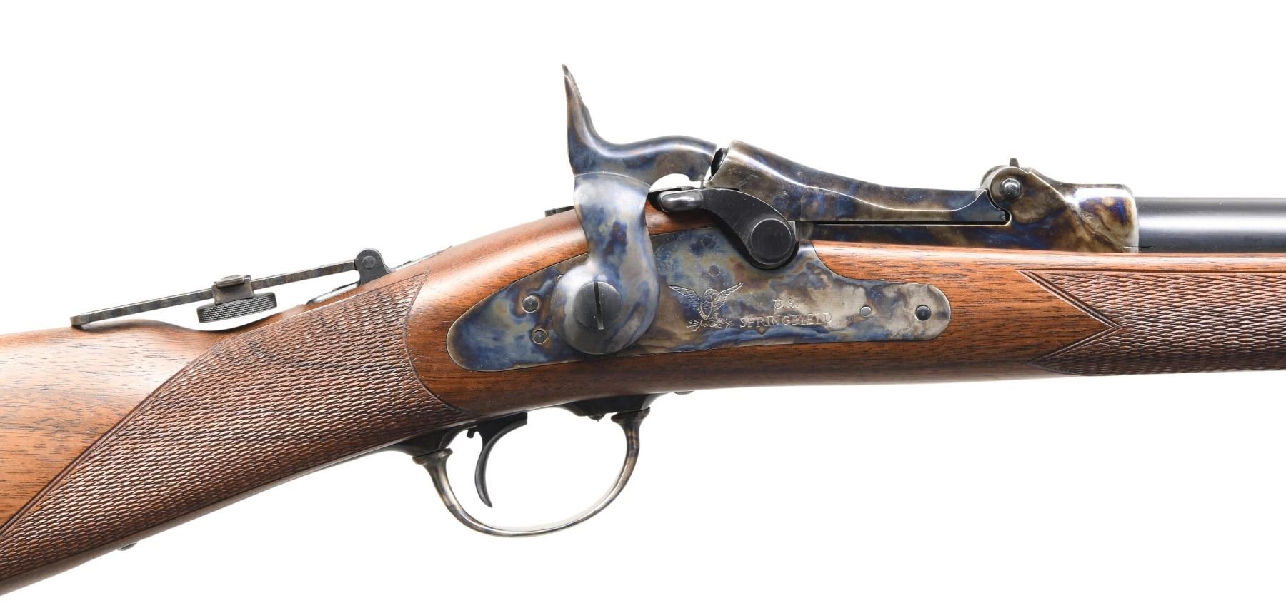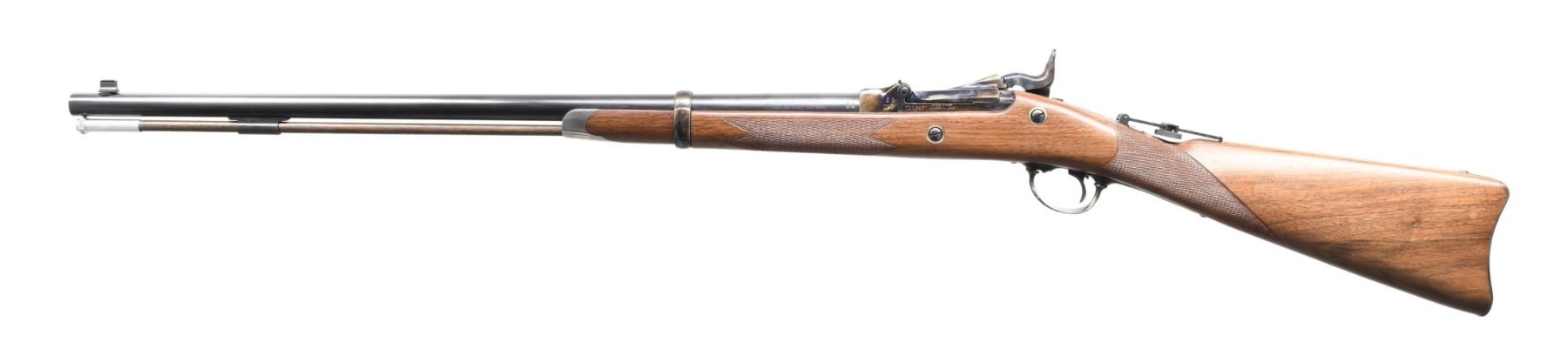 SINGLE SHOT BREECHLOADING RIFLE WITH MATCHING FACTORY BOX. Cal. 45-70. S# TD1147. Bbl. 26". Trapdoor Officer Model single shot breechloading rifle, mfg. in Italy by Pedersoli and imported by Navy Arms. Left side of the bbl. is marked with the S#, followed by Pedersoli's "dp" logo and the cal. designation, with the S# and Navy Arms' importer information being marked on the left side of the receiver. Sideplate is marked with a patriotic eagle, followed by "U.S./ SPRINGFIELD". Receiver, breechblock, sideplate, hammer, trigger guard, buttplate, and bbl. band exhibit a case color hardened finish overall. Bbl. breechblock latch and rear sight assembly exhibit a blue finish. One-piece checkered wood straight grip stock with polished in-the-white steel nose cap. Brass beaded blade front sight, with tang-mounted aperture rear sight. UNATTACHED ACCESSORIES: matching factory box containing a factory manual and Pedersoli VHS tape. CONDITION: near new, with metal components retaining virtually all of their original factory finishes overall. Mirror bore, exhibiting a light layer of grease while retaining well-defined rifling throughout. Wood furniture is excellent overall. Box shows some light exterior wear from handling and storage but otherwise remains sturdy and serviceable. (24-5009/MLW). MODERN. $800-1,200.