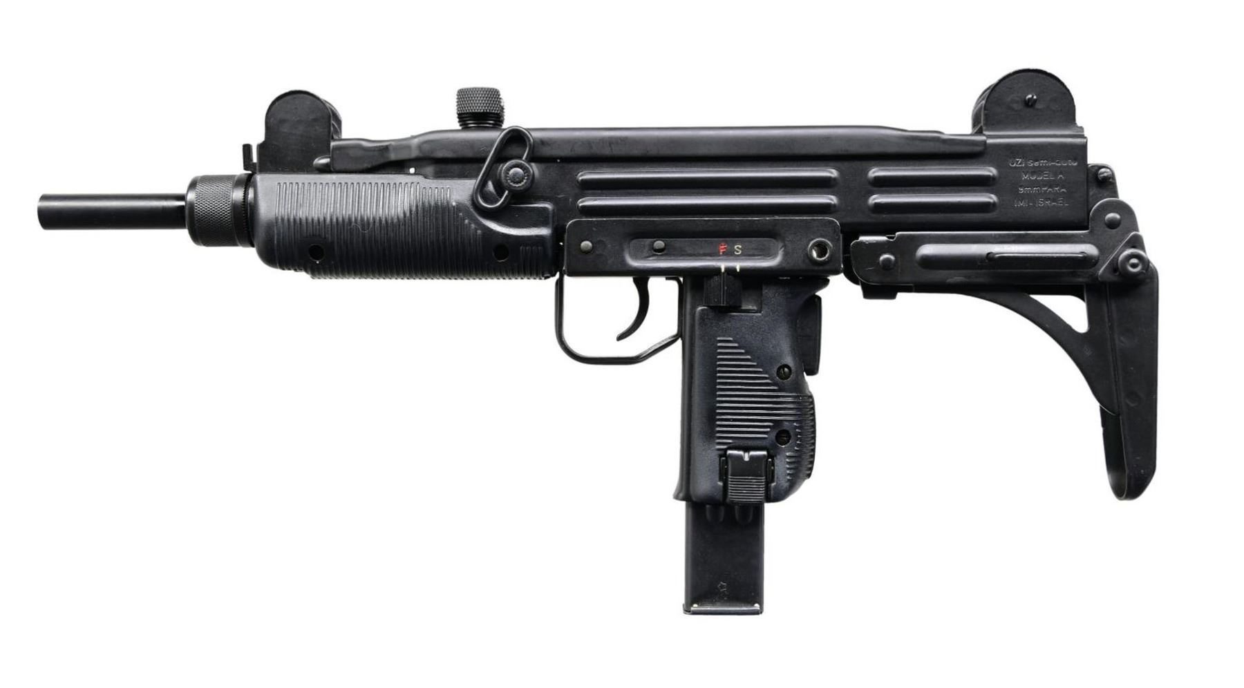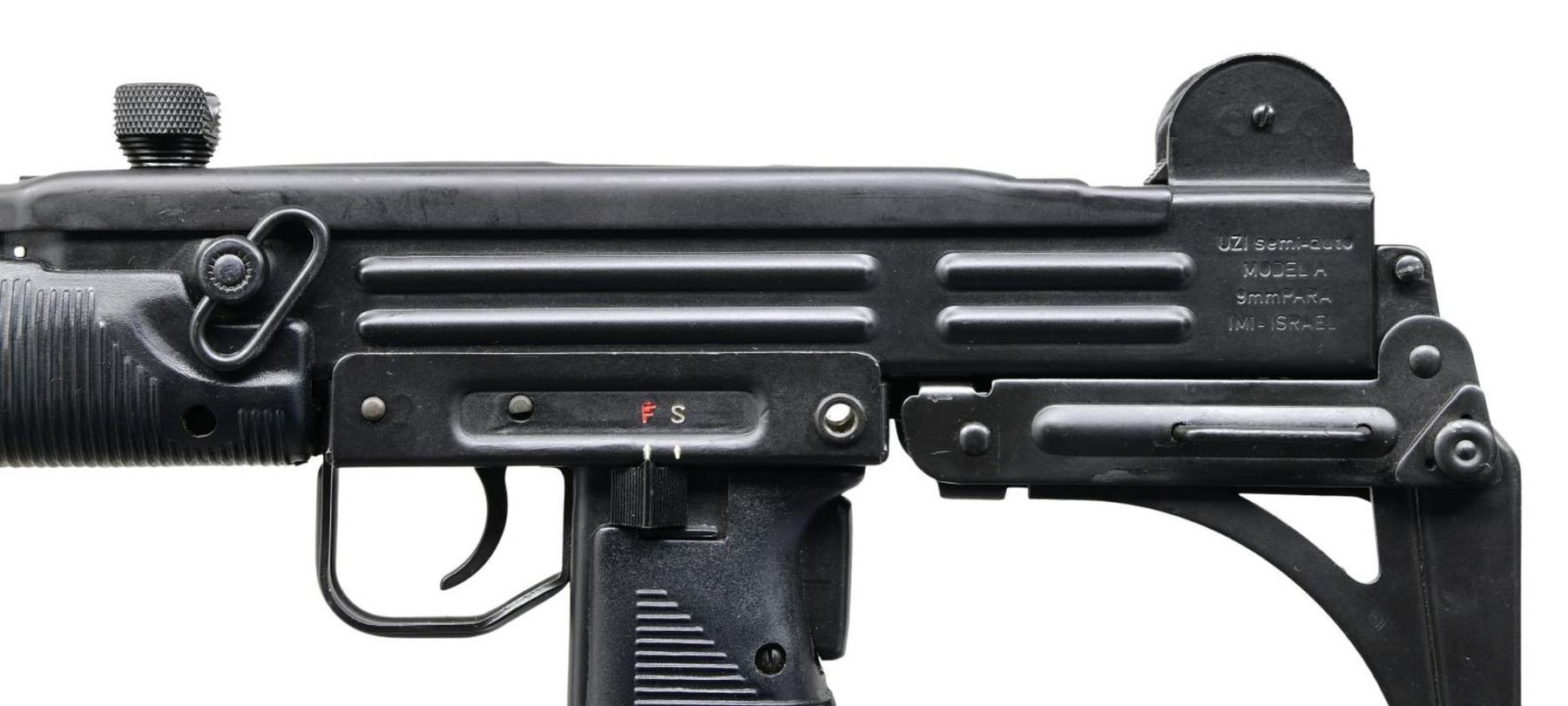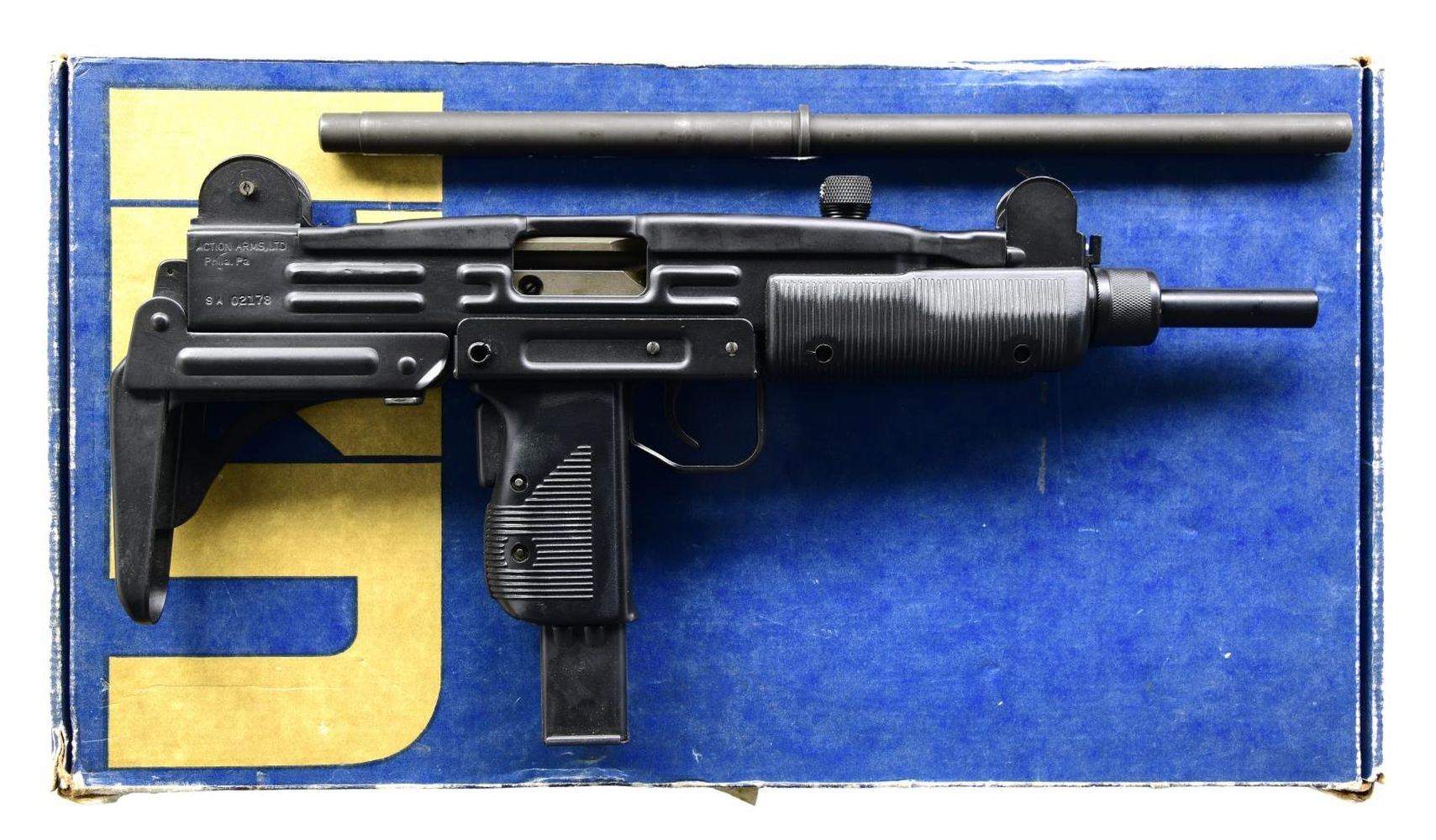 SEMI-AUTOMATIC CARBINE WITH MATCHING FACTORY BOX & ACCESSORIES. Cal. 9x19mm Parabellum. Cal. 9x19mm Parabellum. S# SA02178. Bbl. 16 1/8". Uzi Model A semi-automatic carbine mfg. by in Israel by IMI and imported by Action Arms. Left side of receiver is marked "UZI semi-auto/ MODEL A/ 9mmPARA/ IMI - ISRAEL", with Action Arms' importer information and the S# marked on the right. Bbl. is stamped with the last 3-digits of the S#. Metal components exhibit a black enamel finish, with the bbl. exhibiting a parkerized finish. 2-piece grooved black plastic grips and handguards. Standard Uzi Model A pattern front and rear sights, with distinctive Uzi pattern collapsible buttstock. Receiver is currently fitted with its faux display bbl. MAGS: 1 25-rd. UNATTACHED ACCESSORIES: matching factory cardboard box containing a matching factory styrofoam insert lid, matching manual, mag., as well as a canvas khaki web sling. CONDITION: near new, with metal components retaining virtually all of their original factory finish overall. Bbl. exhibits some light thinning and edge wear, likely from assembly and disassembly on the gun. Bbl. retains a brilliant mirror bore, exhibiting well defined rifling throughout. Polymer furniture is excellent overall. Box shows moderate exterior wear, no longer retaining its carry handle, with creasing and some tearing present along the edges. A very nice example of an always desirable IMI Uzi Model A, imported by Action Arms. PROVENANCE: Lifelong Collection of Terrance McCarty. (24-310/MLW). MODERN. $1,200-2,000.