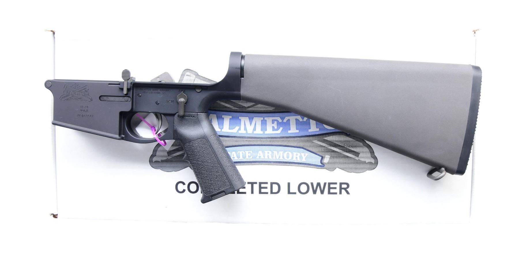 MATCHING FACTORY BOX. Cal. N/A. S# PF053542. Complete PF-10 lower receiver, mfg. by Palmetto State Armory. Left side of the receiver is marked with PSA's logo above "PA-10/ MULTI" and the S#", followed by PSA's mfg. information. Lower exhibits a matte black finish, with small parts exhibiting either a parkerized or nickel-plated finish. Black polymer A2 pattern buttstock (with trapdoor) and textured Magpul MOE pistol grip. UNATTACHED ACCESSORIES: matching factory box with additional rear grip straps. CONDITION: near new, with metal components retaining virtually all of their original factory finishes overall. Polymer furniture is excellent, with a few light superficial handling marks present on the buttstock. Box shows light to mild exterior wear but otherwise remains sturdy and serviceable. PROVENANCE: the estate collection of Charles Wagner. (24-4674/MLW). MODERN. $200-400.