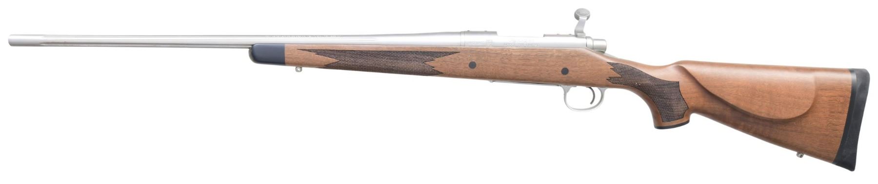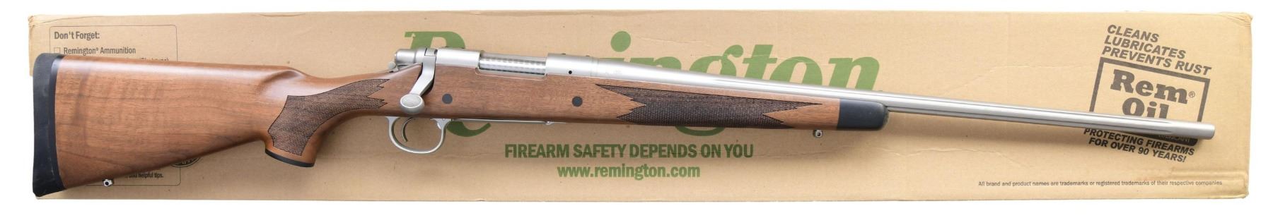 BOLT ACTION RIFLE WITH MATCHING FACTORY BOX. Cal. 223. S# RR21189F. Bbl. 24". Model 700 CDL Limited Edition bolt action rifle mfg. by Remington in 2014. Left side of the fluted bbl. is marked with Remington's mfg. information and the cal. designation, with the left side of the receiver being marked with the S#, followed by the Remington trademark logo above "MODEL 700 LIMITED". Floorplate is engraved "50th/ Anniversary/ 1964-2014" above "223 Remington" in front of a bullet. Metal components exhibit a satin stainless steel finish, save for the aluminum trigger guard and hinged floorplate, which exhibit a gray enamel finish. Bolt body is jeweled. 1-piece checkered wood pistol grip buttstock with cheek rest and black tipped forend. Receiver is factory drilled and tapped. Bolt is matching to the receiver via "1189". UNATTACHED ACCESSORIES: matching factory box, containing factory paperwork. CONDITION: near new, with metal components retaining virtually all of their original factory finishes overall. Mirror bore, exhibiting some grease, while retaining well defined rifling throughout. Wood stock is excellent overall. Box shows some exterior wear from handling and storage, but otherwise remains sturdy and serviceable. (24-4345/MLW). MODERN. $1,000-1,300.