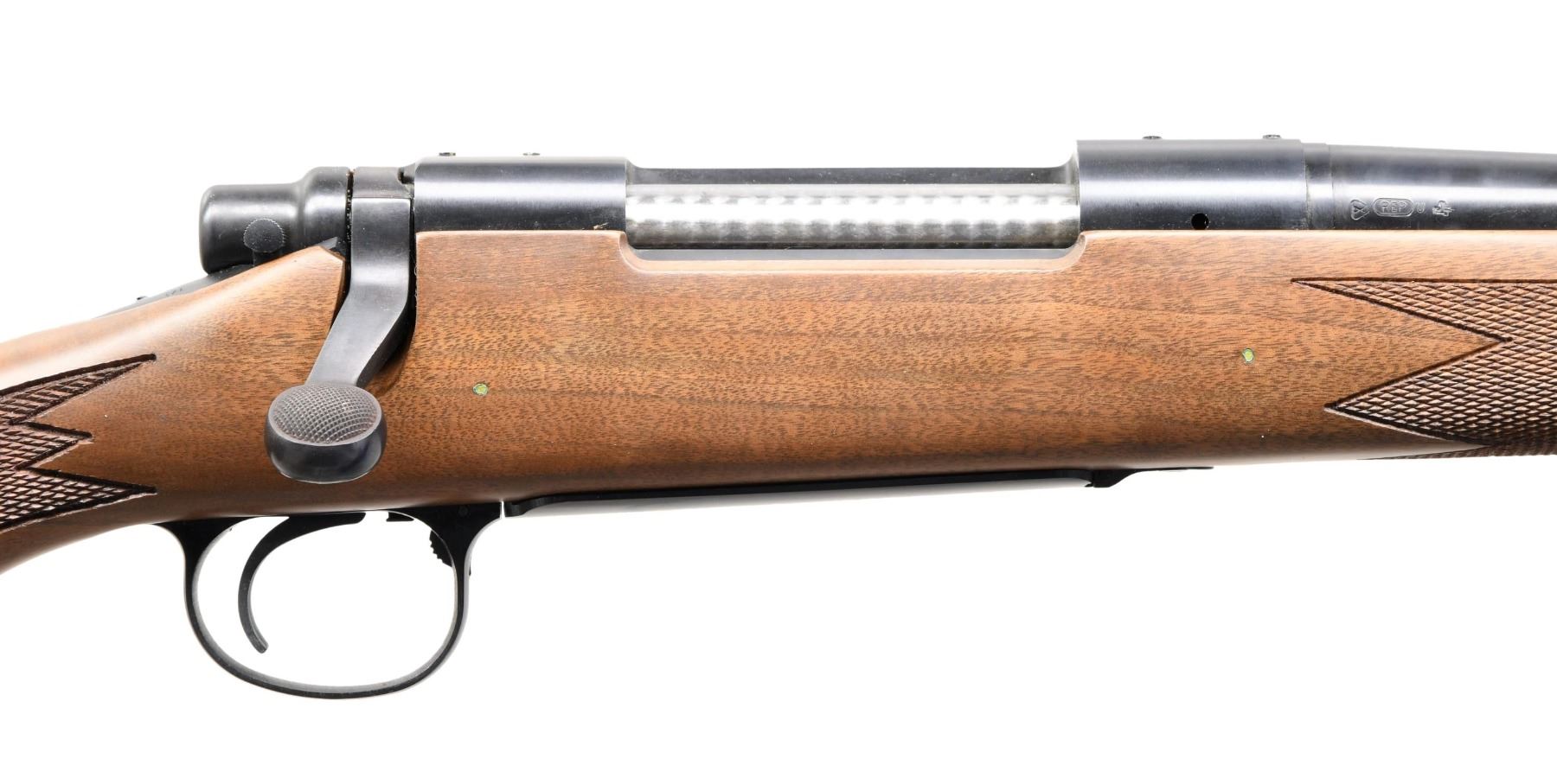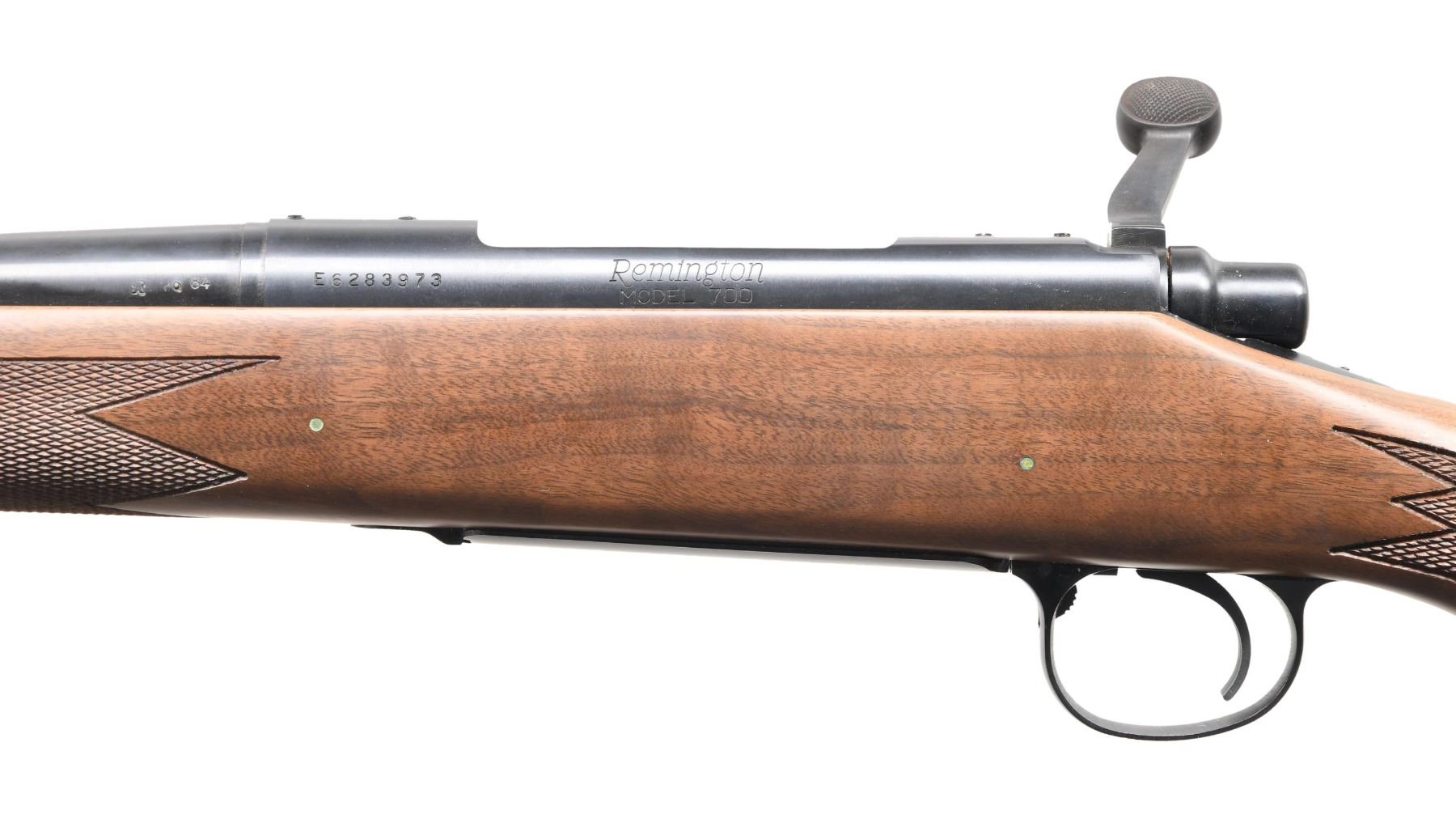 EDITION BOLT ACTION RIFLE WITH MATCHING FACTORY BOX. Cal. 375 H&H Mag. S# E6283973. Bbl. 24". Model 700 Classic Limited Edition bolt action rifle mfg. by Remington in 1996. Left side of the bbl. is marked with Remington's mfg. information and the cal. designation. Left side of the receiver is marked with the S#, followed by the Remington trademark logo above "MODEL 700". Metal components exhibit a blue finish overall, save for on the aluminum trigger guard and floorplate, which exhibit a black enamel type finish. Bolt body is jeweled. 1-piece checkered wood pistol grip buttstock, with Remington brown rubber recoil pad. Ramped blade front sight, with U-notch rear sight. Tip of front sight appears to have been nicked at one time on the rear face. Receiver is factory drilled and tapped. Bolt is matching to the receiver via "3973" on the body. UNATTACHED ACCESSORIES: matching factory box, containing factory paperwork. CONDITION: near new, with metal components retaining virtually all of their original factory finishes overall, save for the aforementioned nick on the rear of the front sight. Mirror bore, exhibiting grease, while retaining well defined rifling throughout. Stock is excellent overall. Box shows some light wear from handling and storage, but otherwise remains sturdy and serviceable. (24-4312/MLW). MODERN. $1,000-1,500.