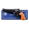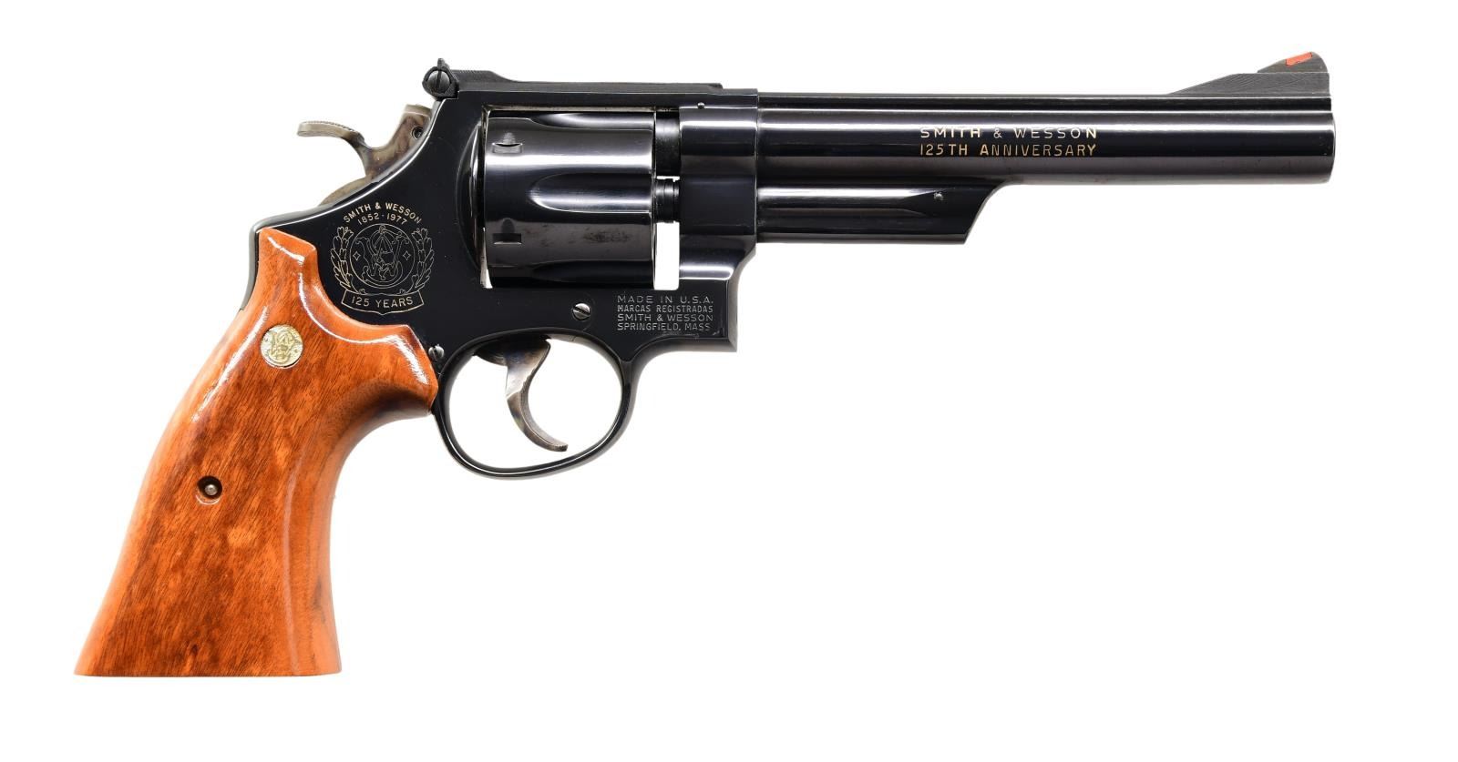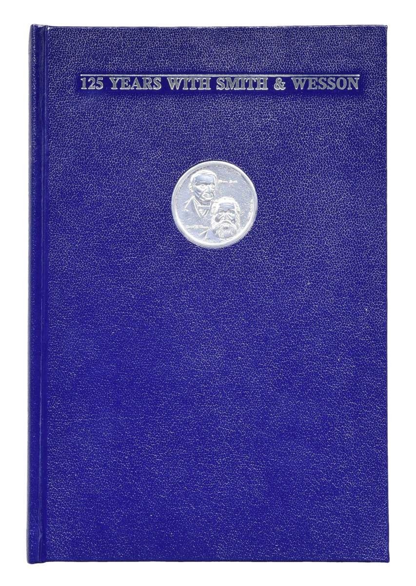 ANNIVERSARY DOUBLE ACTION REVOLVER WITH MATCHING FACTORY BOX, DISPLAY CASE, & BOOK. Cal. 45 Colt. S# SW2823. Bbl. 6 1/2". Model 25-3 double action revolver mfg. by Smith & Wesson to commemorate Smith & Wesson's 125th Anniversary. Left side of the bbl. is marked "45 CALIBER", with "SMITH & WESSON/ 125TH ANNIVERSARY" marked on the right. Right side of frame is marked "SMITH & WESSON/ 1852 . 1977" above the S&W trademark logo (which is flanked by 2 foliate motifs) and "125 YEARS" within a banner/ Frame, cyl., and bbl. exhibit blue finish, with the trigger grooved trigger and checkered hammer exhibiting a case color hardened finish. Frame is mounted with 2-piece S&W medallion smooth wood grips. Serrated blade front sight with adj. square notch rear sight. UNATTACHED ACCESSORIES: matching factory cardboard box containing a copy of "125 Years with Smith & Wesson" by Roy G. Jinks, an S&W revolver box, as well a commemorative display case featuring a blue velvet interior and containing the commemorative lid plaque, the key, as well as a commemorative coin. CONDITION: near new, with metal components retaining virtually all of their original factory finishes, exhibiting a thin layer of what appears to be factory grease overall. Mirror bore, exhibiting well defined rifling throughout. Grips are excellent overall. Display case is en suite. Box shows some mild exterior wear from handling and storage, but otherwise remains sturdy and serviceable. (24-2360/MLW). MODERN. $1,000-1,500.