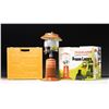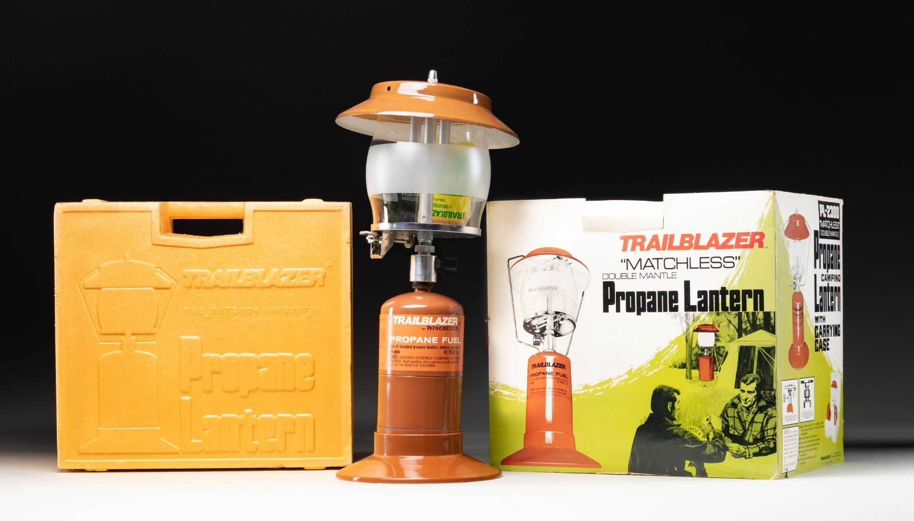 PL-2300 LANTERN WITH FACTORY BOX. Trailblazer Model PL-2300 matchless propane lantern. Glass lantern housing exhibits standard Trailblazer markings, with the addition of the Winchester trademark logo. Synthetic and some metal components exhibit a brown painted finish. Kit is complete, consisting of the lantern, brown synthetic base, and brown propane canister. UNATTACHED ACCESSORIES: factory cardboard sleeve with yellow styrofoam packaging. CONDITION: lantern is virtually new, exhibiting few light superficial handling marks. Cardboard sleeve exhibits age related discoloration, a couple of minor tears, some minor creasing, as well as some small scattered spots of moisture related staining. PROVENANCE: Norman Olliff Estate. (02-25720/MLW). NON-GUN. $25-50.