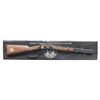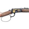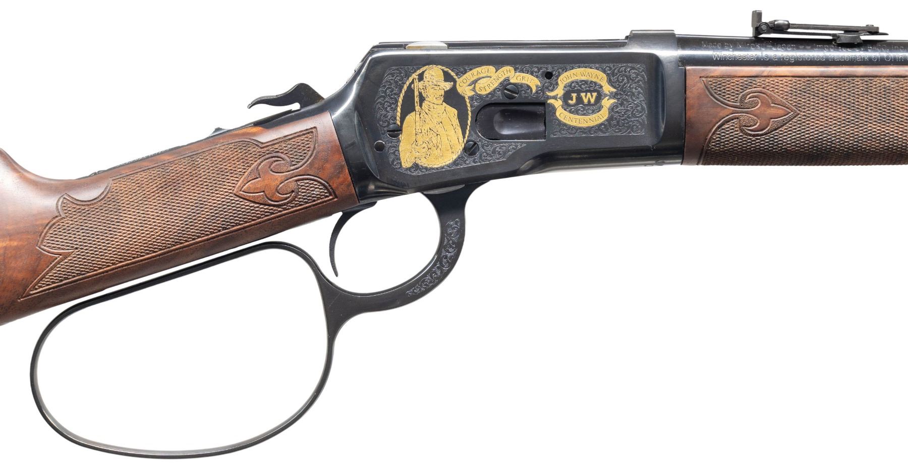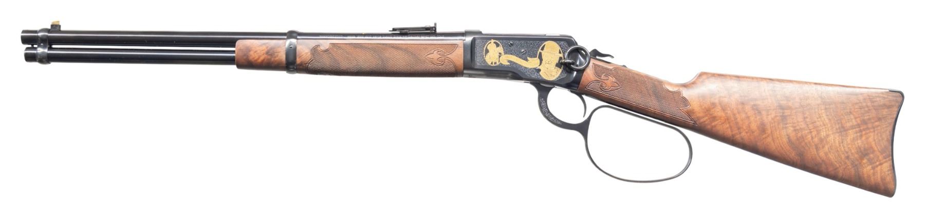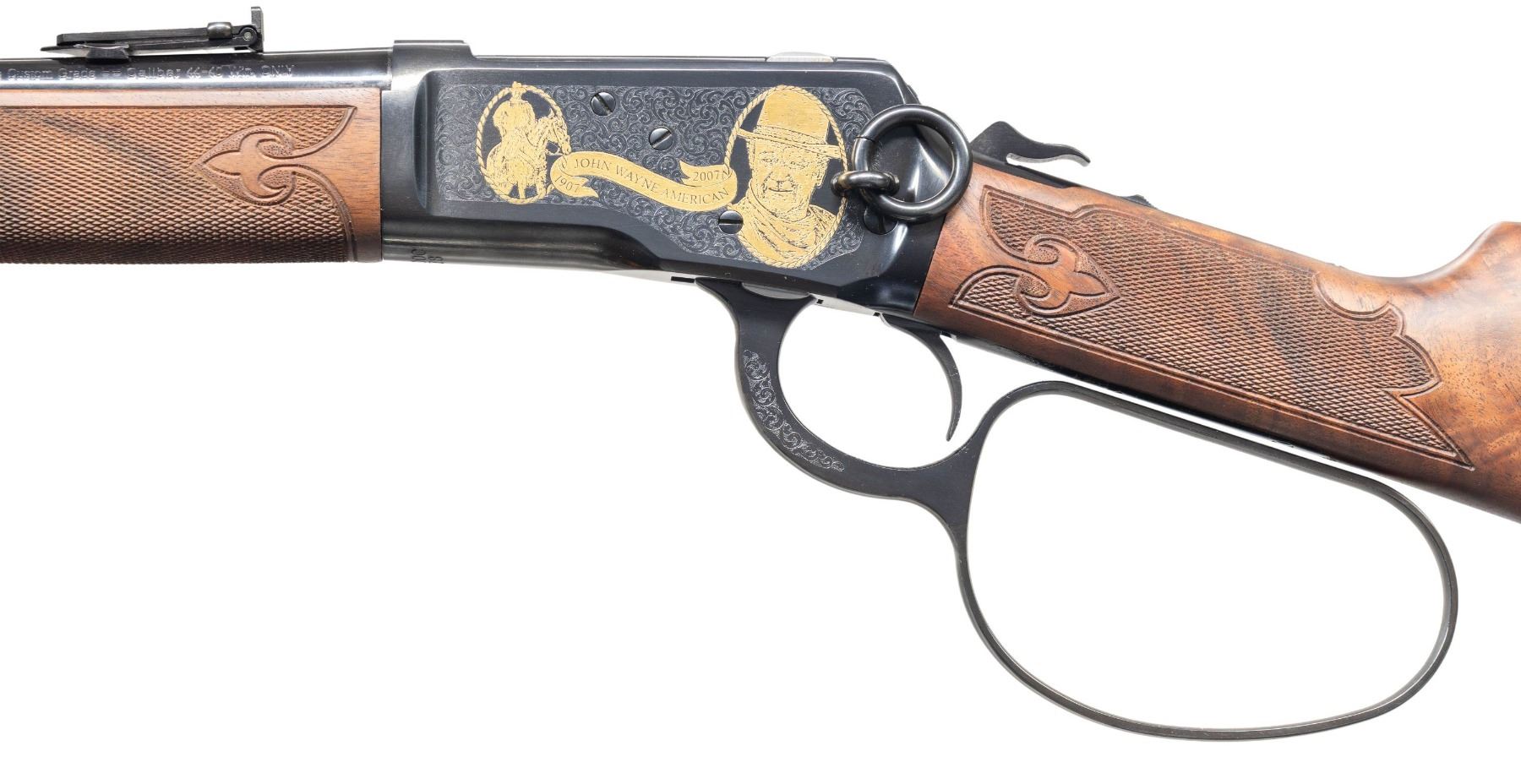 ANNIVERSARY CUSTOM GRADE LEVER ACTION CARBINE WITH MATCHING FACTORY BOX. Cal. 44-40. S# JW100C0278. Bbl. 18 1/2". 1 of only 1,000 Model 1892 John Wayne Custom Grade lever action carbines mfg. in Japan by Miroku and imported by BACO for Winchester commemorating John Wayne's centennial. The left side of the bbl. is marked with the Winchester trademark logo, followed by "Model 1892 John Wayne Custom Grade" as well as the cal. designation, with Miroku's mfg. and BACO's importer information marked on the right. Top of the bbl. is marked with John Wayne's signature in gold characters. Sides of the receiver feature scroll engraving, which extends to the sides of the lever. Left side of the receiver features a gold inlaid vignette of John Wayne on horse back, followed by a gold banner that reads "1907", JOHN WAYNE AMERICAN", and "2007", as well as a gold portrait of John Wayne, with the right side of the receiver featuring a gold inlaid vignette of John Wayne, followed by a banner reading "COURAGE", "STRENGTH", and "GRIT", as well as a "JW" between two banners that read "JOHN WAYNE" and "CENTENNIAL". Metal components exhibit a high polish blue finish overall. Single band fastened high grade satin finished checkered wood forearm and straight grip buttstock (with blued steel carbine buttplate) feature fleur-de-lis accents. Pinned brass blade front sight with dovetailed U-notch ladder rear sight. Receiver features a saddle staple and ring, with a tang sliding safety and enlarged loop lever. UNATTACHED ACCESSORIES: matching factory box with cardboard sleeve. CONDITION: near new, with metal components retaining virtually all of their original factory finish overall. Lever loop retains its factory hang tag. Brilliant mirror bore, retaining well defined rifling throughout. Proper manual mechanics. Wood furniture shows a few small and light superficial marks from handling and storage, but otherwise remains excellent overall. Box and sleeve show some wear from handling and storage, but otherwise remain sound. An exceptional example of a rare Winchester 1892 John Wayne 100th Anniversary Custom Grade carbine. (25-5788/MLW). MODERN. $2,000-3,000.