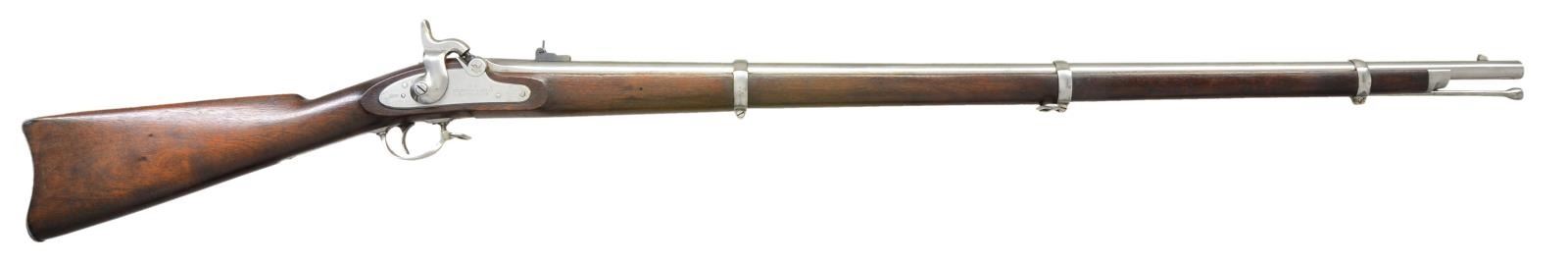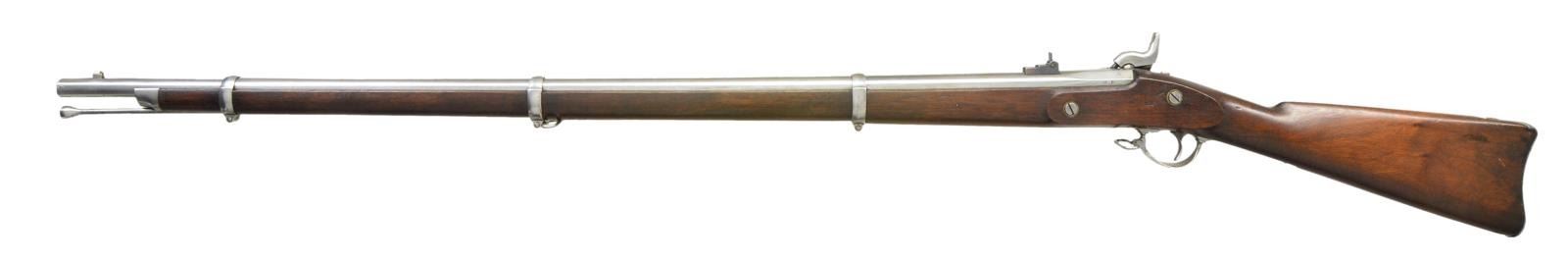 RIFLE-MUSKET. Cal. 58. NSN. Bbl. 40” round w/ Barleycorn front sight & 2 leaf rear sight. Breech end of bbl. is dated 1862. Nipple bolster has eagle motif. Lock is marked “U.S./COLT’S Pt. F. A. Mfg. Co./HARTFORD Ct.” w/ 1863 date behind hammer. Bright finished metal. 3 band fastened full length walnut stock. Right bbl. flat & right ear of stock are marked “N.J” referring to the New Jersey state militia. Trigger guard & middle bbl. band are equipped w/ sling loops. Tulip tipped iron ramrod. CONDITION: very fine. In the white finished metal shows small dark spots. Original wood finish shows light wear w/ scattered scratches, marks & small dents. Sound lock. Bore is generally bright w/ strong rifling. PROVENANCE: From the Lifelong Collection of Glen E. Mattox. (01-22486/DS). ANTIQUE. $2,500-4,000.