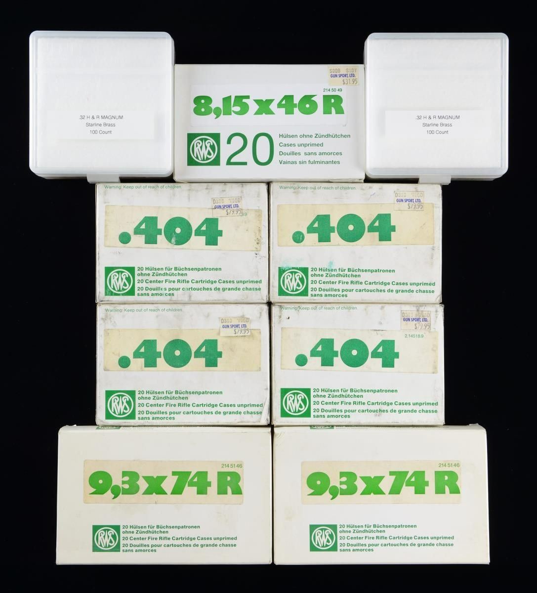 This grouping includes the following: RWS unprimed brass cases - 1 box (20 pcs.) 8.15x46R. / 2 boxes (40 pcs.) 9.3x74R. / 4 boxes (80 pcs.) .404. / Starline unprimed brass cases - 1 box (200 pcs.) 32 H&R Mag. CONDITION: All are in factory packaging, as new. PROVENANCE: the Collection of Gun Sport Ltd owned by Jon R. Thomas. (02-20854-10/JZ) $200-400.