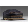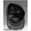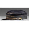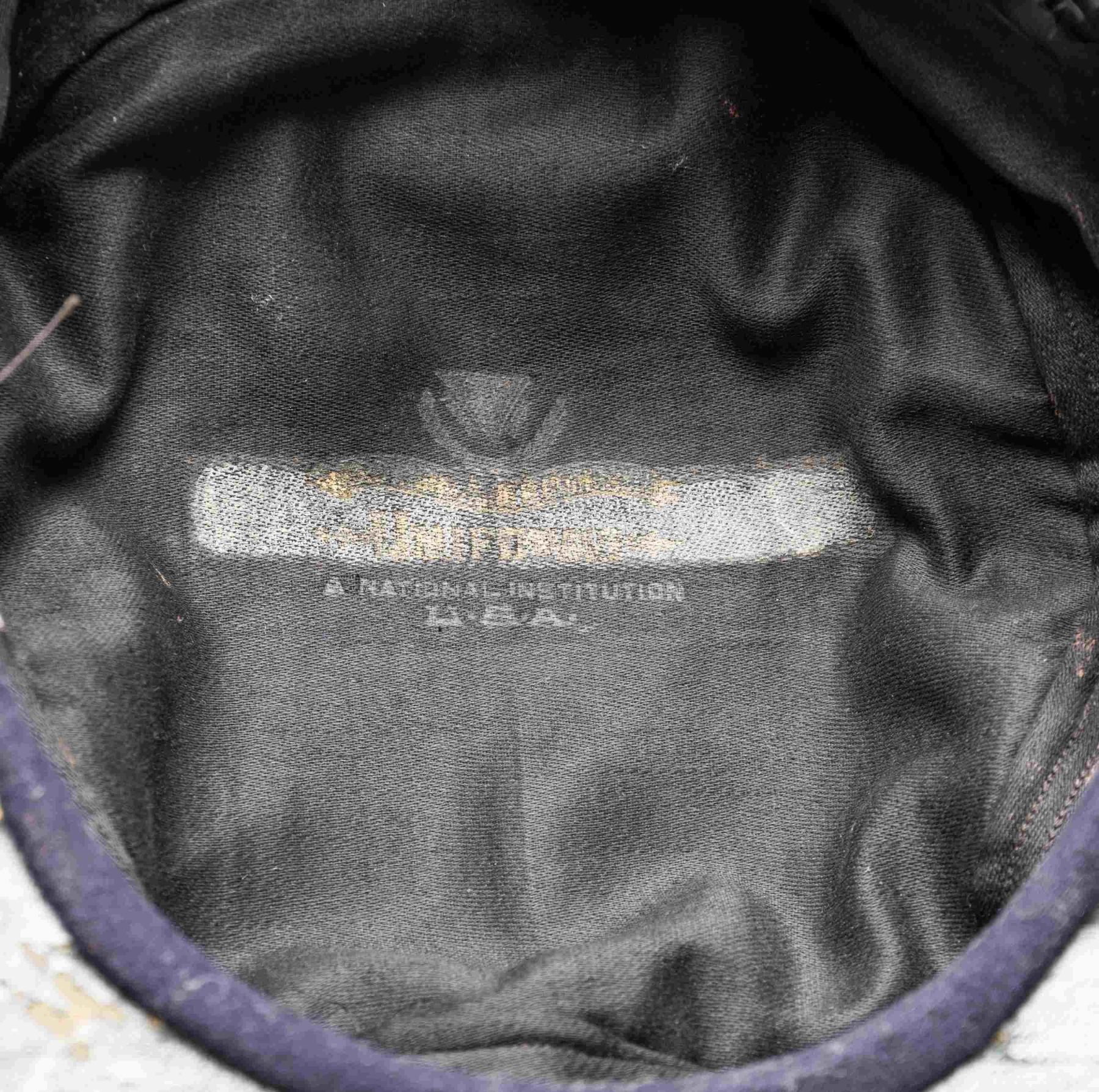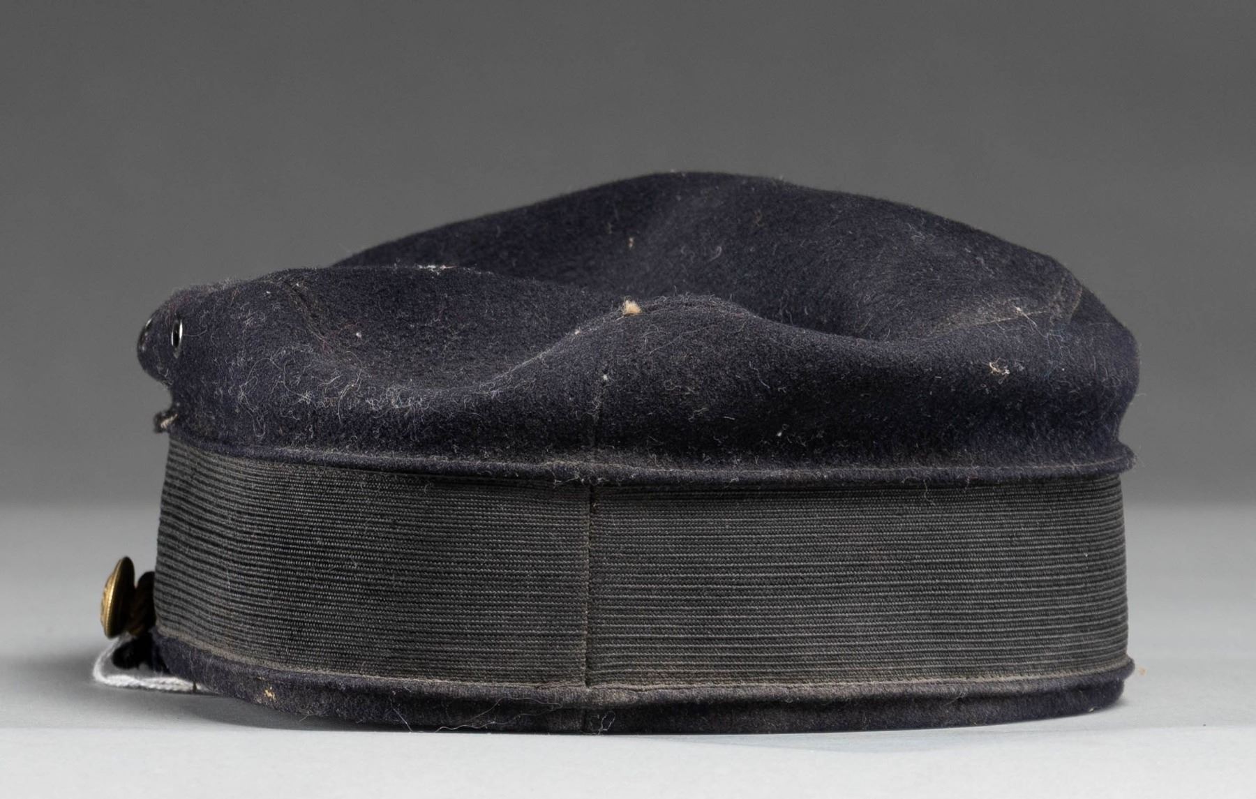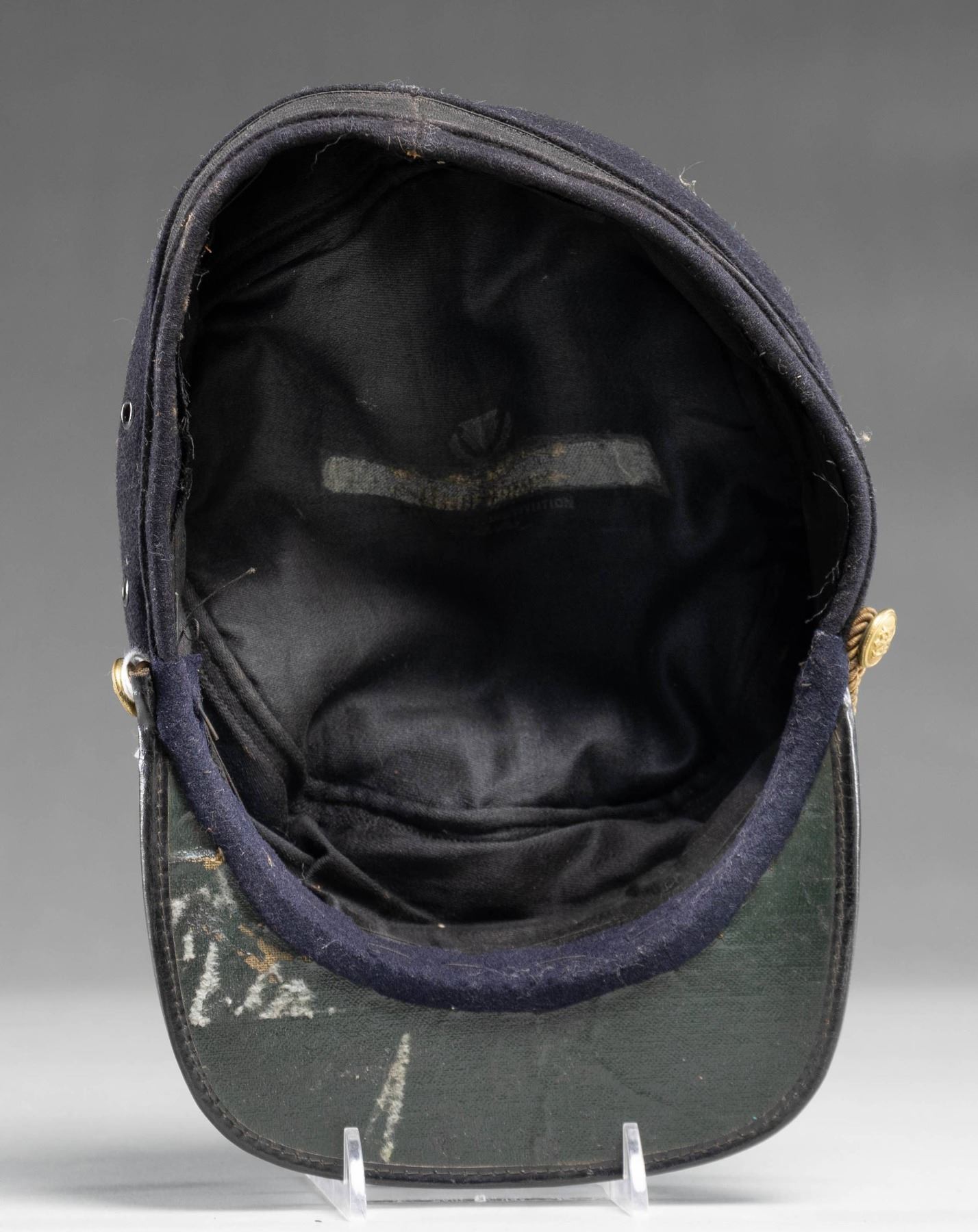 A very interesting circa 1890 black wool hat with gold bullion embroidery on the front that reads " NEW YORK HOSPITAL AMBULANCE SERVICE ". Gold bullion chinstrap with NYS side buttons. There is an interior printed label that has been mostly obscured. CONDITION: light to moderate general wear. (02-24862/BF). $100-200.