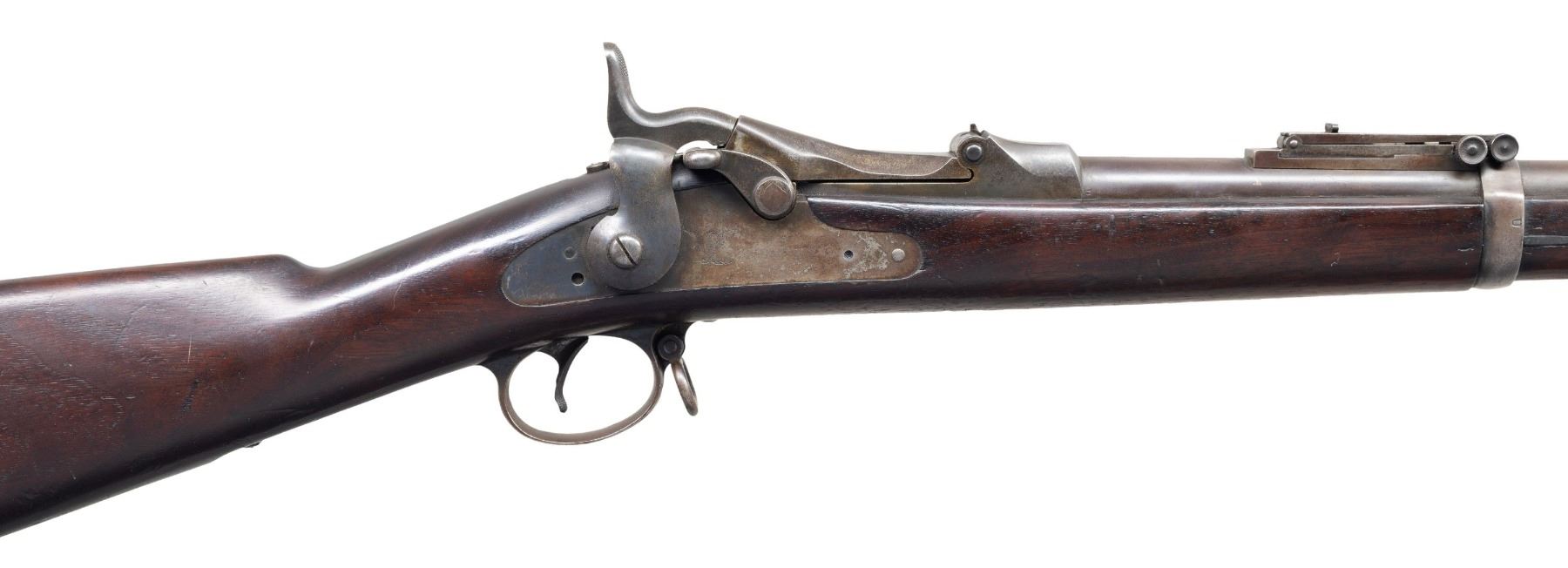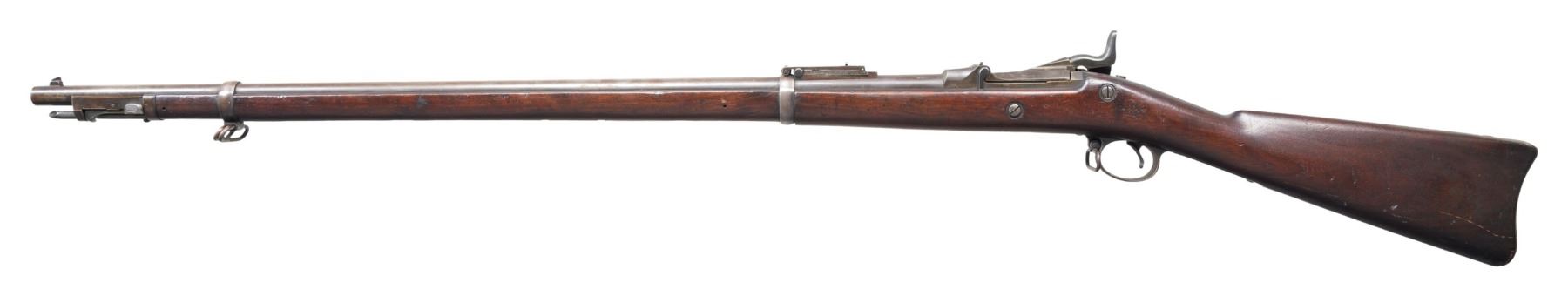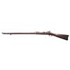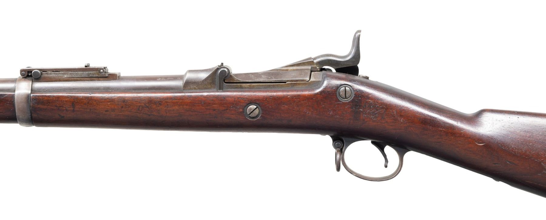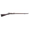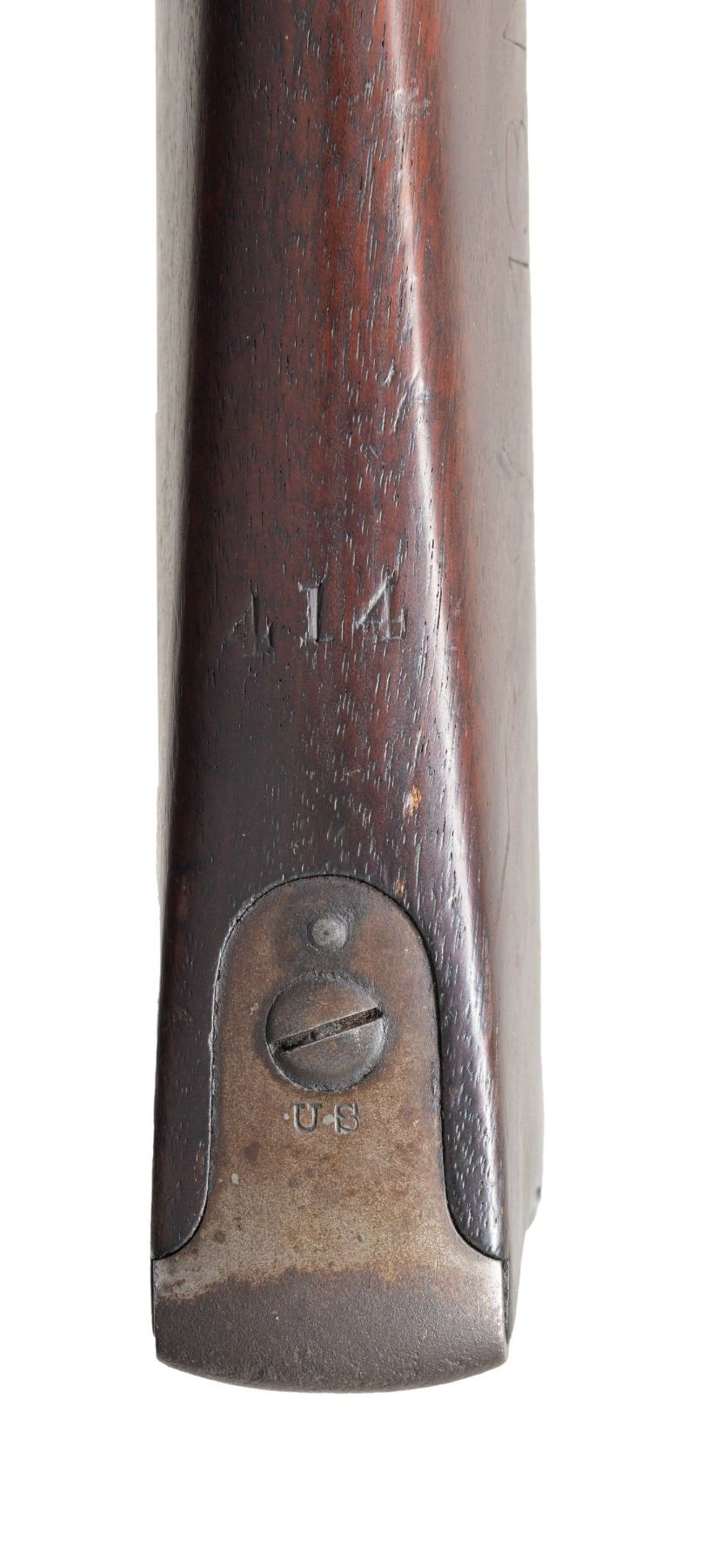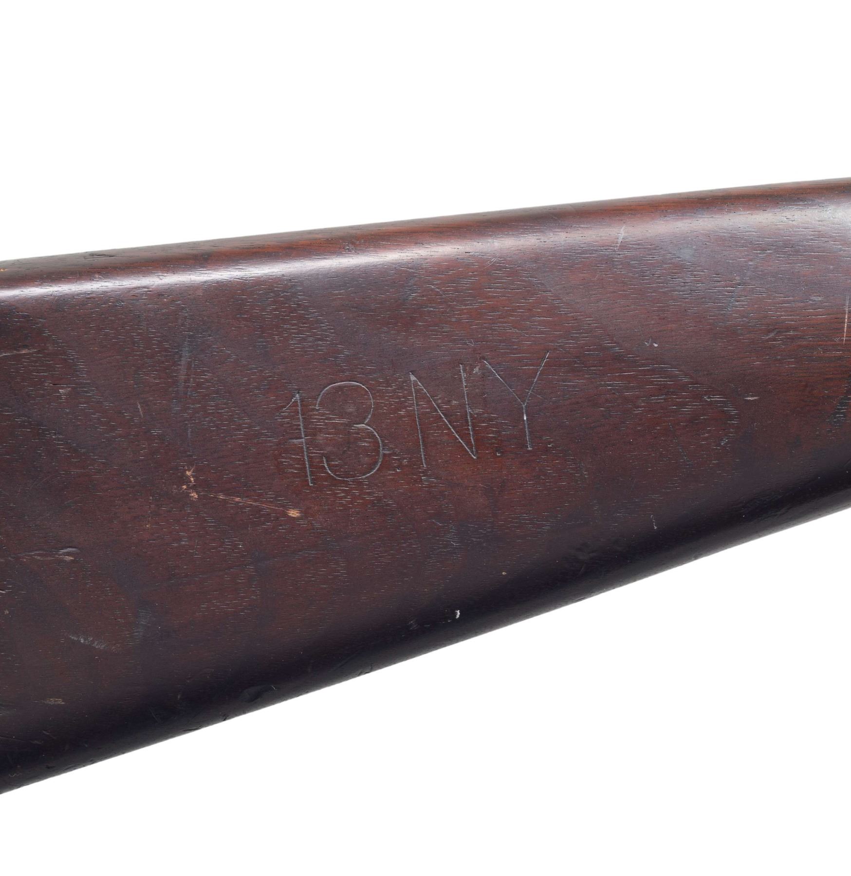 RO-BAYONET TRAPDOOR RIFLE. Cal. 45-70. S# 538381. Right side of buttstock stamped "13 NY" & Comb stamped "414" indicating this rifle was # 414 in the 13th Regiment of the New York State National Guard. Mfg. 1892. Bbl. 32 5/8". Barleycorn front sight & Buffington rear sight. 1884 Dated, low arch breechblock. Walnut musket stock w/ trapdoor buttplate & retractable rod bayonet. CONDITION: iron parts, barrel, breech & lock have gray/brown patina appearance with trace spots of blue. Wood has good worn finish with numerous dings & marks. Good rifling with a couple of large dark spots. (01-27810/MD). ANTIQUE. $500-800.